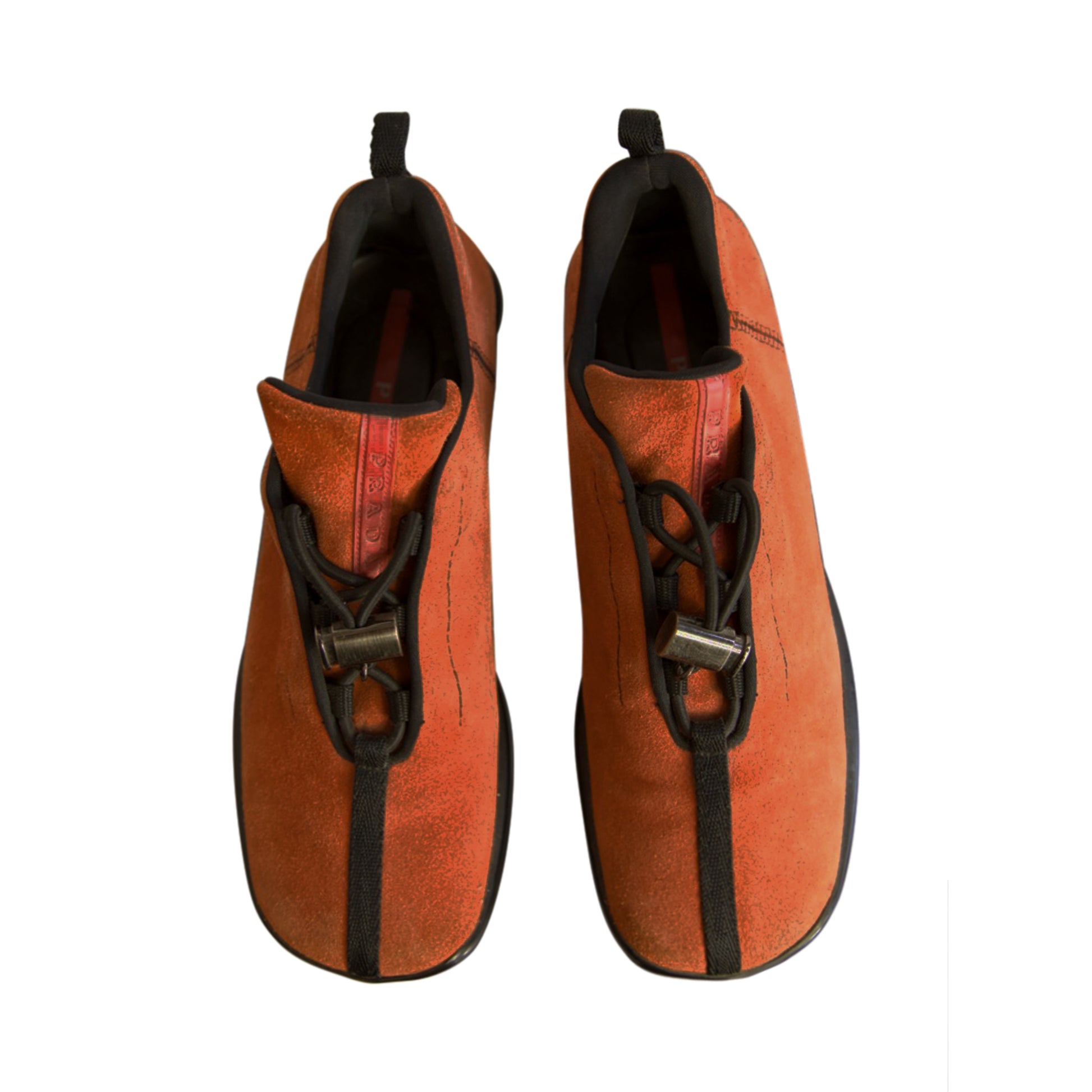 Step into Y2K-era luxury sportswear with these Prada suede trainers, a bold design that merges high fashion with utilitarian edge. Crafted from burnt orange suede with sleek black piping and accents, they feature a unique square-toe silhouette that defined Prada’s experimental footwear designs of the early 2000s.