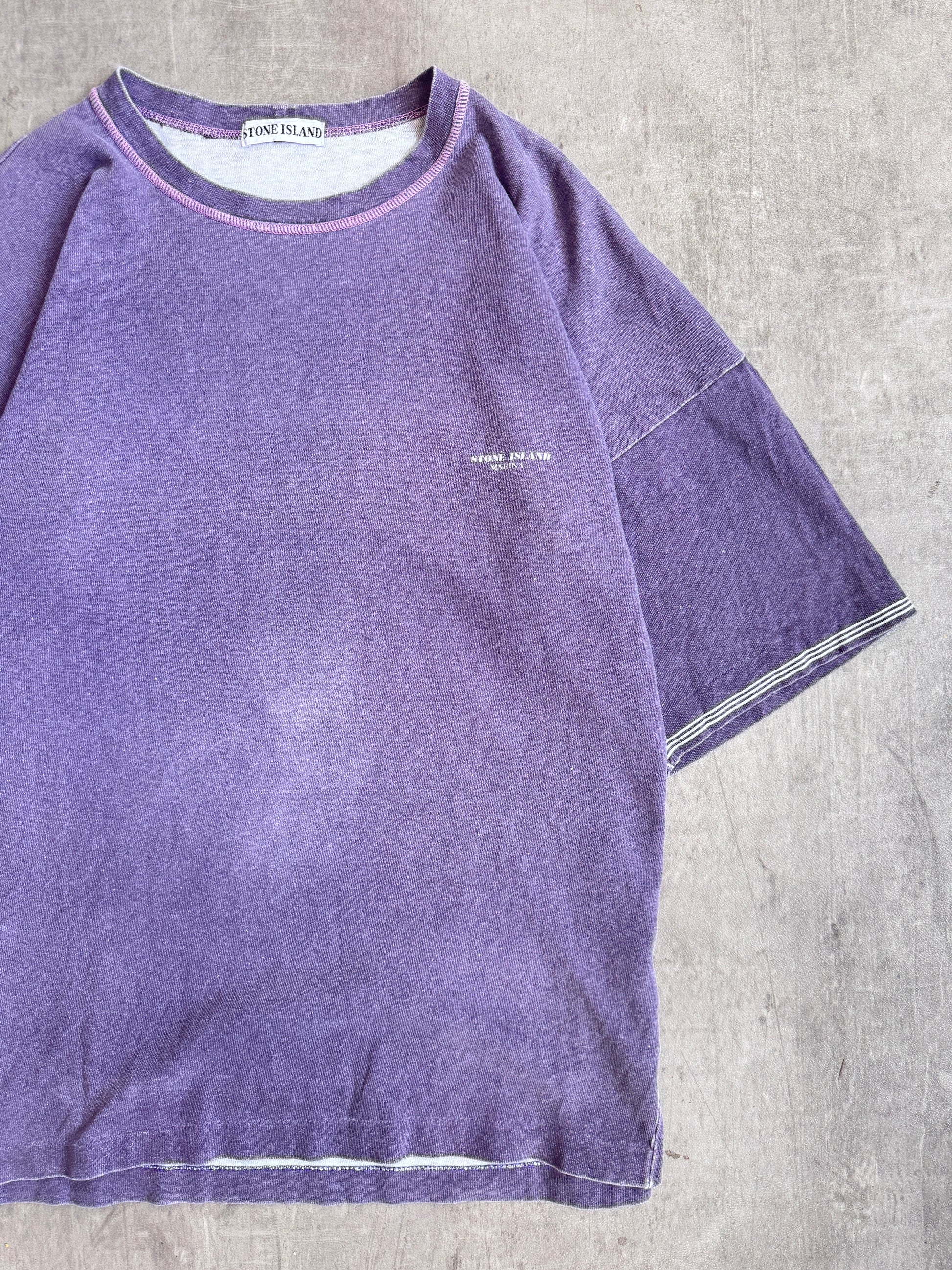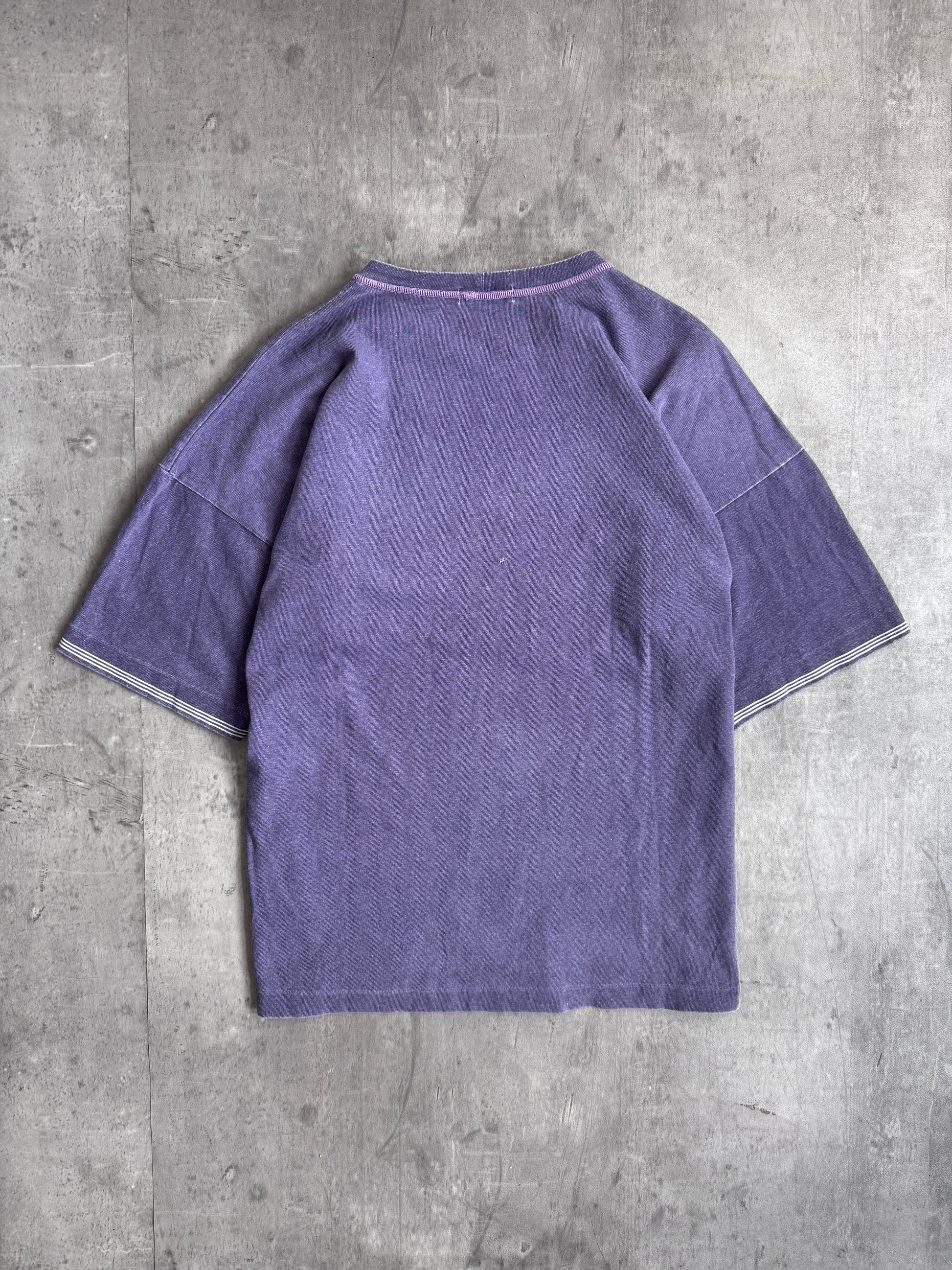 A rare archival piece from the 1980s Stone Island Marina line, this tee represents one of the brand’s earliest and most collectible eras under Massimo Osti. Produced exclusively for the Japanese market, the shirt is crafted from soft cotton with a naturally faded washed purple tone, showcasing decades of wear and character.