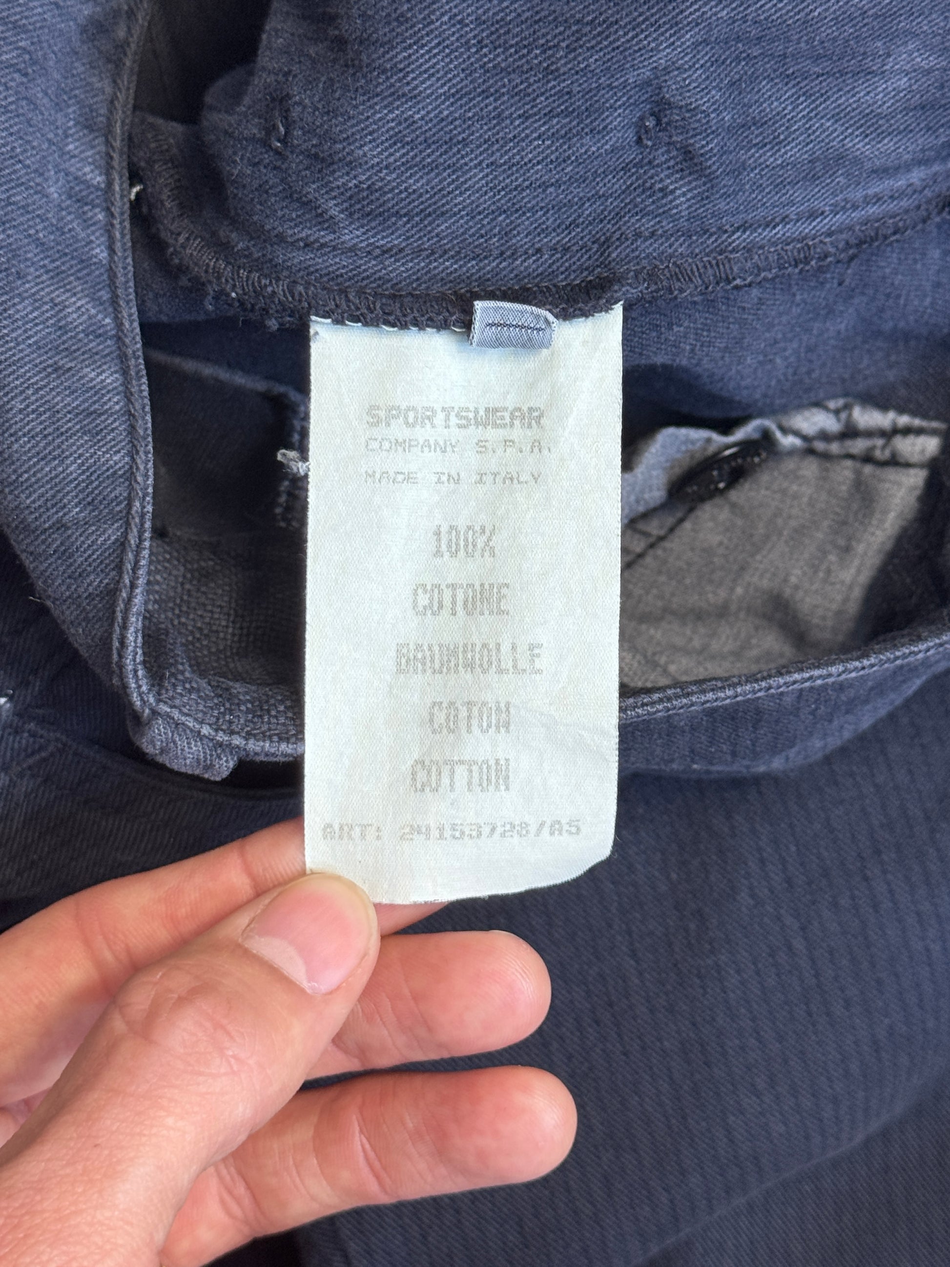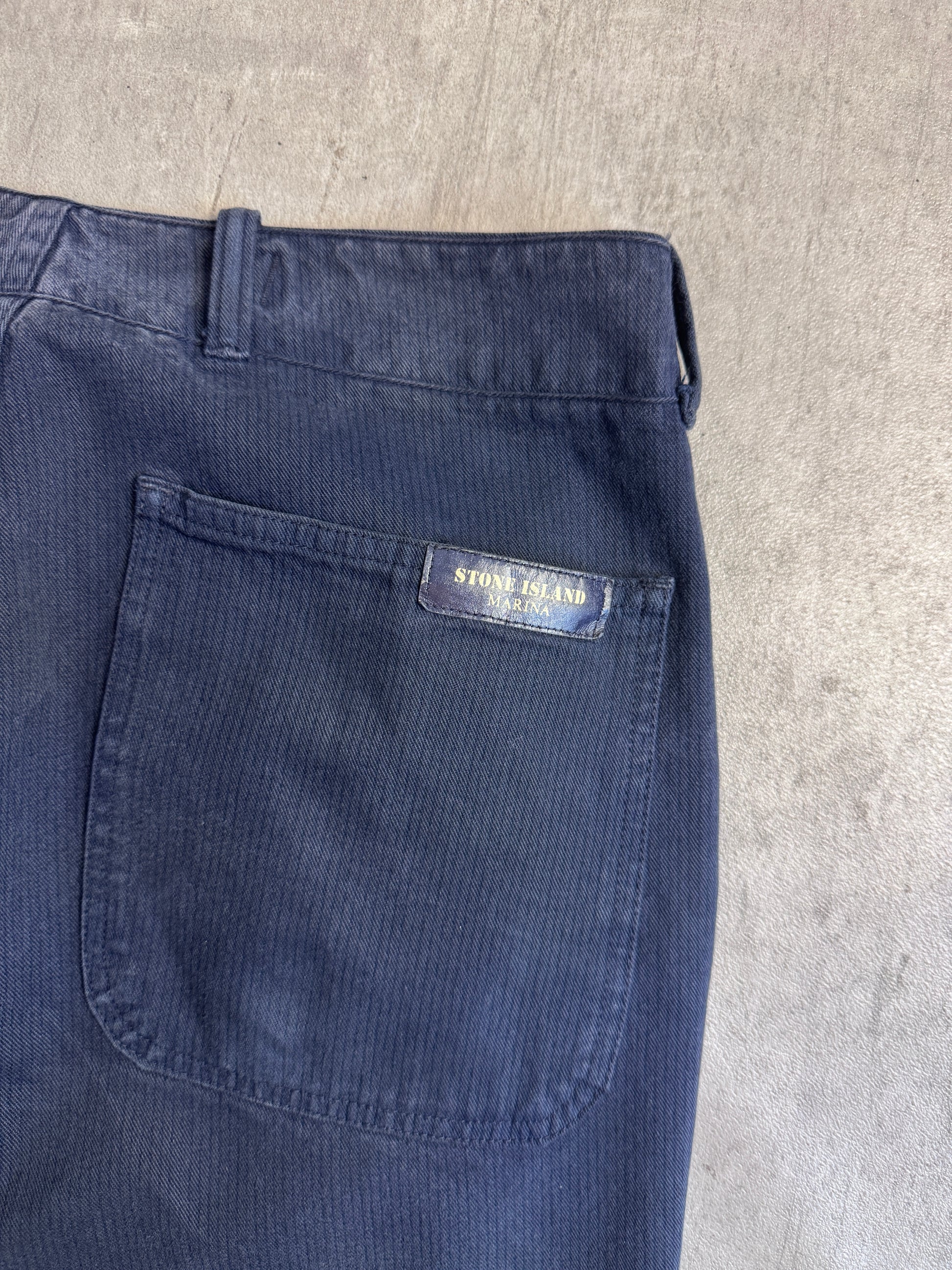 From the 1990s, these Stone Island Marina trousers represent the brand’s experimental tailoring-influenced side, produced under the Marina subline. Constructed in a navy cotton blend, the trousers are detailed with a subtle white pinstripe pattern, blending refined tailoring cues with the sportswear and nautical influences typical of Marina.