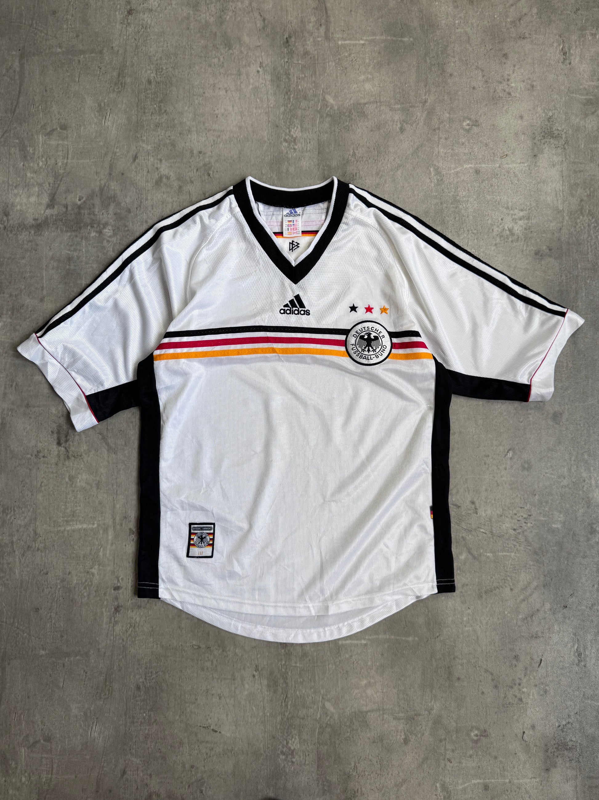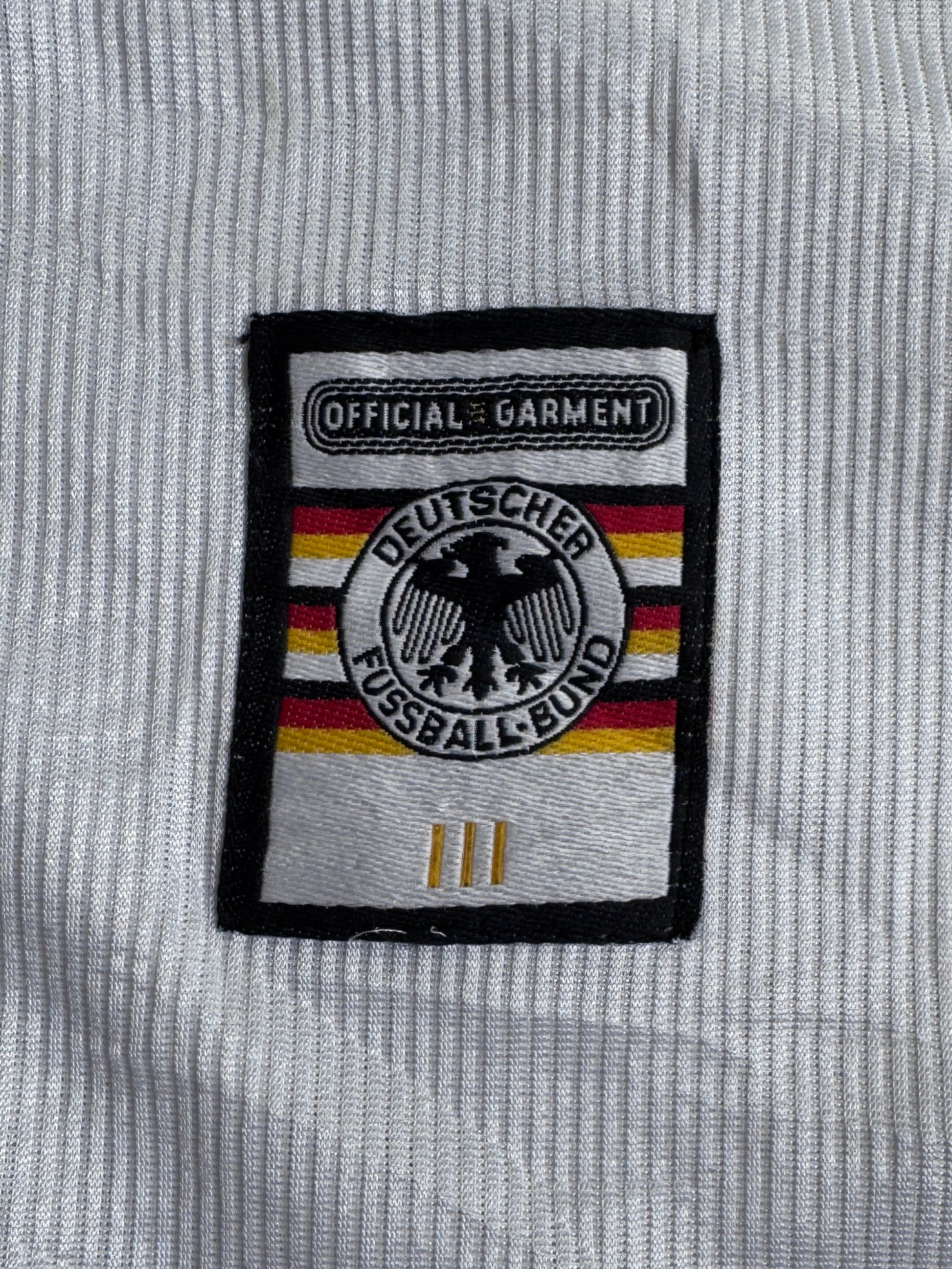An iconic Germany Home Shirt from the 1998 World Cup, produced by Adidas. This jersey captures the golden era of German football, featuring the classic white base with black accents, the tricolor chest stripe in black, red, and gold, and the three stars embroidered above the crest — representing Germany’s World Cup triumphs up to that point. A must-have piece for vintage football collectors.
