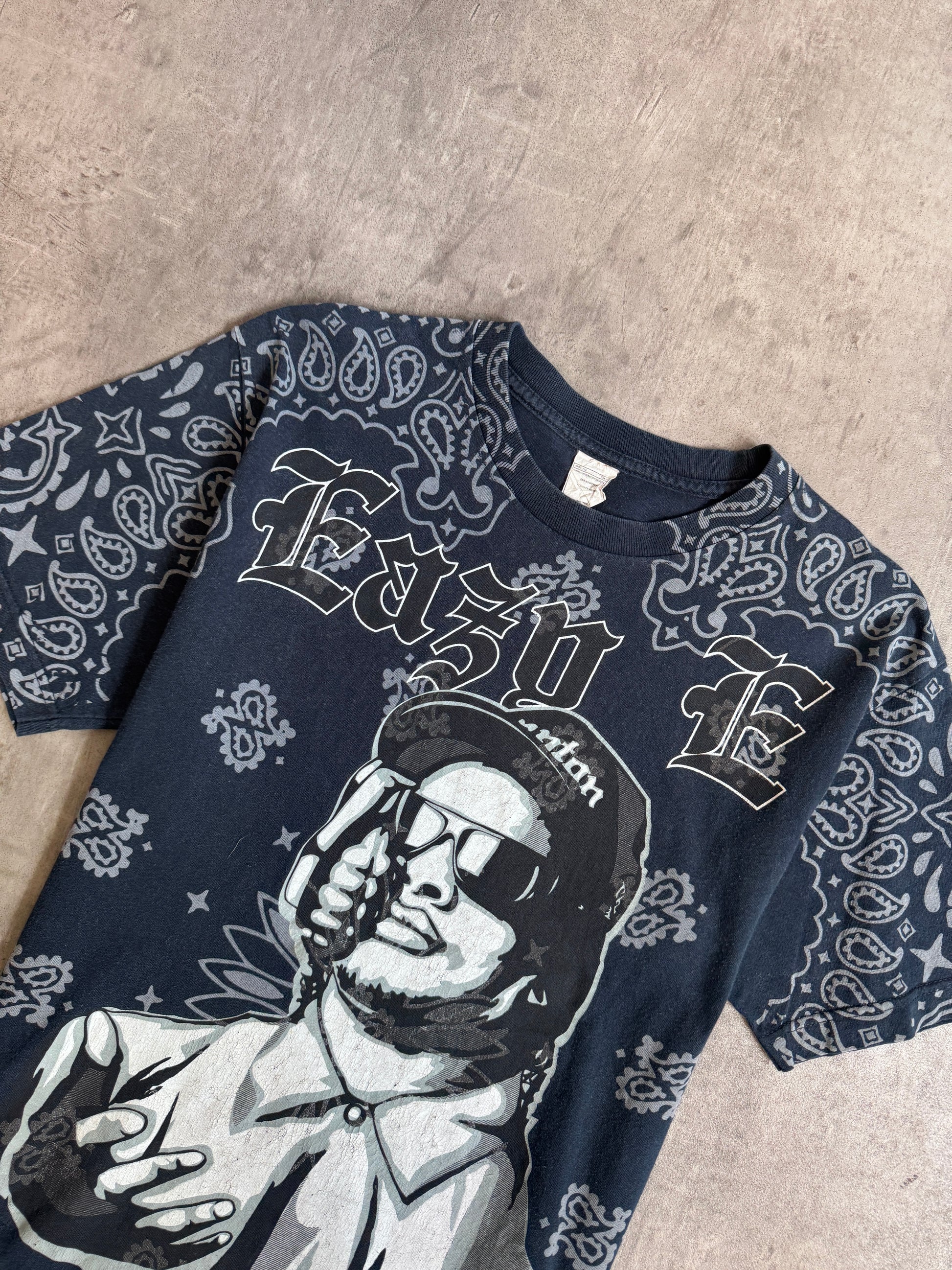 A rare early-2000s hip-hop graphic tee, this piece pays tribute to Eazy-E, N.W.A, and the legacy of Ruthless Records through a bold allover grenade print design. Capturing the raw energy of West Coast rap culture, it stands as a strong statement piece with authentic vintage appeal.