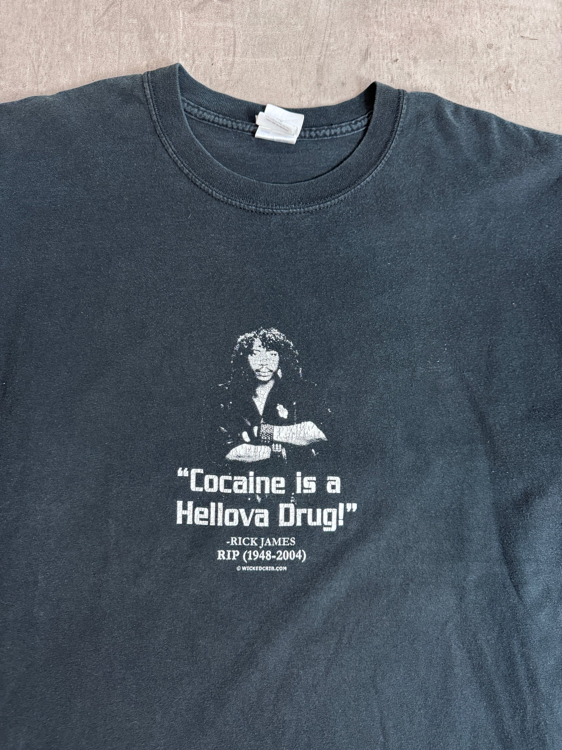 Celebrate music history and vintage style with the 2004 Rick James Black Graphic Tee, a rare collector’s item for fans of the funk legend. Featuring a bold Rick James graphic print on a classic black tee, this shirt combines pop culture nostalgia with casual streetwear appeal.