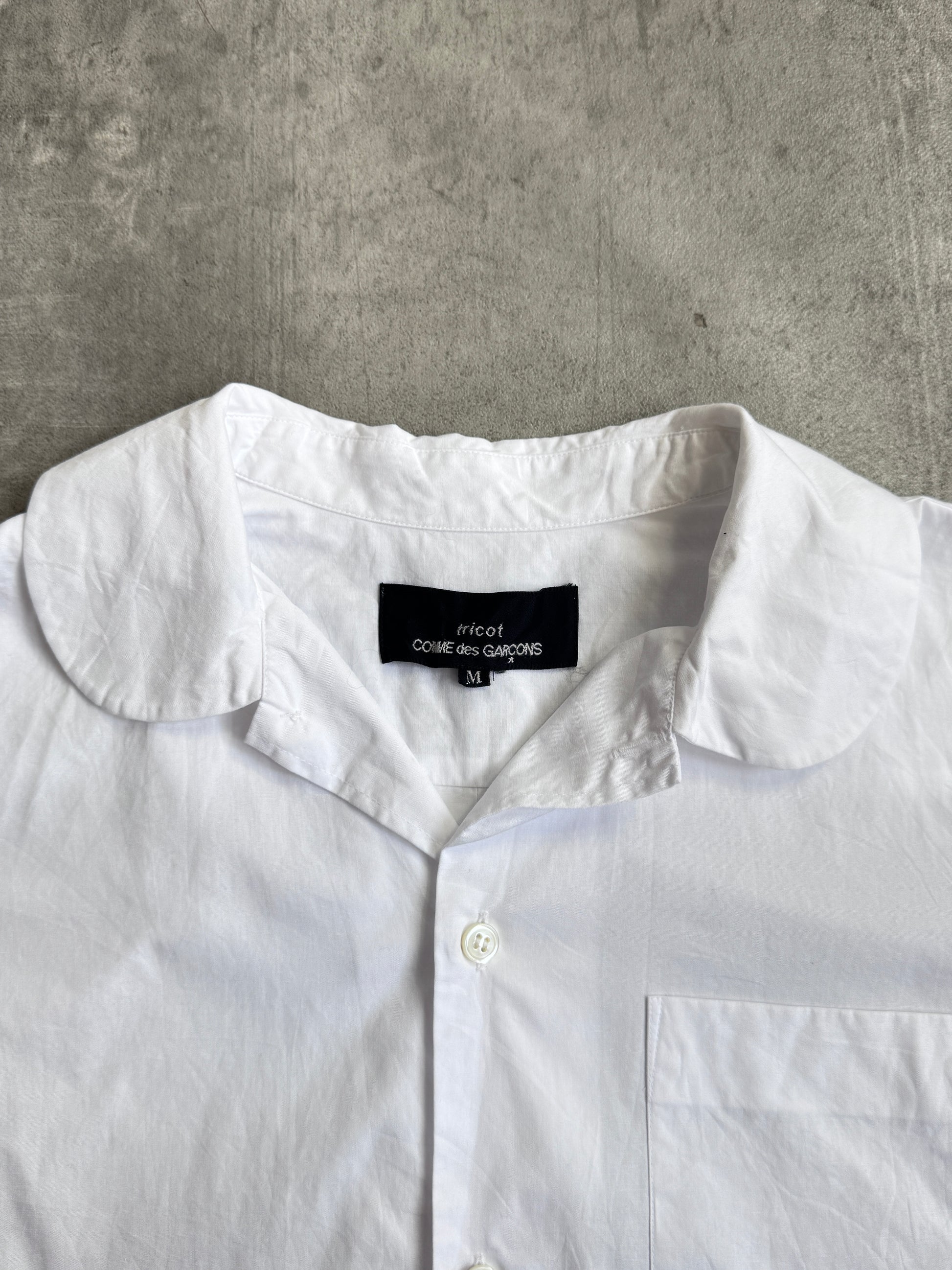 Elevate your wardrobe with the 2017 Comme des Garçons Tricot White Poplin Cotton Shirt, a timeless piece that fuses minimalist design with luxury craftsmanship. Made from premium white poplin cotton, this shirt offers a crisp, breathable feel and a tailored fit for effortless sophistication.