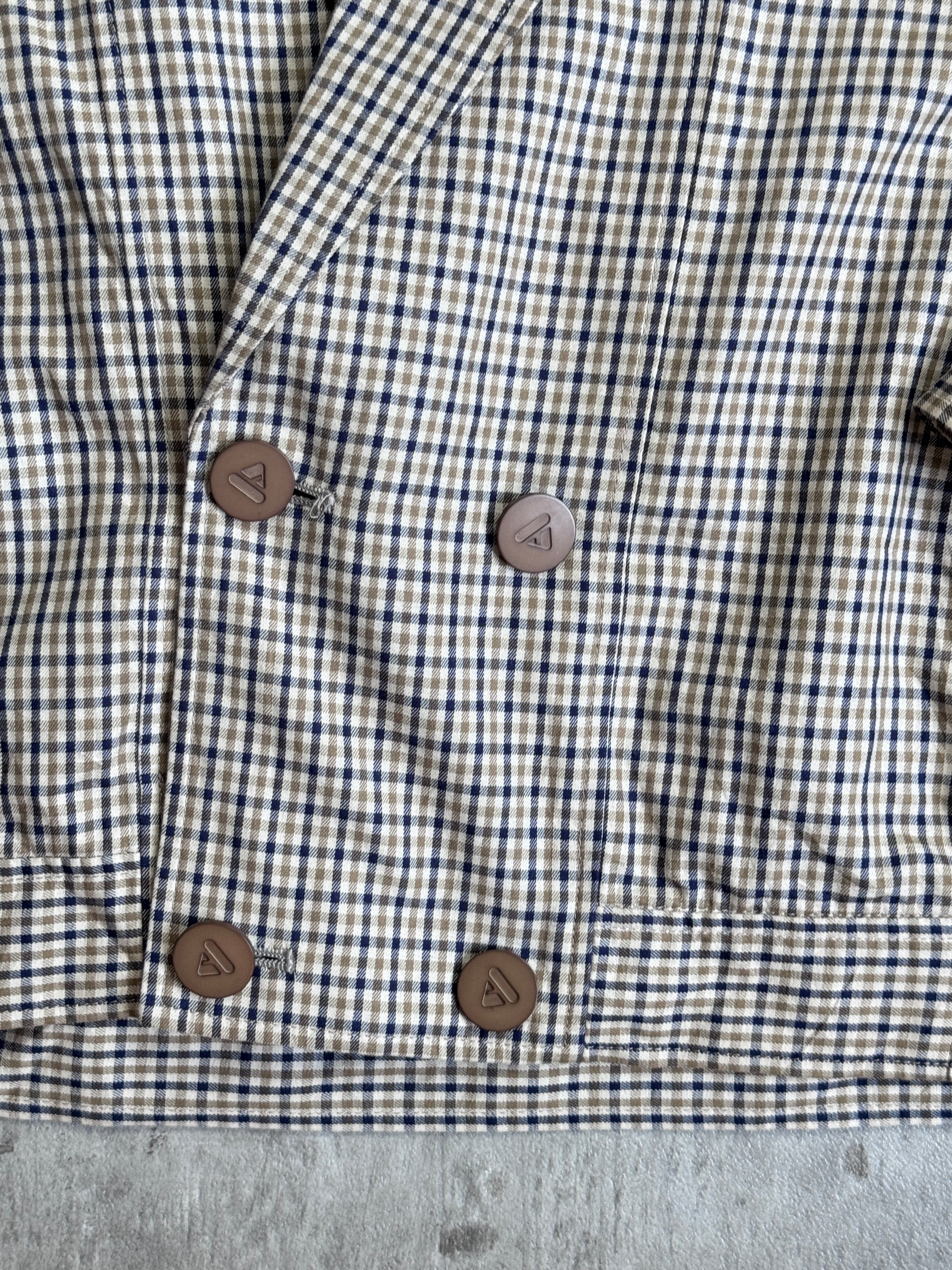 Featuring a double-breasted front, notched collar, and the iconic Aquascutum check pattern, this piece captures the brand’s effortless combination of heritage and functionality. Finished with button cuffs and a cropped hem for a relaxed yet structured fit.