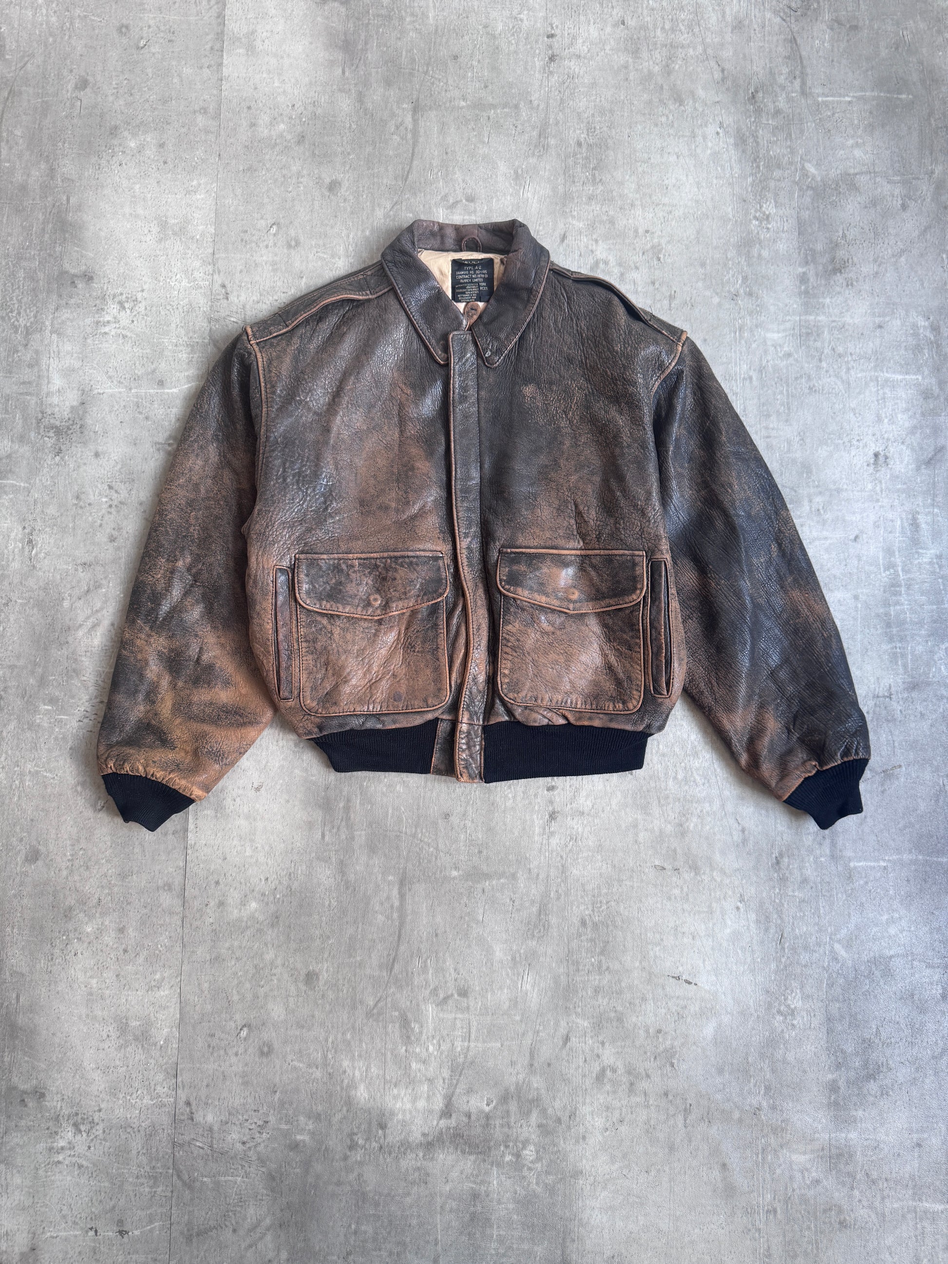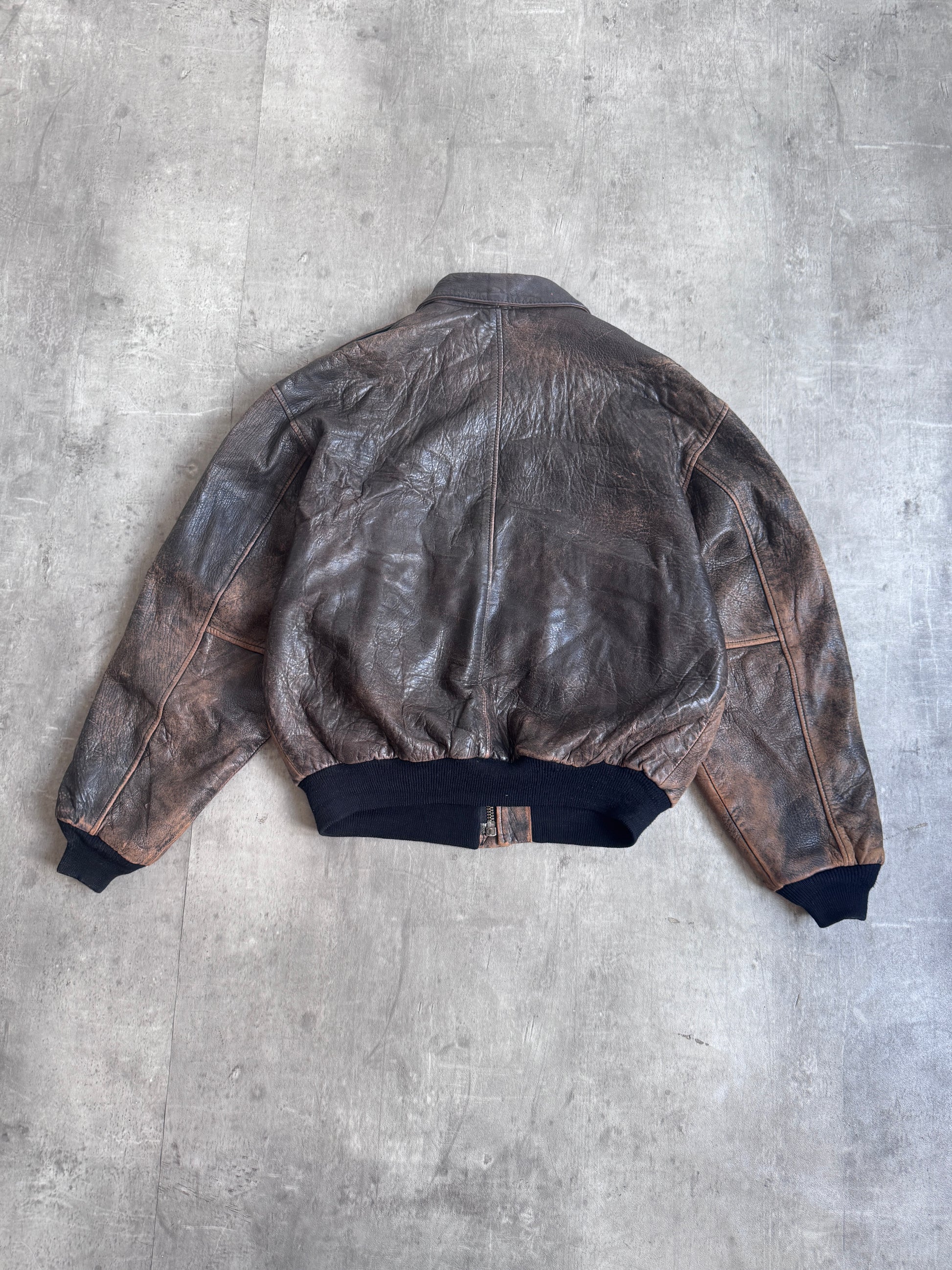 A vintage classic from the American aviation-inspired label Avirex, this Brown Distressed Leather Jacket captures the rugged essence of 1980s and 1990s outerwear. Constructed from heavyweight leather with a naturally aged patina, the jacket features a timeless bomber silhouette with two large flap front pockets, a ribbed hem and cuffs, and a classic pointed collar.