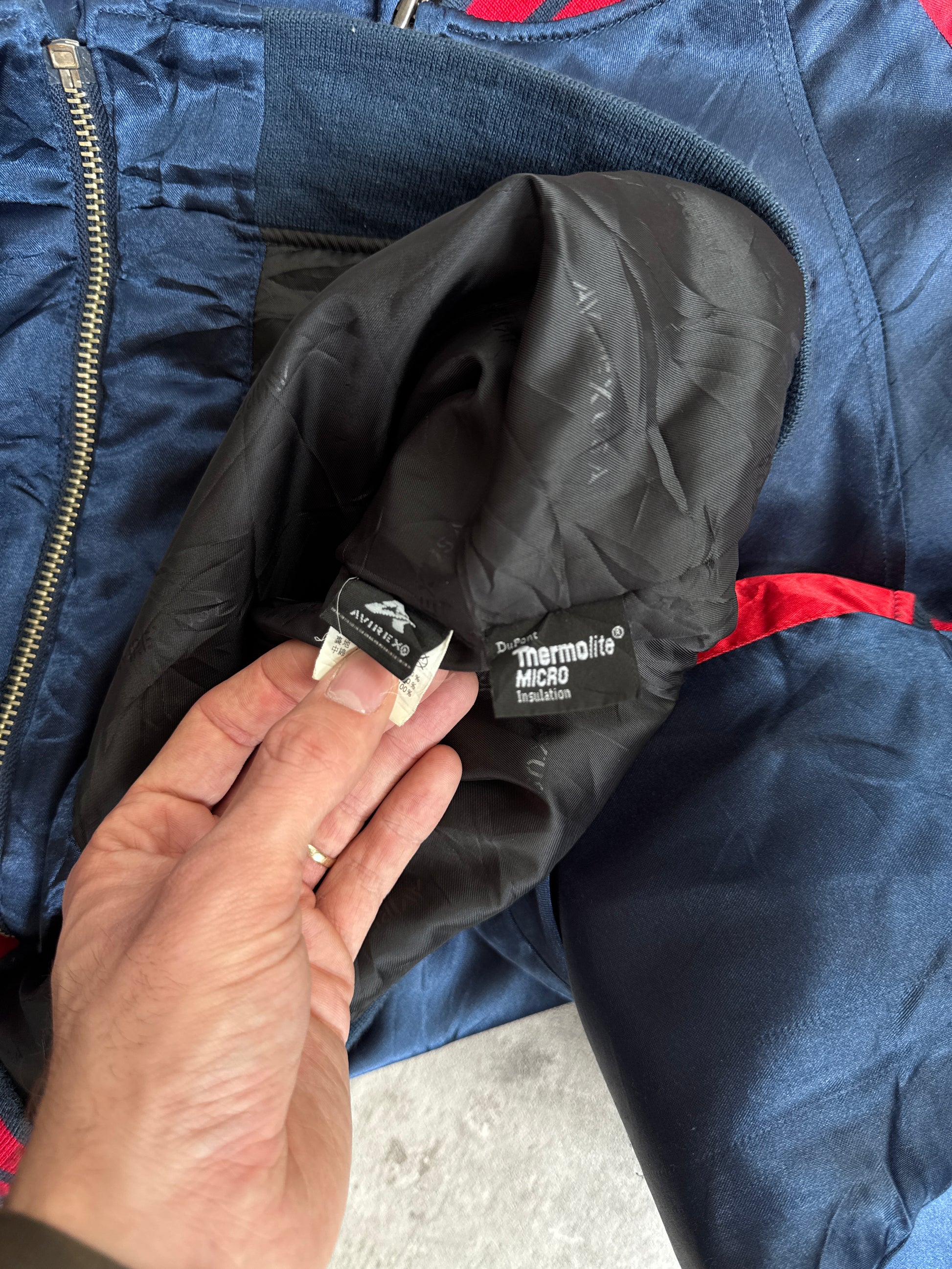 The front showcases an oversized embroidered Avirex logo, while the ribbed collar, cuffs, and hem complete the authentic varsity silhouette. A true classic from the golden age of streetwear and aviation-inspired design.