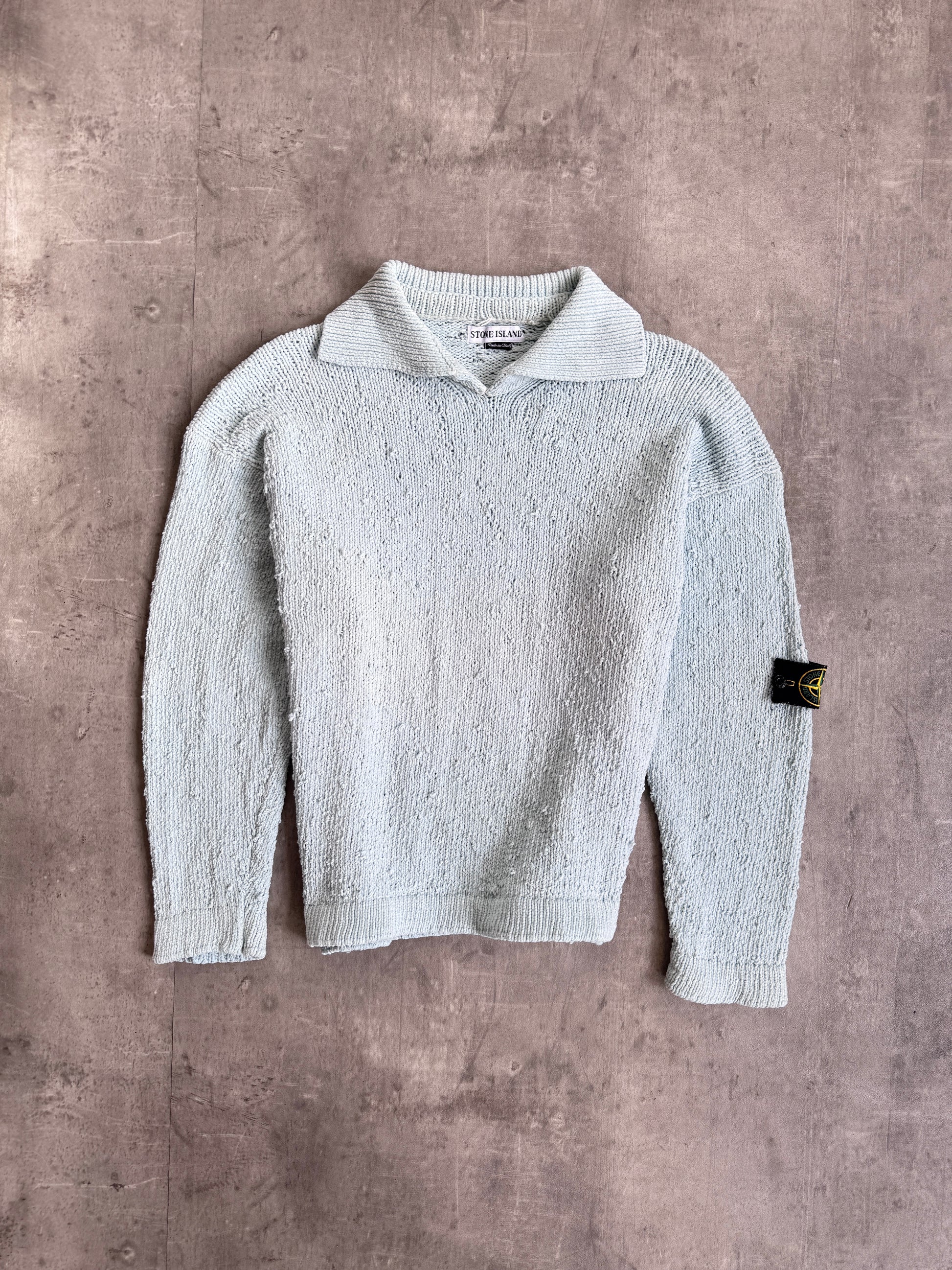 From Stone Island’s early archive, this rare A/W 1984 chenille knit embodies the brand’s pioneering approach to textile innovation. Crafted in a soft baby blue hue, the piece is constructed from a chenille-effect cotton blend, giving it a distinctive textured hand-feel and luxurious weight. The open collar design nods to maritime influences, while the signature compass patch on the sleeve cements its place in Stone Island’s heritage of functional luxury.
