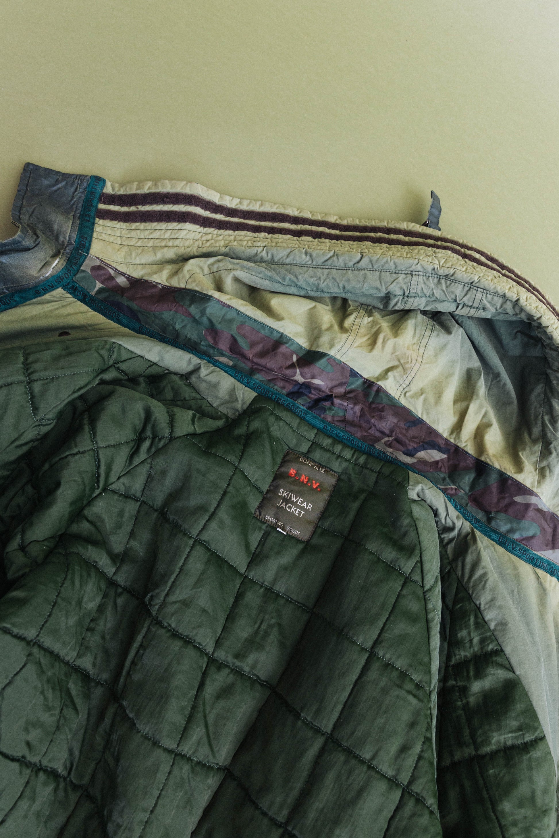 The piece showcases Boneville’s ski-inspired functionality, including a high funnel neck with snap fastening, full front zip with storm flap, and angled utility pockets for practical use on and off the slopes. The padded construction gives the jacket a structured, protective silhouette, while subtle fading in the green shell reflects the beautifully aged character of vintage Boneville outerwear.
