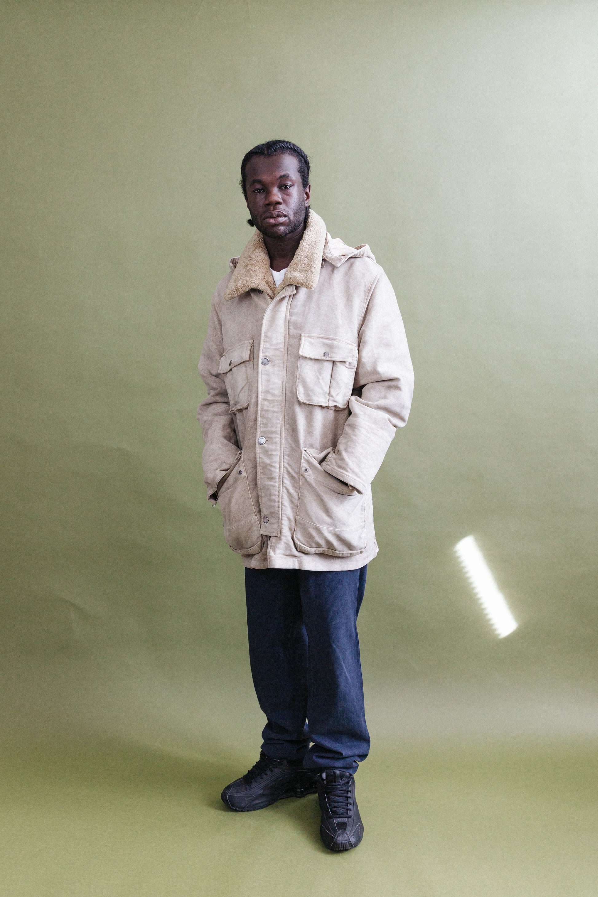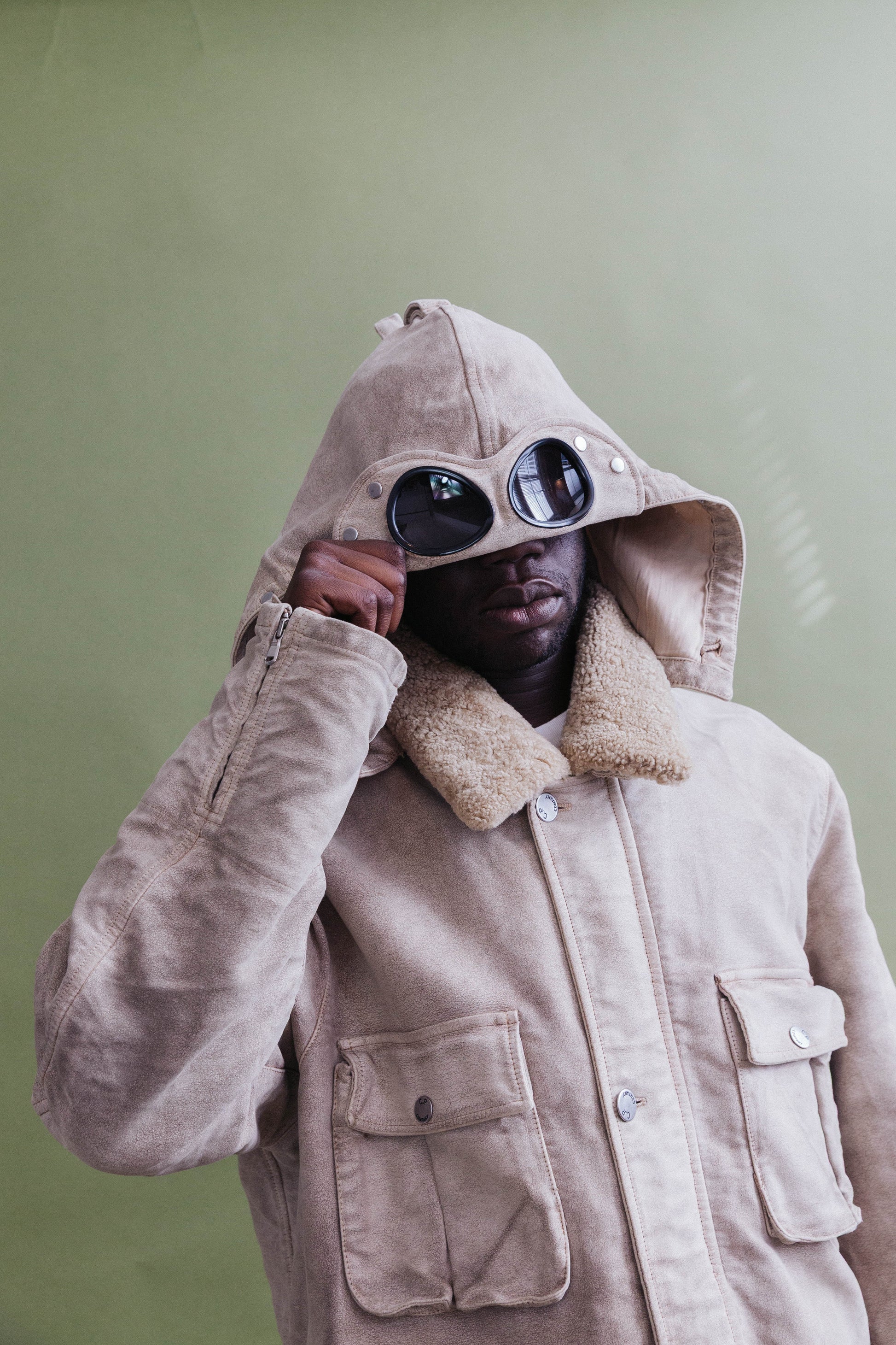 The design is detailed with a full-length zip and button placket, spacious utility pockets, adjustable cuffs, and a protective hood, balancing functionality with timeless utilitarian style.