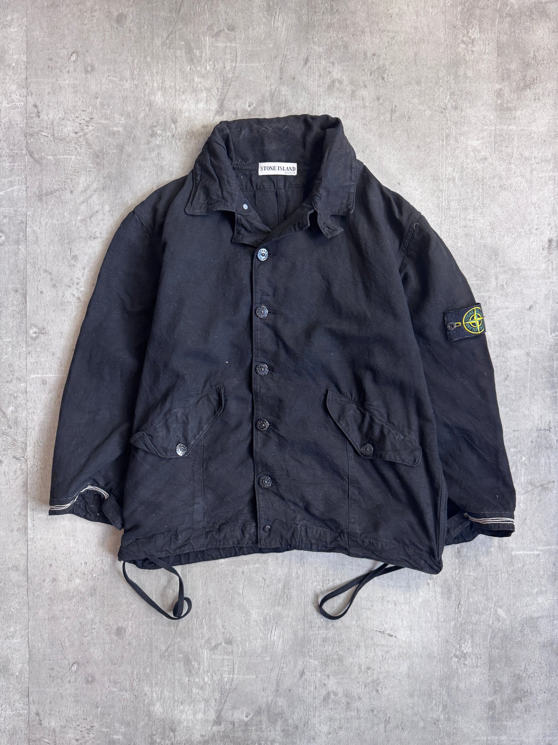 From the Autumn/Winter 2003 collection, this Stone Island jacket is crafted from heavy compact-woven cotton, a dense and durable fabric developed to withstand wear while retaining a structured silhouette. Finished with the brand’s signature garment dyeing process, the jacket presents a deep, saturated black tone with subtle texture. Designed with utility in mind, it features a full front zip with button storm flap, multiple front pockets, and adjustable cuffs and hem. The removable Stone Island compass badge at the sleeve completes the piece, marking it as part of the brand’s iconic early-2000s archive.