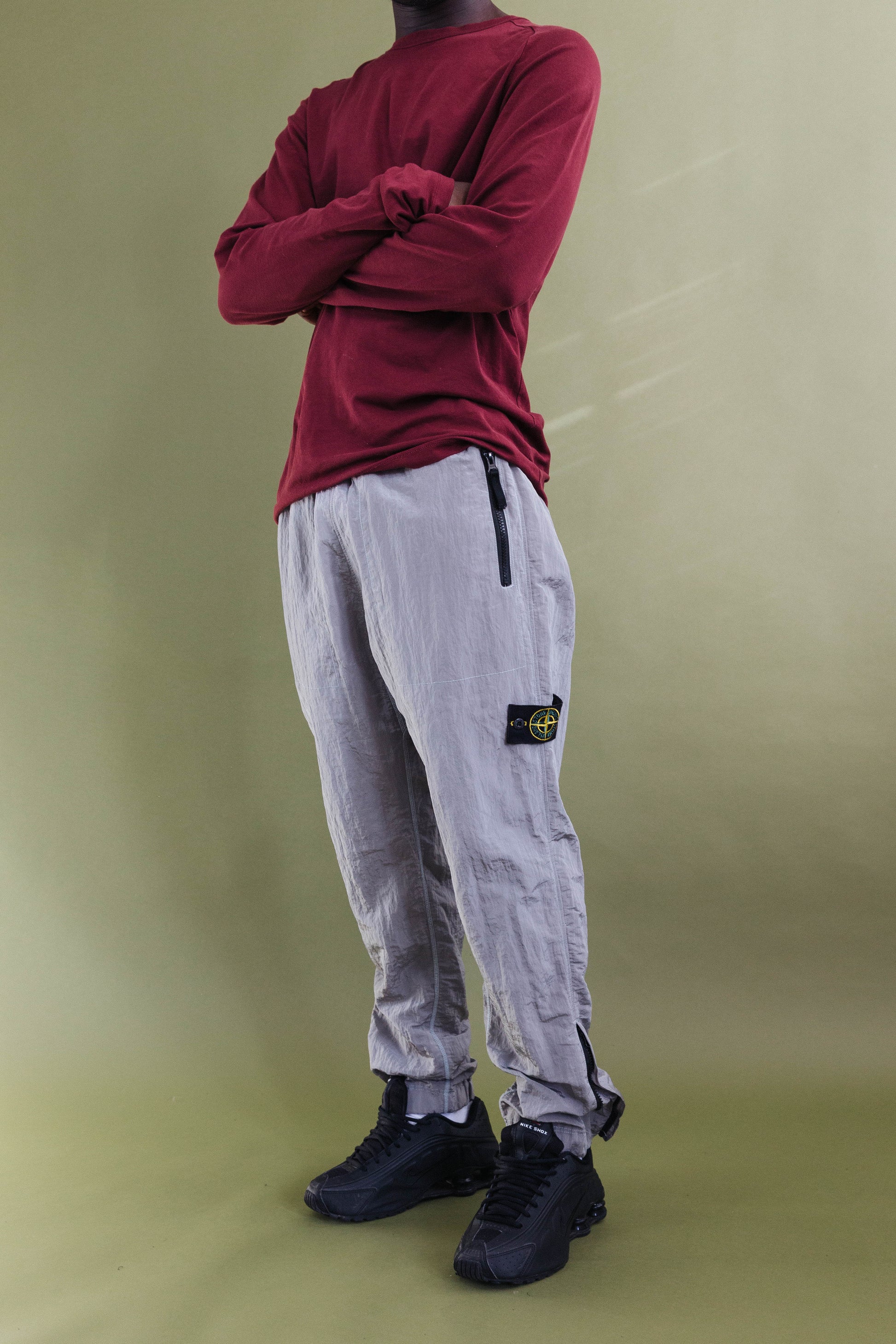 From the Autumn/Winter 2018 collection, these Stone Island trousers are crafted from the brand’s signature Nylon Metal fabric—a material woven from trilobate nylon and polyester fibres, garment-dyed to achieve a distinctive iridescent metallic sheen. The result is a pair of trousers with subtle tonal shifts that change with movement and light, a hallmark of Stone Island’s fabric innovation.