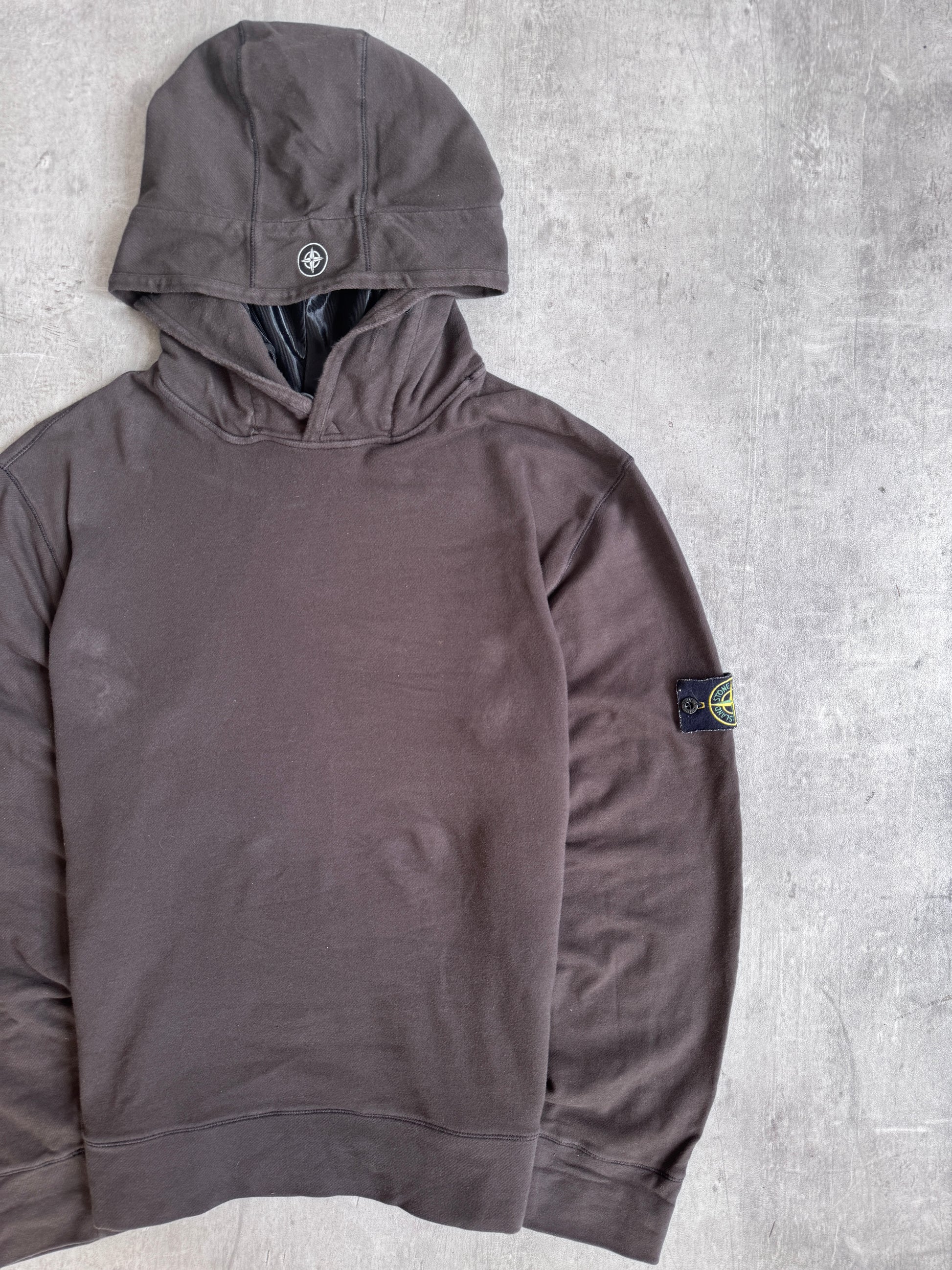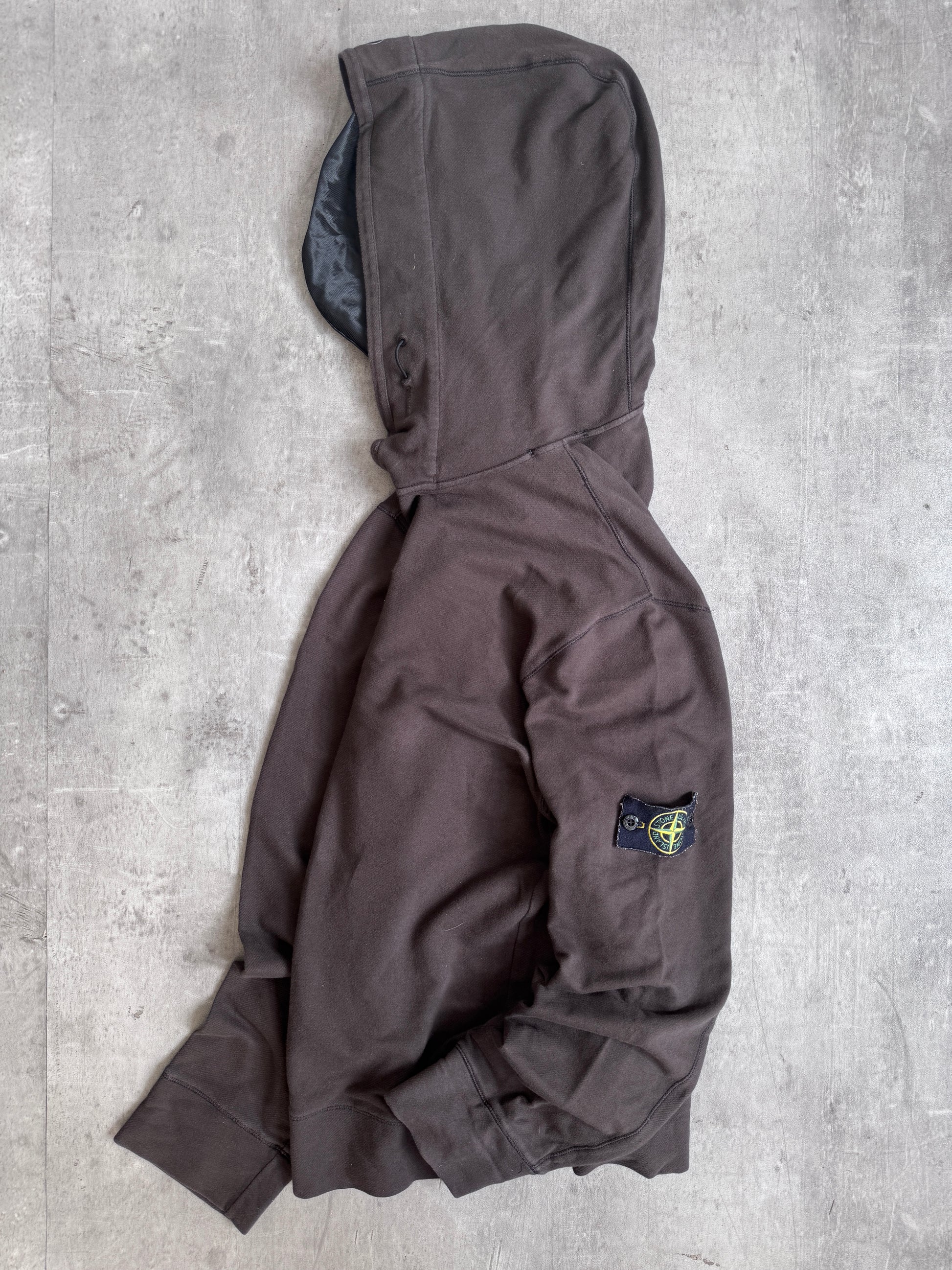 The standout feature — a built-in mesh face mask integrated into the hood — exemplifies the brand’s forward-thinking fusion of function and concept. Presented in a rich washed brown hue, the hoodie features a kangaroo pocket, ribbed trims, and the detachable compass badge on the sleeve. The piece embodies both technical craftsmanship and subcultural identity, a hallmark of Stone Island’s mid-2000s archive.