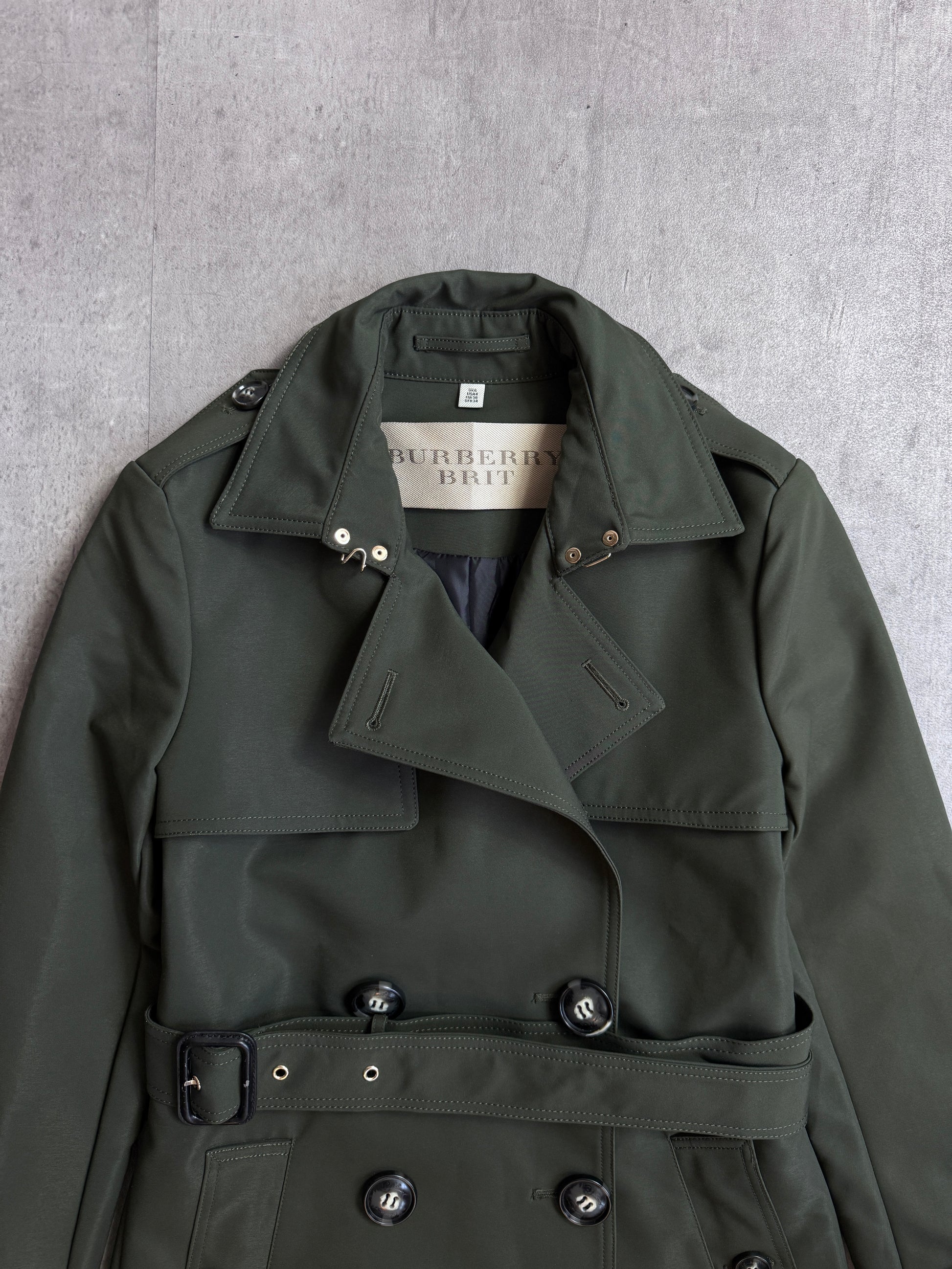 Designed with classic trench details — including a storm flap, waist belt, epaulettes, and double-breasted button closure — this piece captures the refined functionality that defines Burberry’s legacy. Its deep khaki tone and traditional Burberry Brit label lend it enduring appeal for both modern and classic wardrobes.