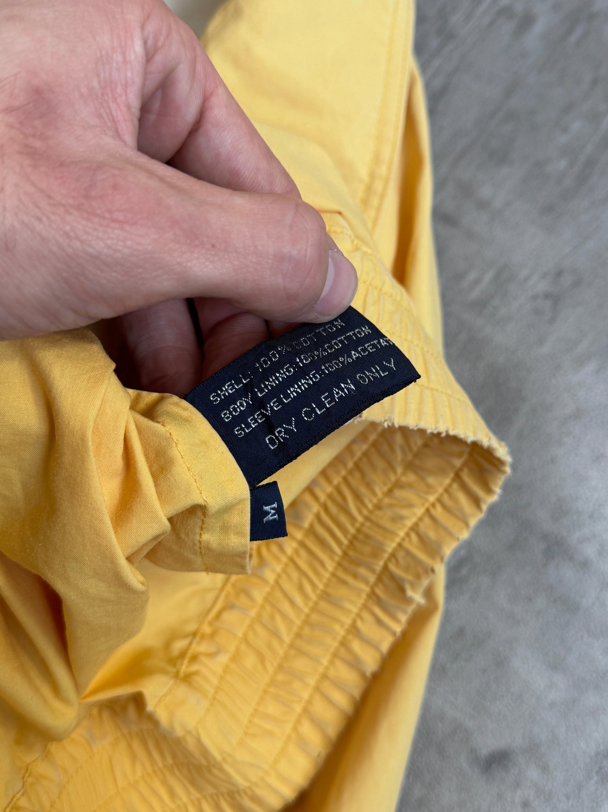 This Burberry Mustard Zip Up Harrington Jacket embodies the label’s classic British outerwear sensibility, reimagined with bold 1990s-era colour and clean modern lines. Crafted from a lightweight cotton-blend shell, the jacket features a distinctive mustard yellow tone that brings contemporary energy to a timeless silhouette.
