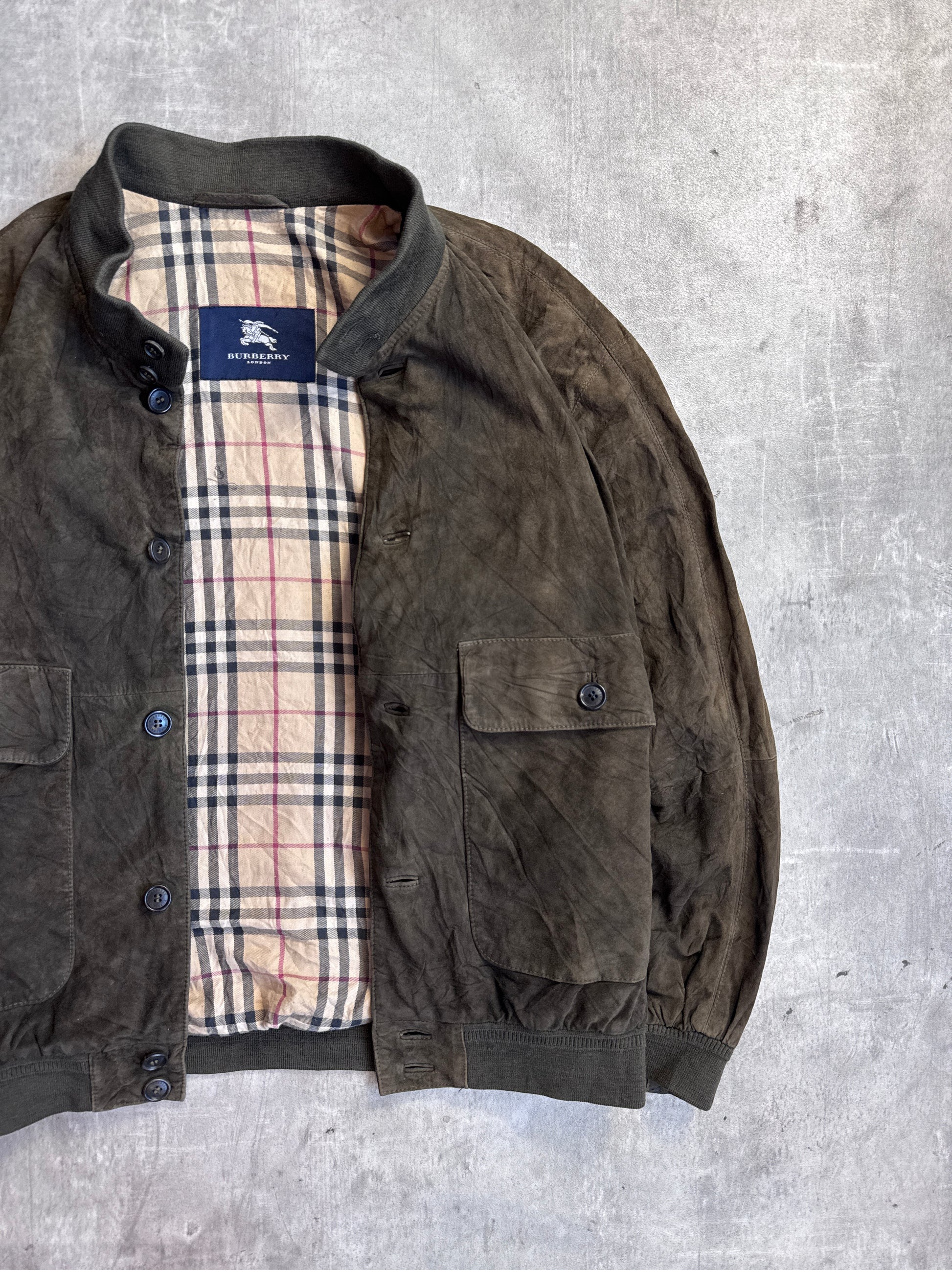 A luxurious take on a streetwear staple, this Burberry Olive Velour Button Down Bomber Jacket combines the brand’s refined British tailoring with a plush velour construction. The soft olive-green fabric creates a rich texture and depth, balanced by a structured silhouette and premium detailing throughout.