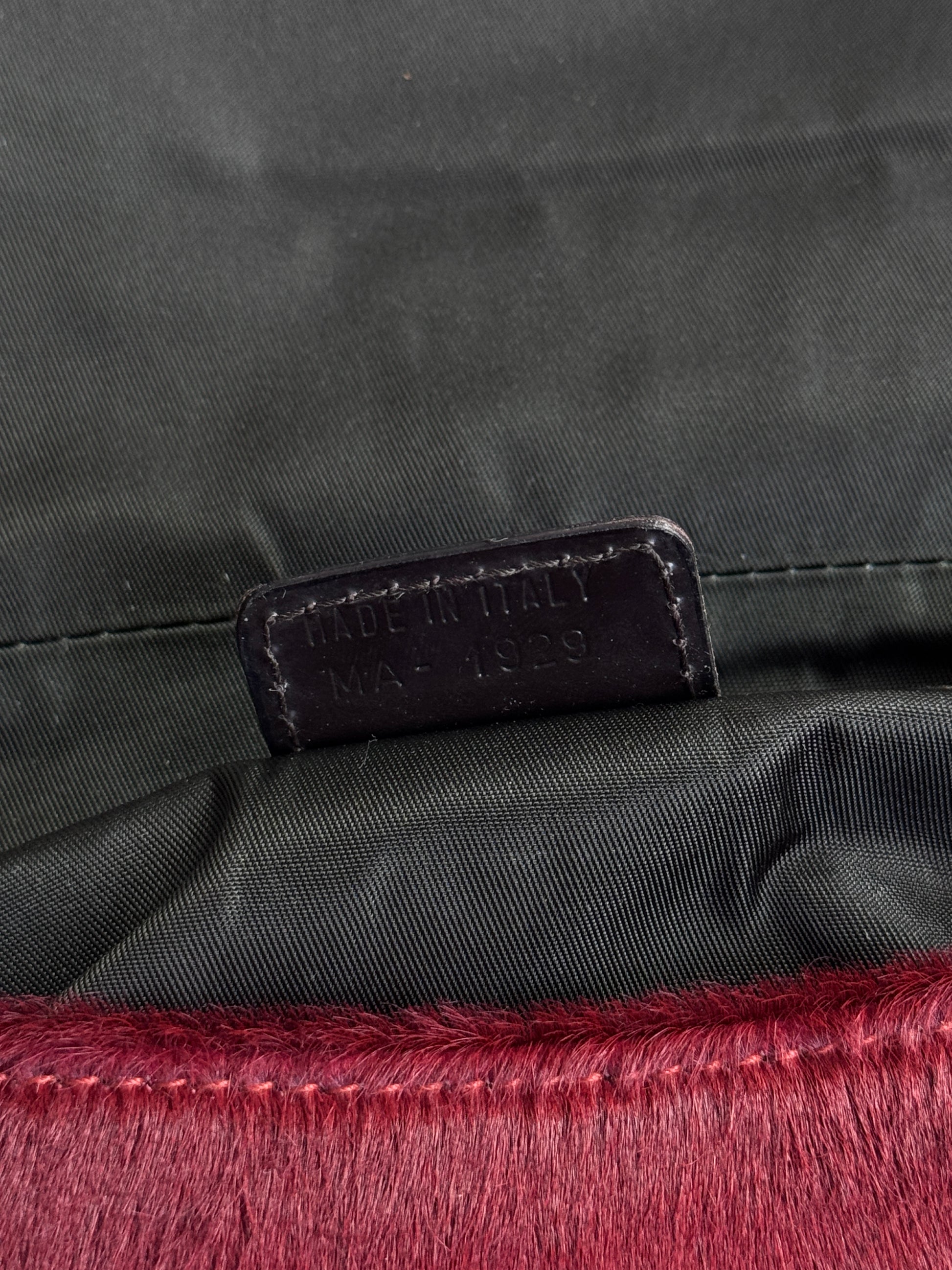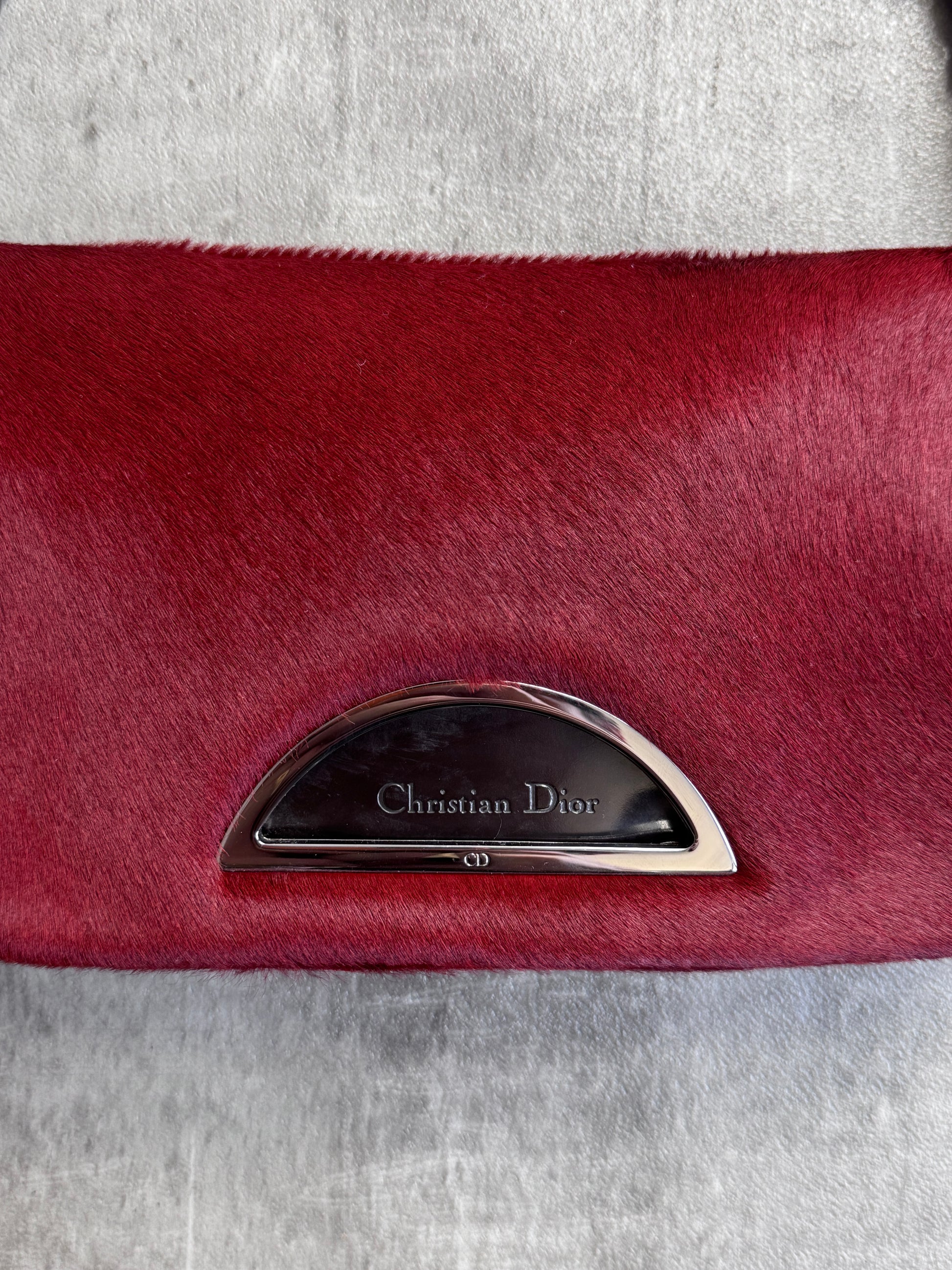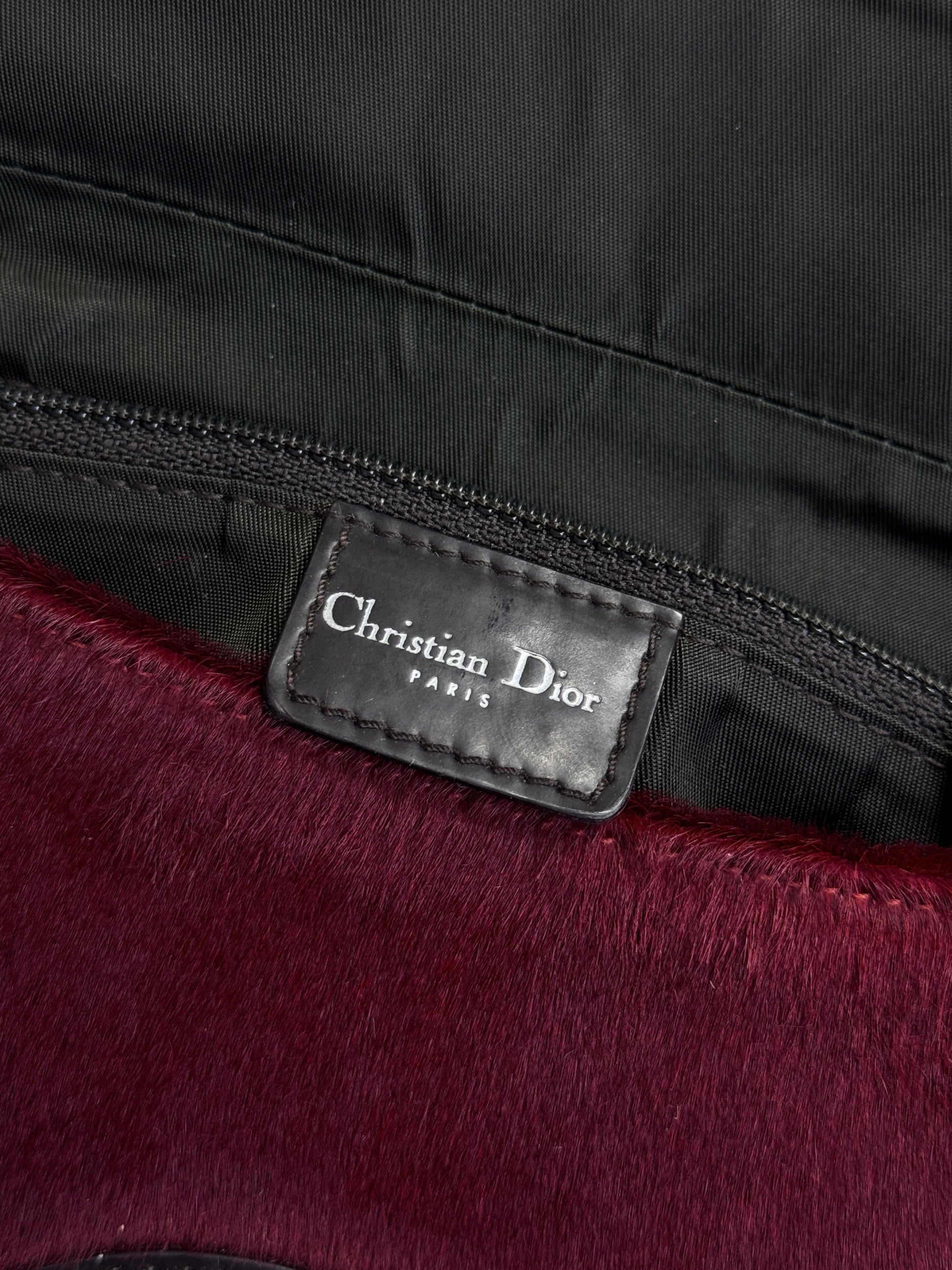 A rare archival piece from the late 1990s, this Christian Dior Melice Cowhide Leather Shoulder Bag reflects the brand’s sophisticated experimentation during the pre-Galliano transition era. Crafted in 1999, the bag features a sleek curved silhouette in rich burgundy-dyed cowhide leather with a luxuriously soft hair texture, balanced by black enamel hardware engraved with the Christian Dior logo. Its minimalist form and sculptural beaded handle epitomise Dior’s timeless blend of elegance and modernity, a collectible statement piece from one of the house’s most refined design periods.