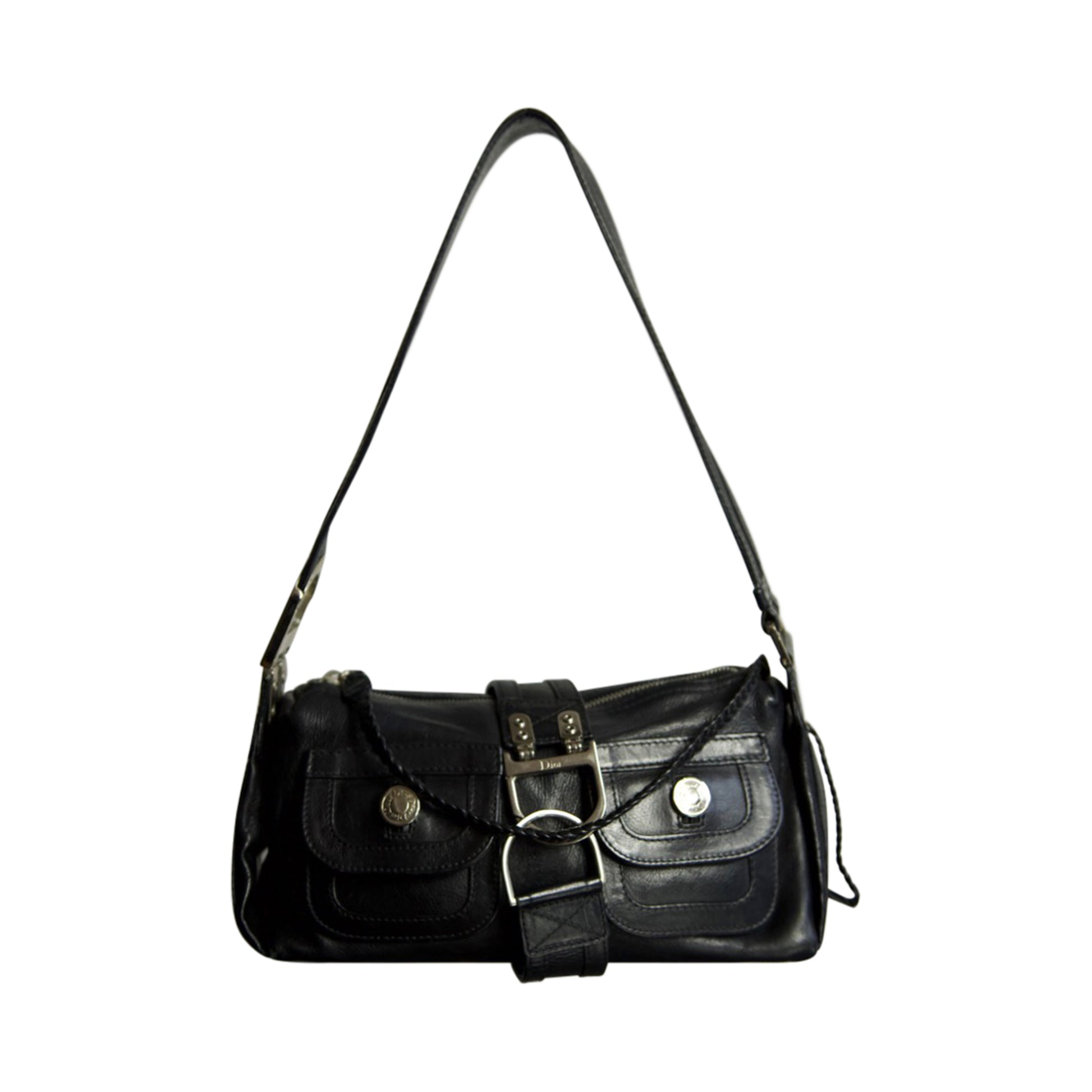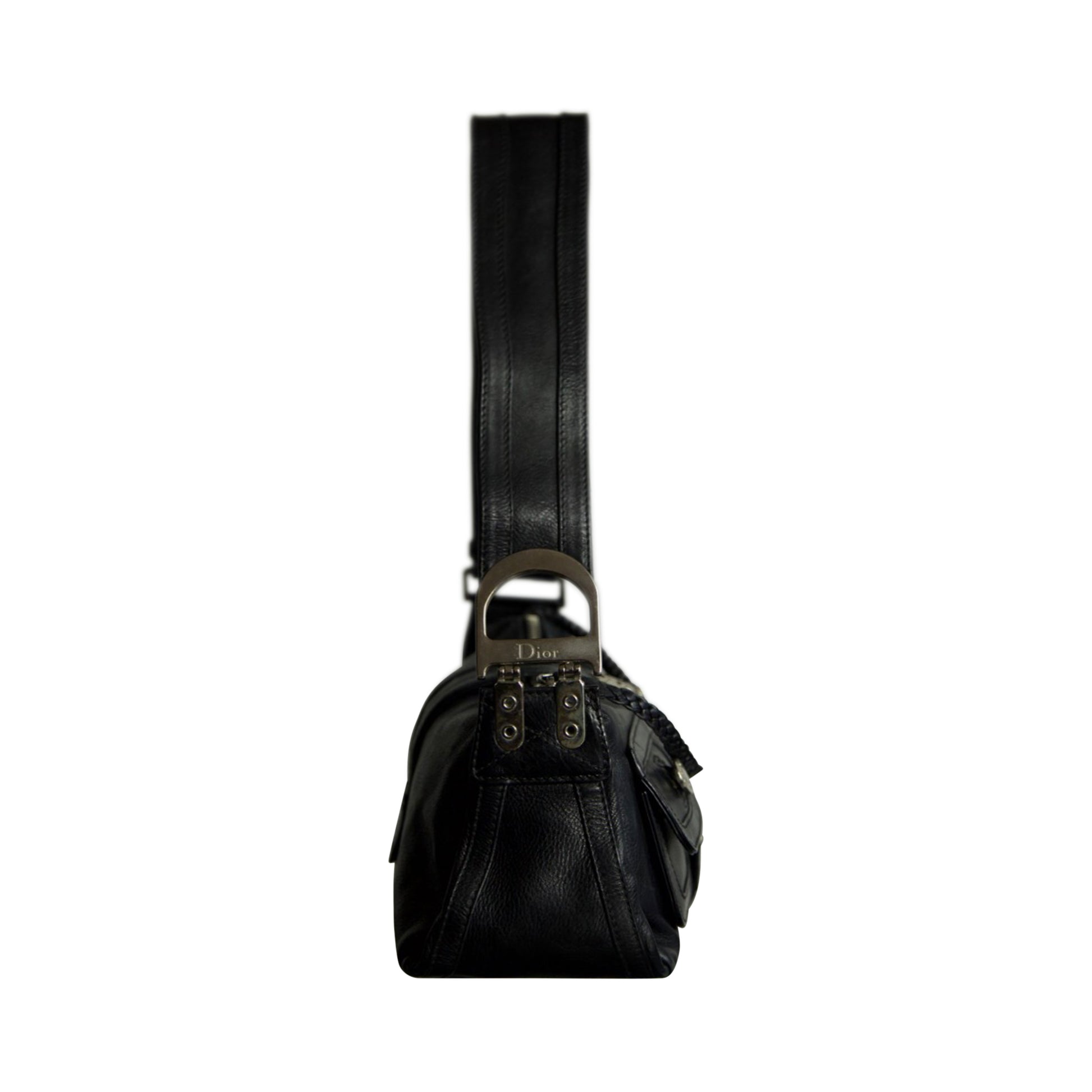A striking piece from Dior’s mid-2000s archives, the Christian Dior 2005 Leather Flight Bag embodies the rugged elegance and utilitarian luxury of the era. Crafted from smooth black leather, the design features dual front flap pockets, silver-tone hardware, and a distinct central belt closure, a detail that reflects Dior’s fusion of practicality and high-fashion attitude during the John Galliano era. Compact yet structured, this shoulder bag combines an archival aviation-inspired silhouette with timeless Parisian edge, the perfect vintage statement for collectors and everyday wearers alike.