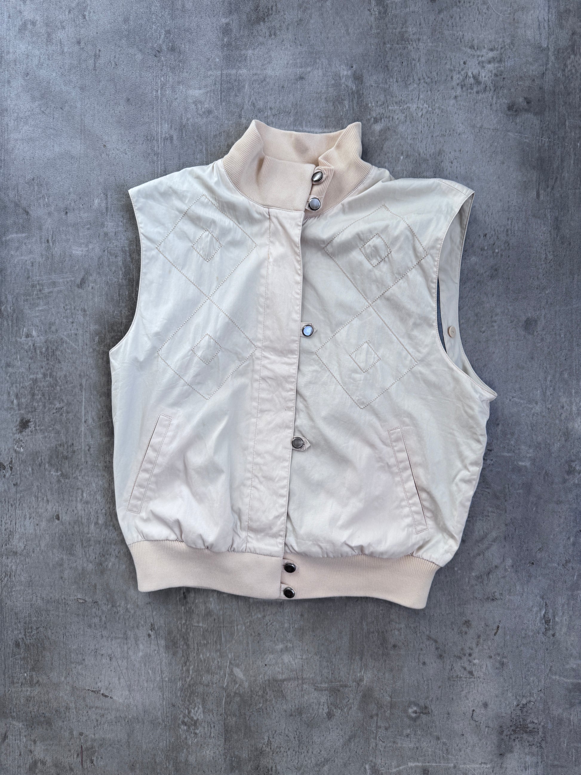 A sophisticated layering piece from Christian Dior, this gilet brings together elegance and practicality in a lightweight design. Crafted in a soft ivory tone, it features subtle diamond-shaped embroidery across the front for understated luxury. The ribbed high collar and hem add structure, while the snap button closure keeps the silhouette clean and versatile. Perfect for transitional weather, it offers a refined yet casual edge to any look.