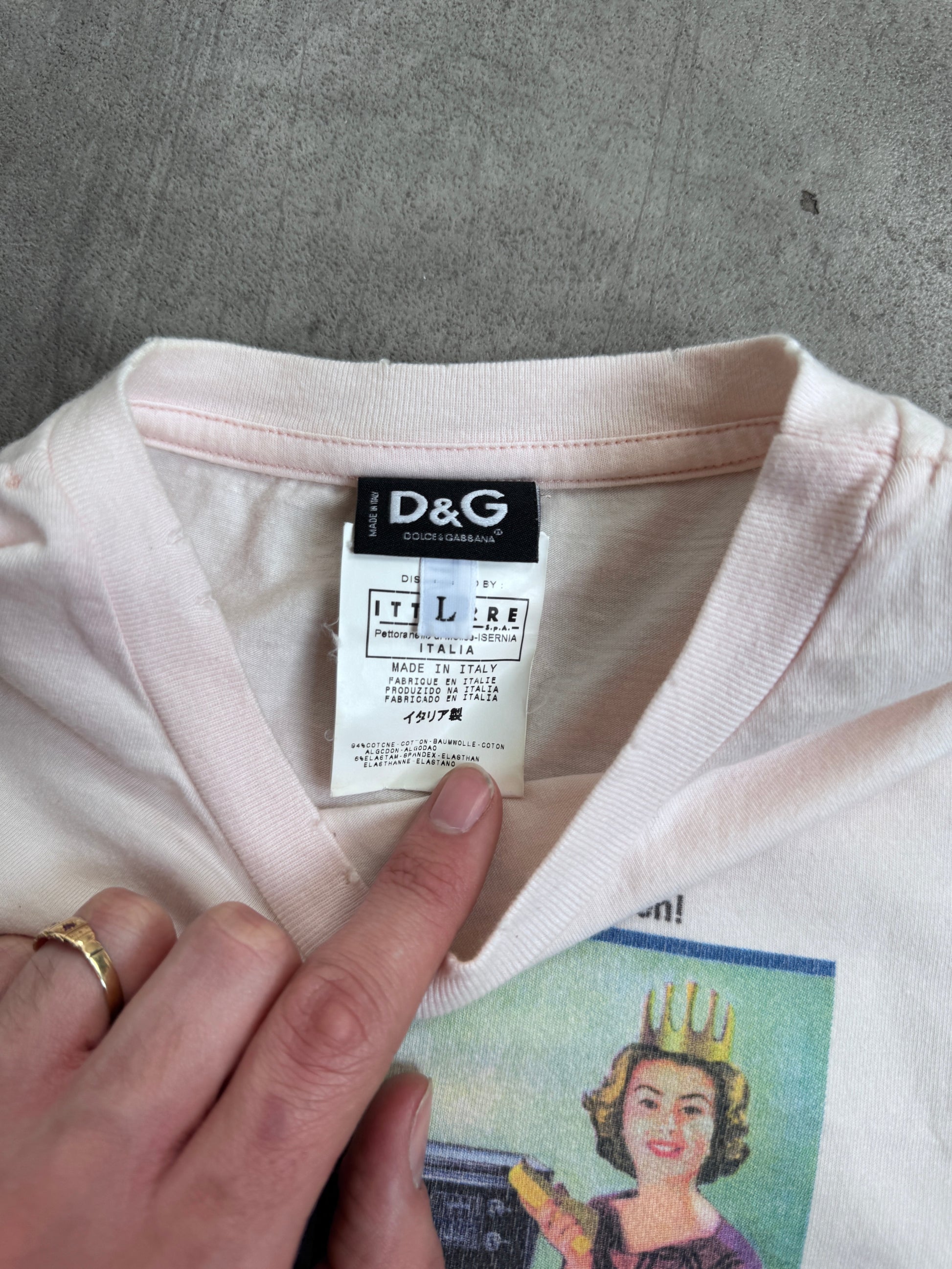 Inject playful Y2K-era charm into your wardrobe with the D&G Alcott Frigidaire Pink Hue Graphic Tee—a vibrant statement piece from Dolce & Gabbana’s iconic diffusion lines. This tee combines bold graphics, retro inspiration, and premium Italian craftsmanship for standout streetwear style.