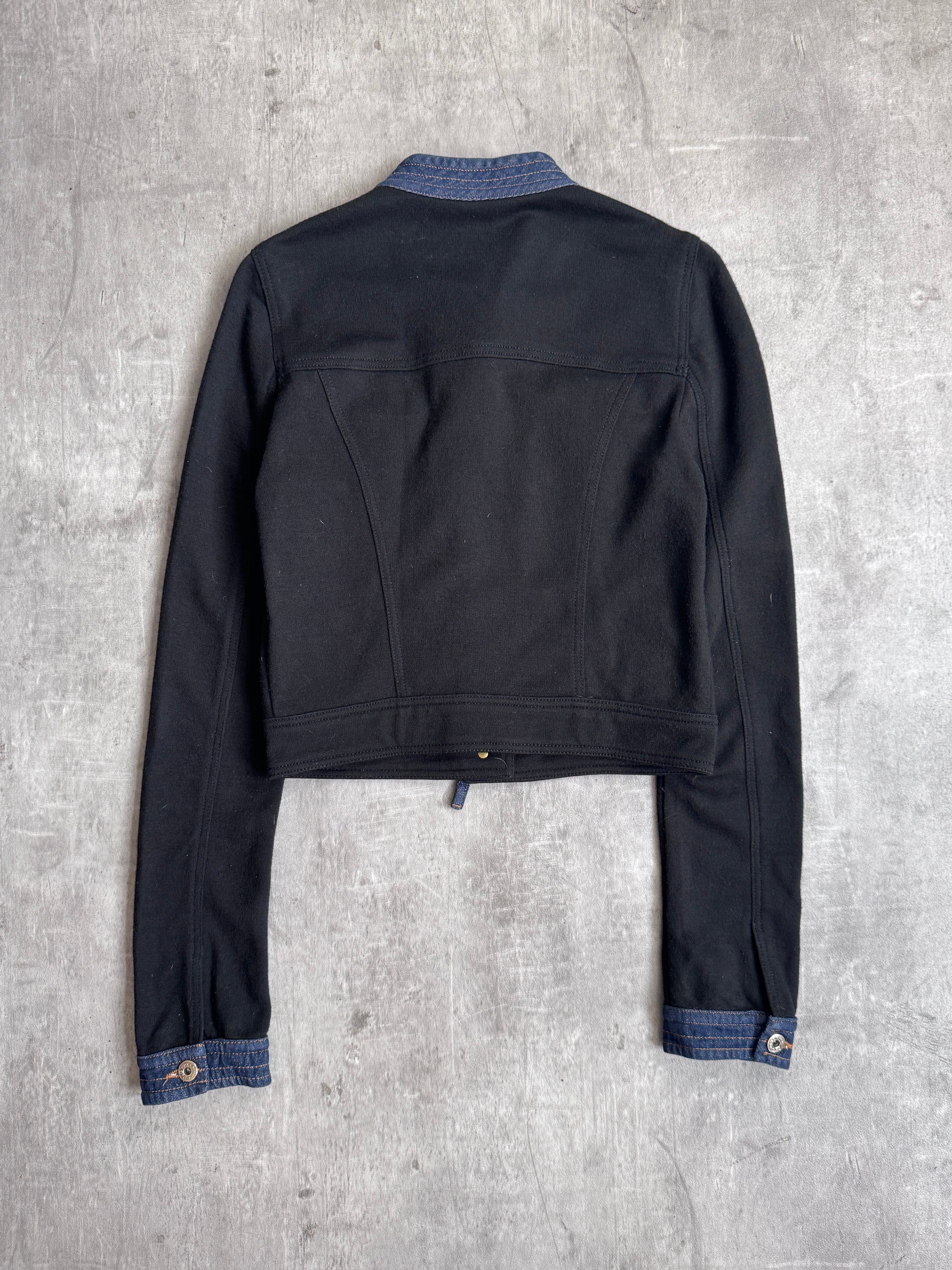 A distinctive Dolce & Gabbana (D&G) cropped sweater jacket blending casual streetwear influence with refined tailoring. Crafted from soft black cotton, it features denim contrast detailing along the collar, cuffs, and waist tie — a signature early 2000s D&G aesthetic that perfectly fuses laid-back Italian cool with structured femininity.