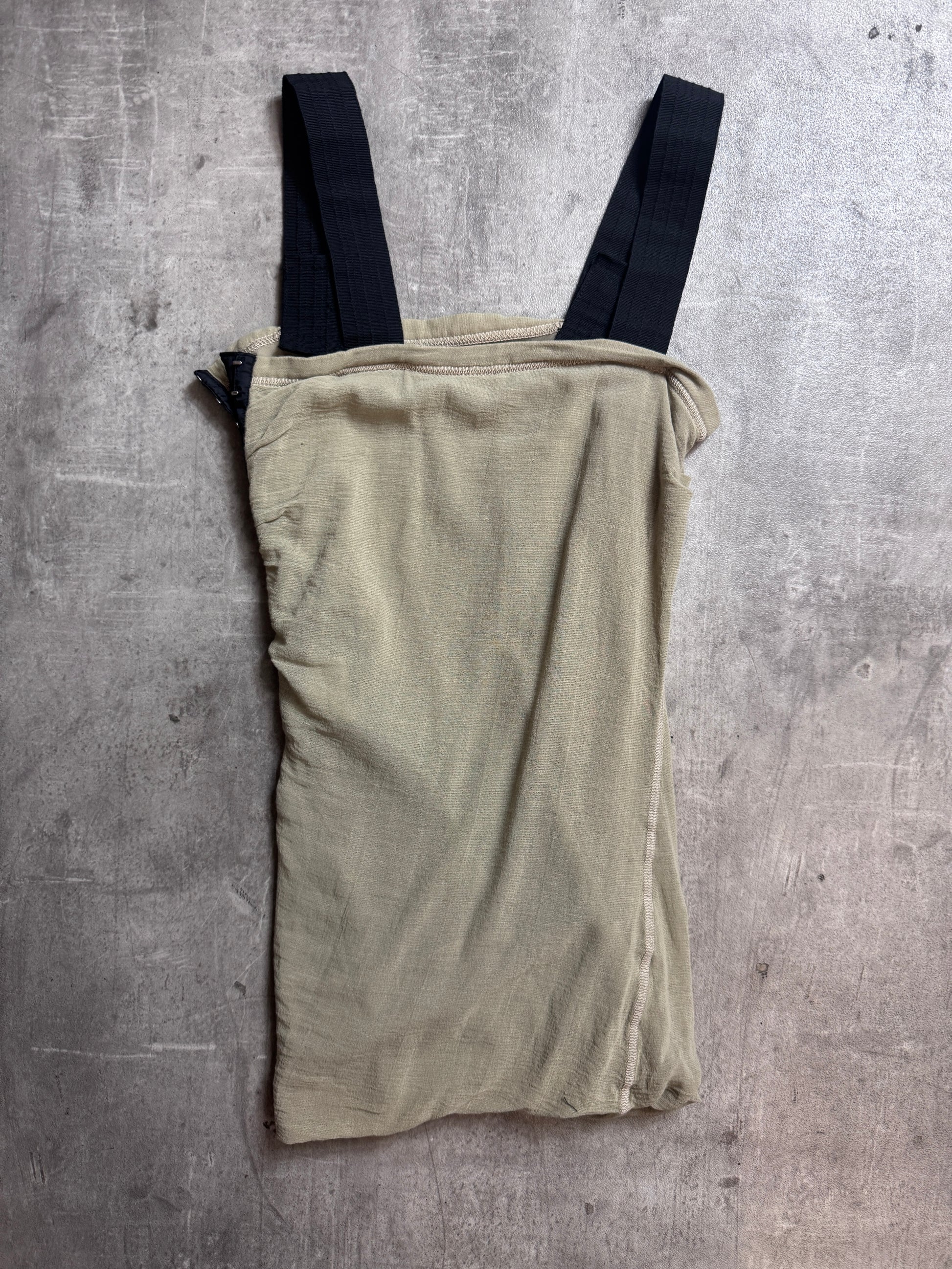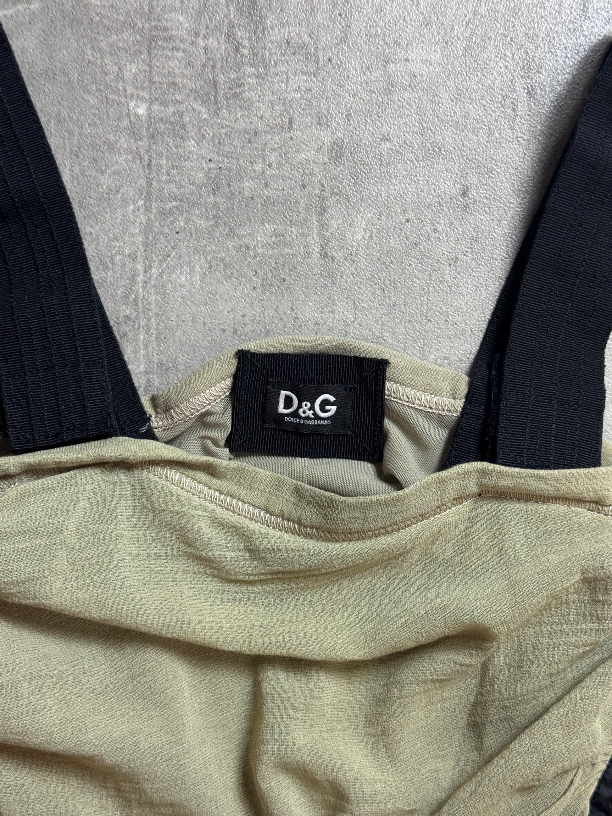 Dolce & Gabbana tank top crafted from soft cotton in a muted sage green colorway. Features elegant draped detailing with a hook-fasten closure, creating a fluid silhouette with subtle structure. A refined yet wearable piece that reflects early D&G’s focus on tailored femininity and thoughtful design.