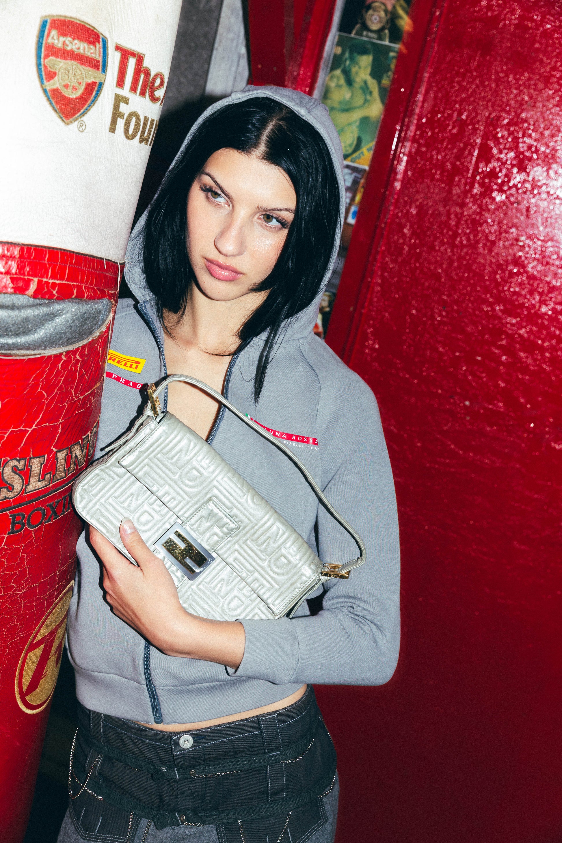 An elevated take on one of the most iconic silhouettes in modern fashion, this Fendi Logo Embossed Nappa Leather Baguette Bag embodies the house’s signature craftsmanship and understated glamour. Originally introduced in the late 1990s, the Baguette became a defining piece of the decade — a compact, shoulder-carried statement that redefined everyday luxury. This particular iteration is crafted from soft silver nappa leather, embossed with Fendi’s all-over FF monogram, creating a subtle yet distinctive texture. The minimalist design is complemented by tonal stitching, a front flap with magnetic closure, and a single leather shoulder strap for a refined, contemporary finish. An interior lined with satin and fitted with a zip pocket completes this effortlessly sophisticated piece — a collectible embodiment of Fendi’s timeless elegance.