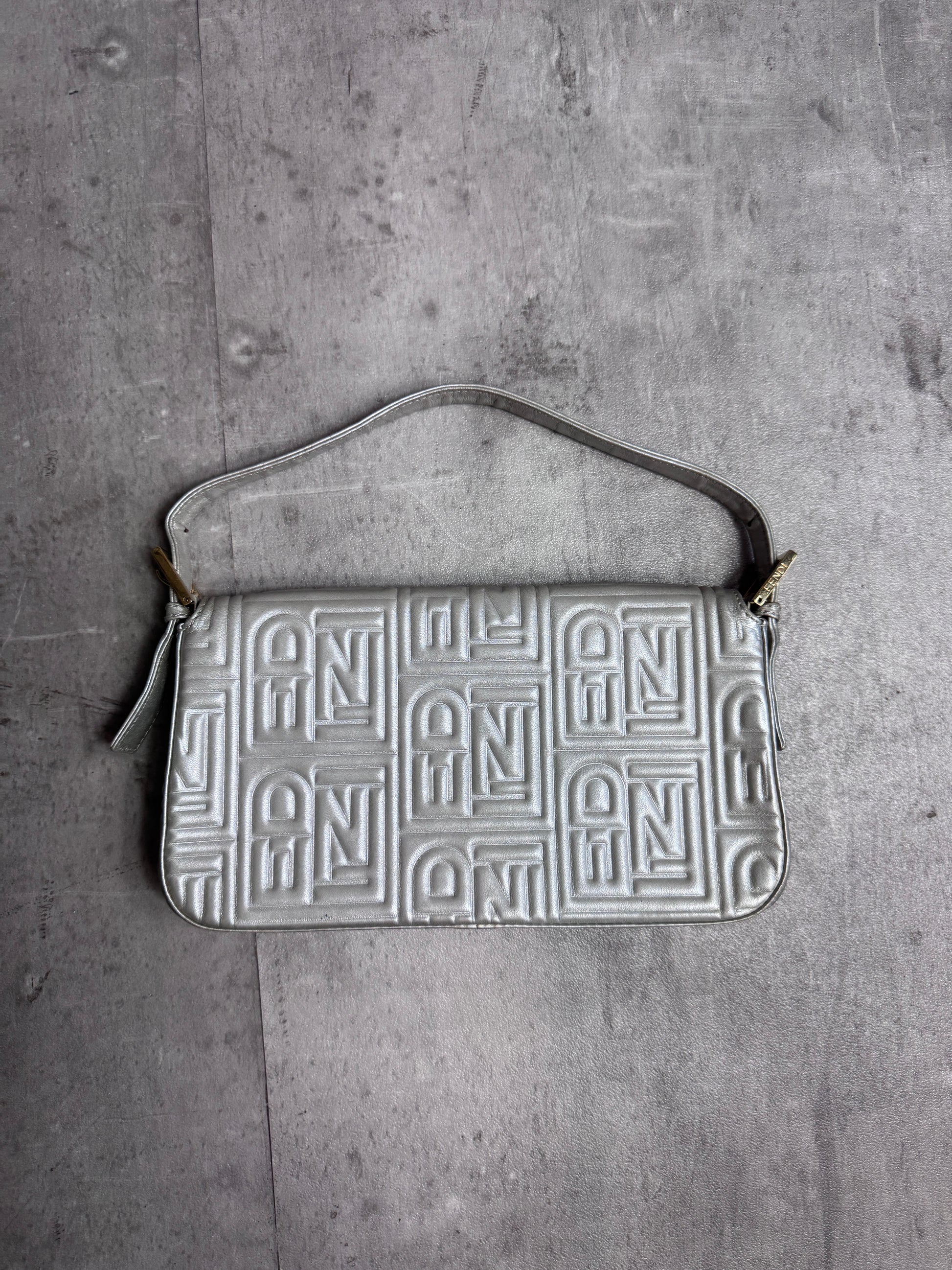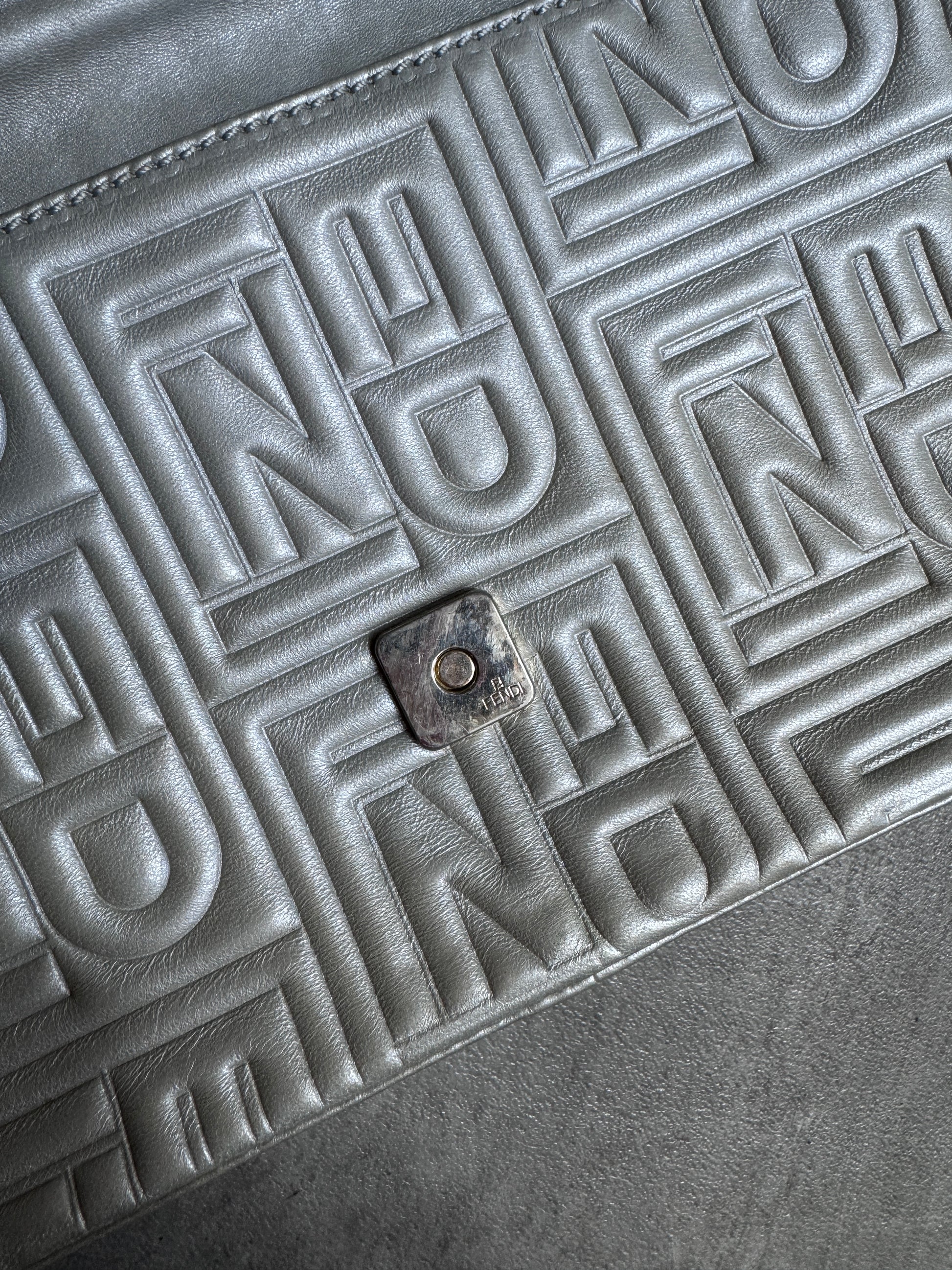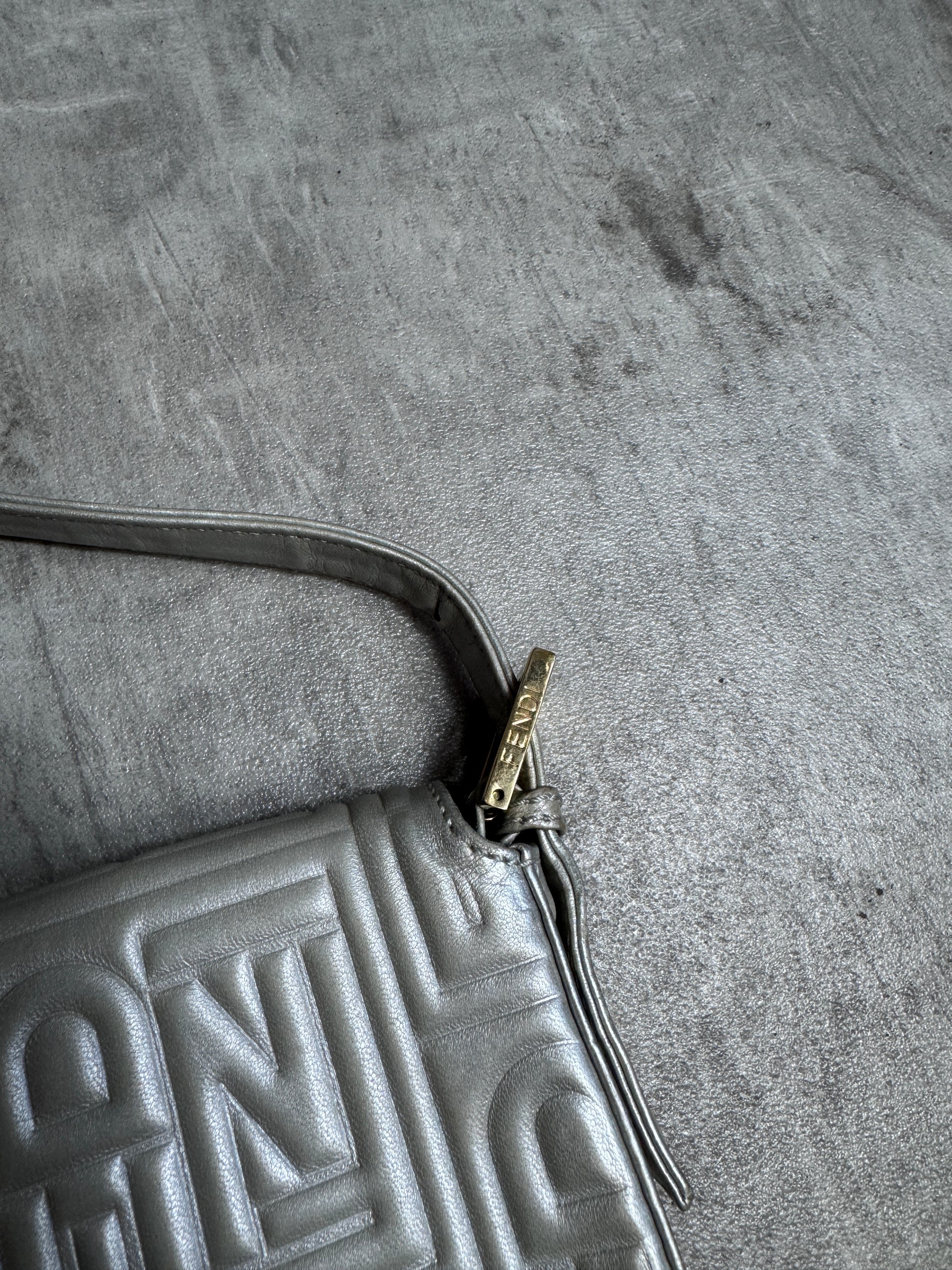 Fendi Logo Embossed Nappa Leather Silver Baguette Bag