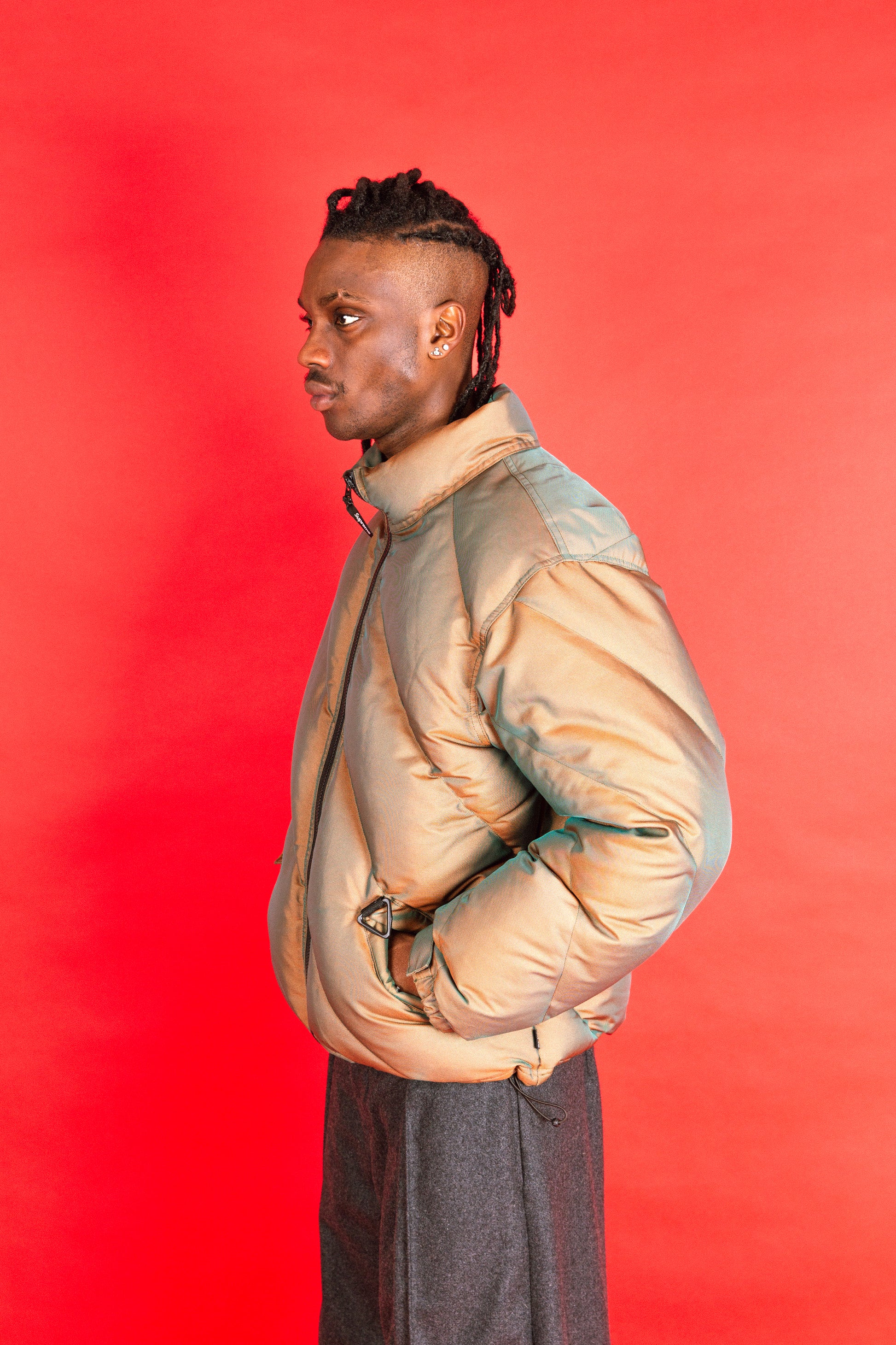 From the Fall/Winter 2019 collection, this Supreme Iridescent Duck Down Quilted Puffer Jacket is a standout cold-weather piece that perfectly captures Supreme’s ability to fuse performance outerwear with bold, statement design. Constructed from an iridescent technical shell, the fabric shifts tone depending on the light, giving the jacket a distinctive, high-impact finish synonymous with Supreme’s late-2010s aesthetic.