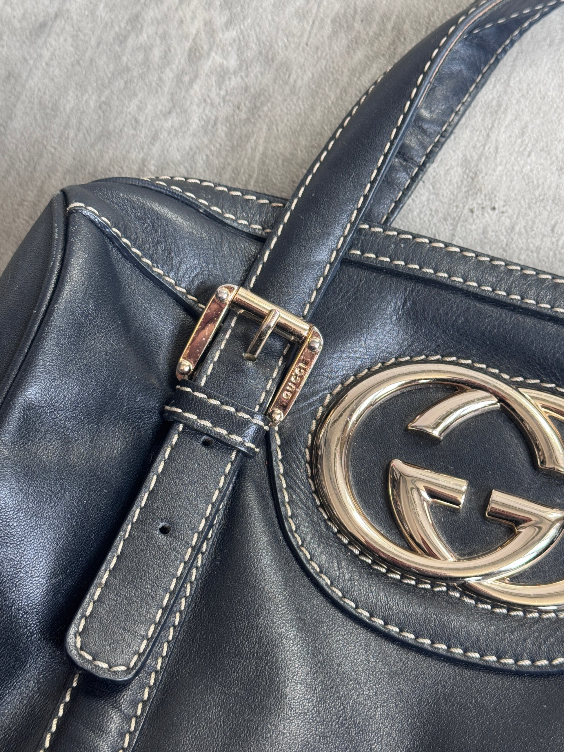 An iconic Gucci Boston Patent Leather Handbag, designed with the house’s unmistakable flair for understated sophistication. Crafted from high-shine black patent leather, this structured mini tote embodies classic Italian luxury, featuring a silver-toned interlocking GG logo prominently displayed at the front. The bag is accented with contrast white stitching, dual rolled handles, and a zip-top closure, blending timeless craftsmanship with contemporary elegance. Compact yet practical, it’s the perfect accessory for both day and evening styling — effortlessly complementing modern and vintage wardrobes alike.