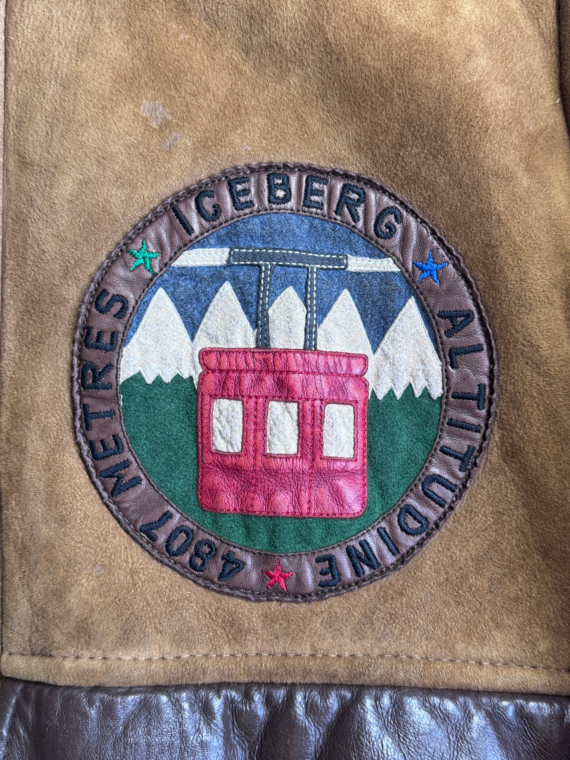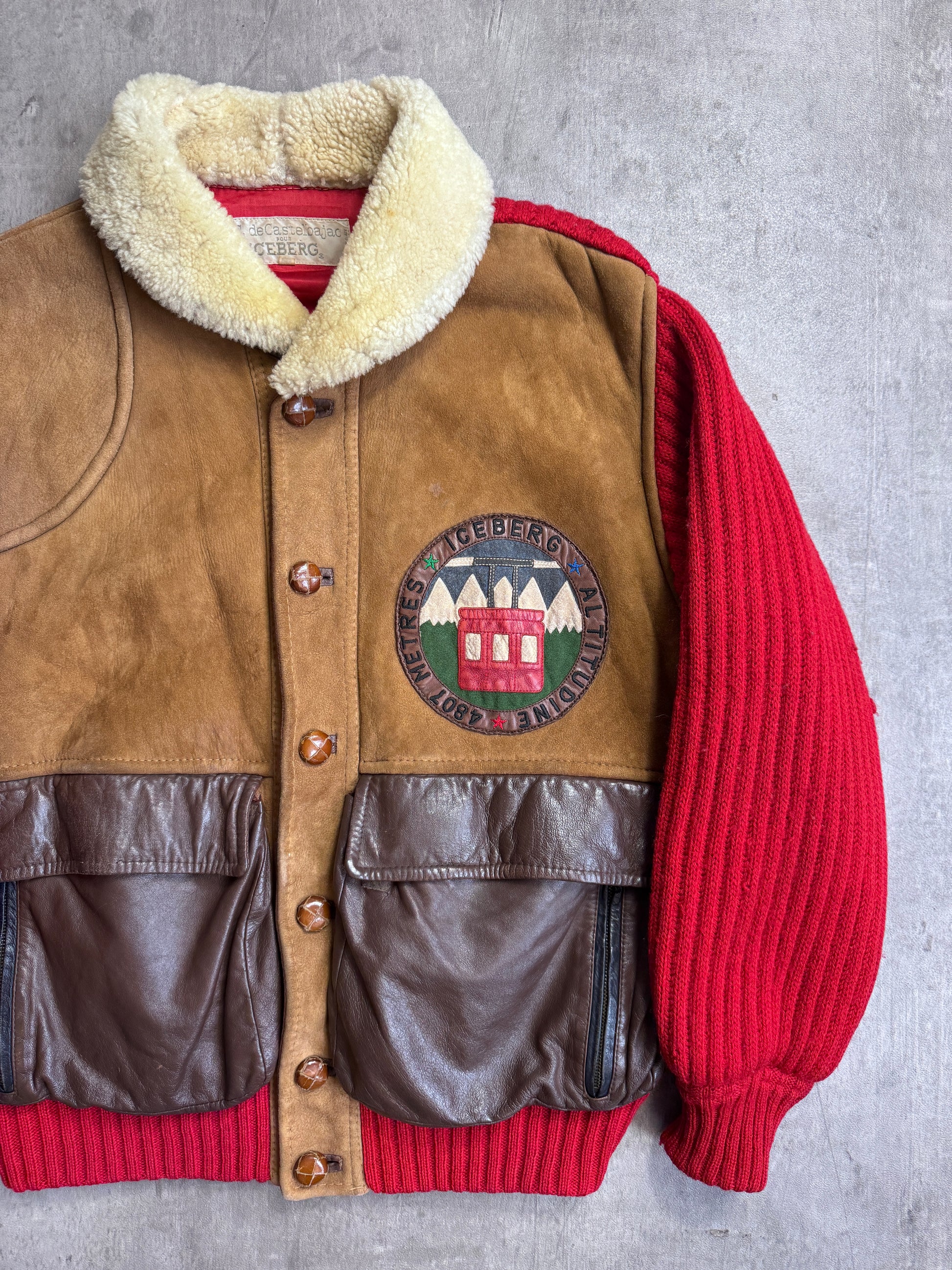 A bold and distinctive piece from Iceberg’s early design era, this Leather Knit Button Up Coat captures the brand’s signature fusion of luxury craftsmanship and playful, graphic individuality. Constructed with a tan suede body, contrasting brown leather lower panels, and chunky red rib-knit sleeves, the piece balances textures to perfection. The design is accented by a cream shearling collar and a large embroidered crest patch on the chest, a hallmark of Iceberg’s 1980s–90s aesthetic, blending collegiate and alpine influences. Finished with copper-tone hardware and a structured silhouette, this jacket represents a rare intersection of high-end sportswear and avant-garde Italian design.