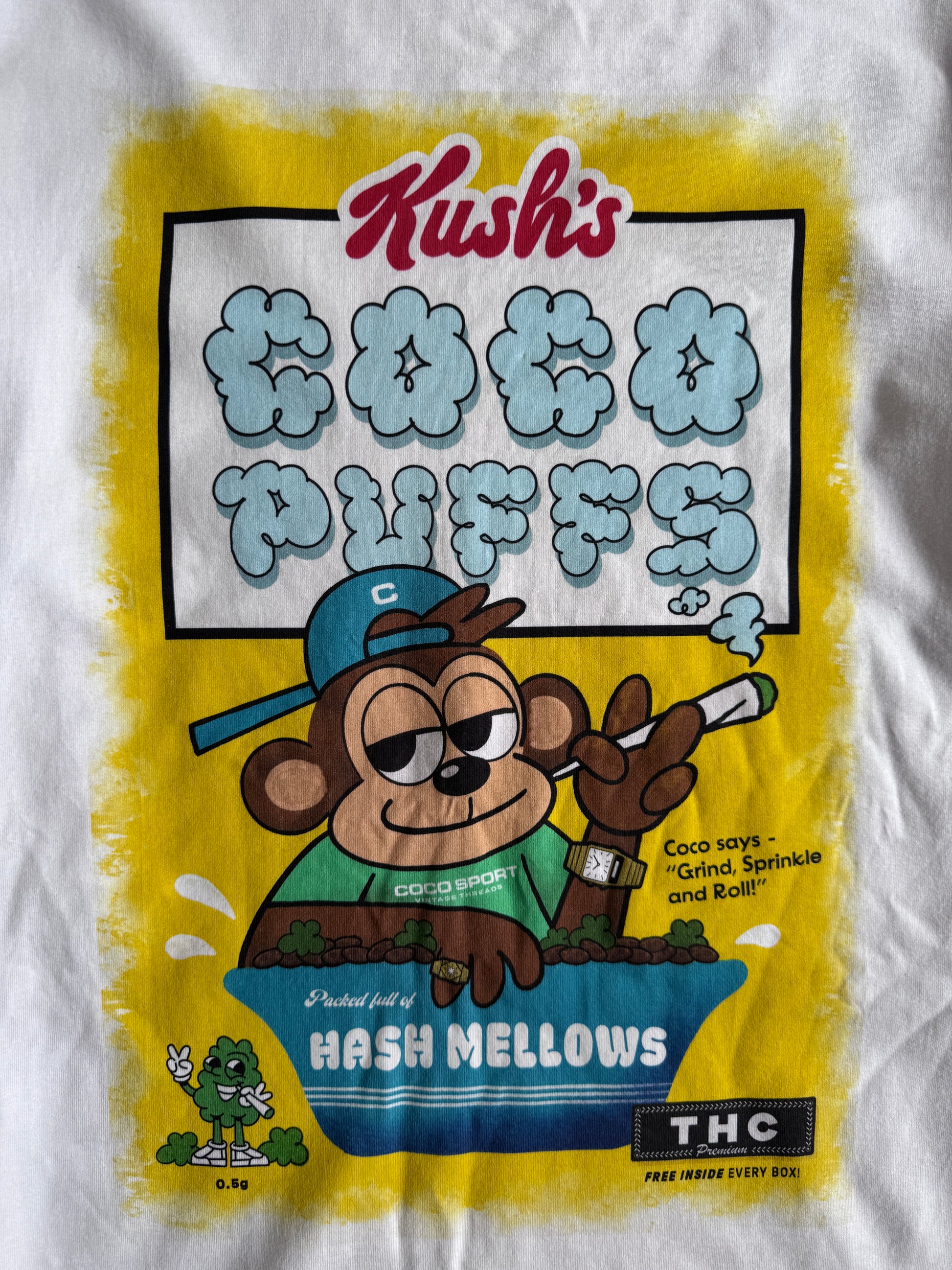 A bold and playful graphic tee featuring a parody cereal-box design with a cheeky twist. The cartoon monkey character and bright yellow backdrop make this piece stand out, bringing a mix of nostalgia and streetwear humor. Perfect for casual fits and a guaranteed conversation starter.