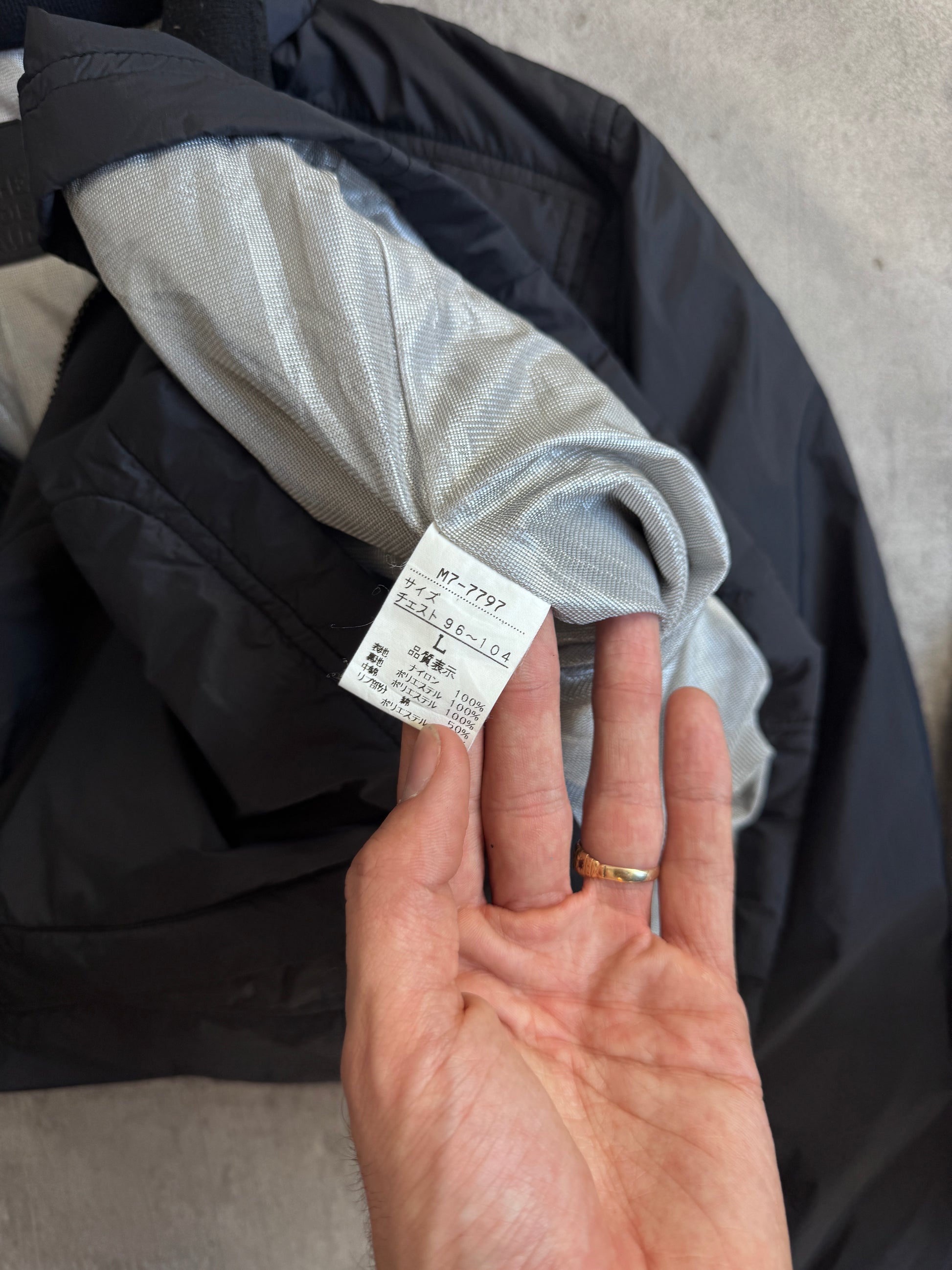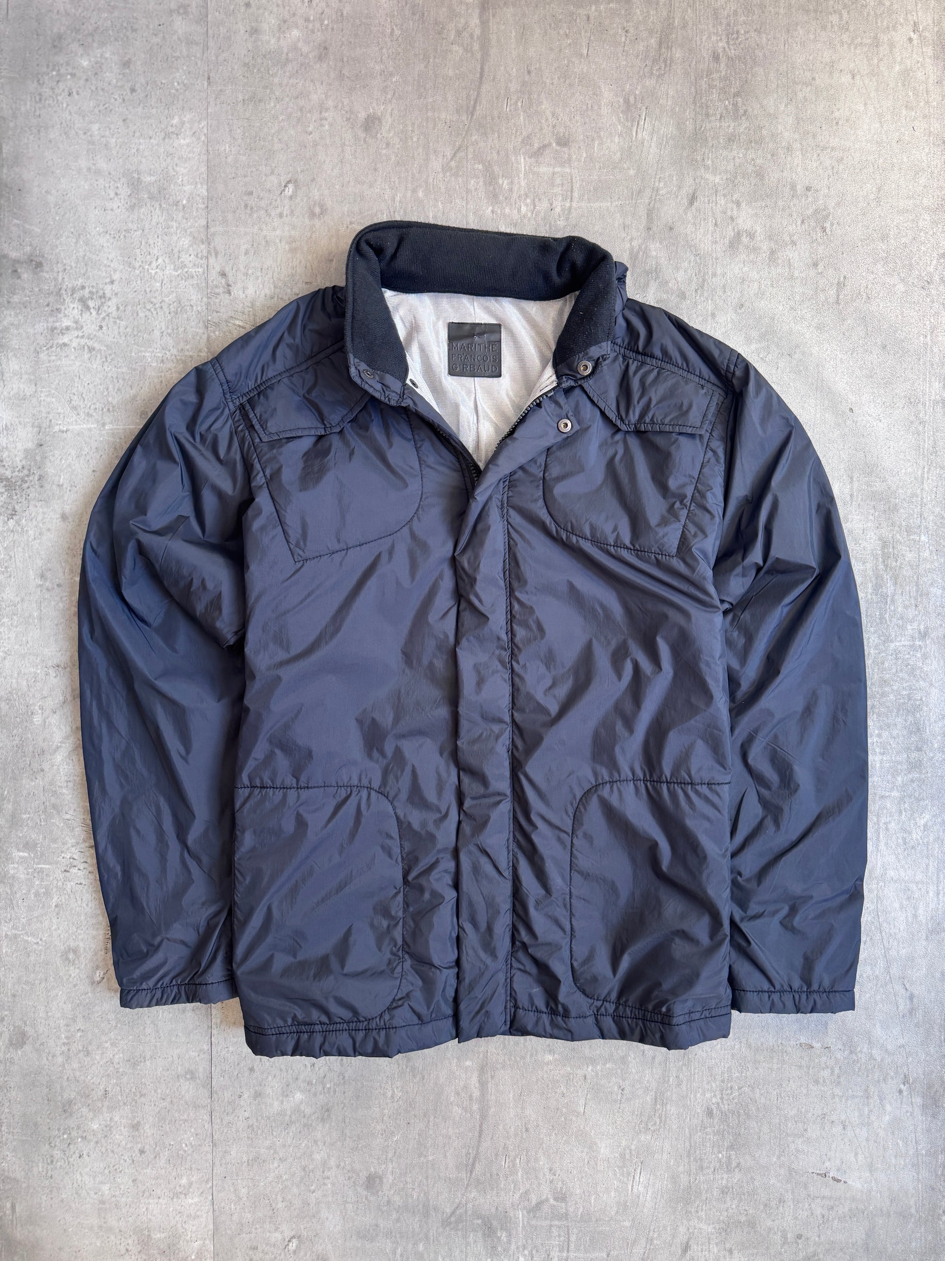 This lightweight navy puffer jacket by Marithé + François Girbaud merges the brand’s experimental design language with functional outerwear styling. Designed with a detachable hood concealed in the collar, this piece balances everyday wearability with technical versatility. The jacket is crafted from a lightweight nylon shell with a soft quilted lining, providing warmth without unnecessary bulk. Its subtle utility detailing, including oversized front patch pockets and snap button accents, reflects Girbaud’s forward-thinking approach to practical yet innovative fashion.