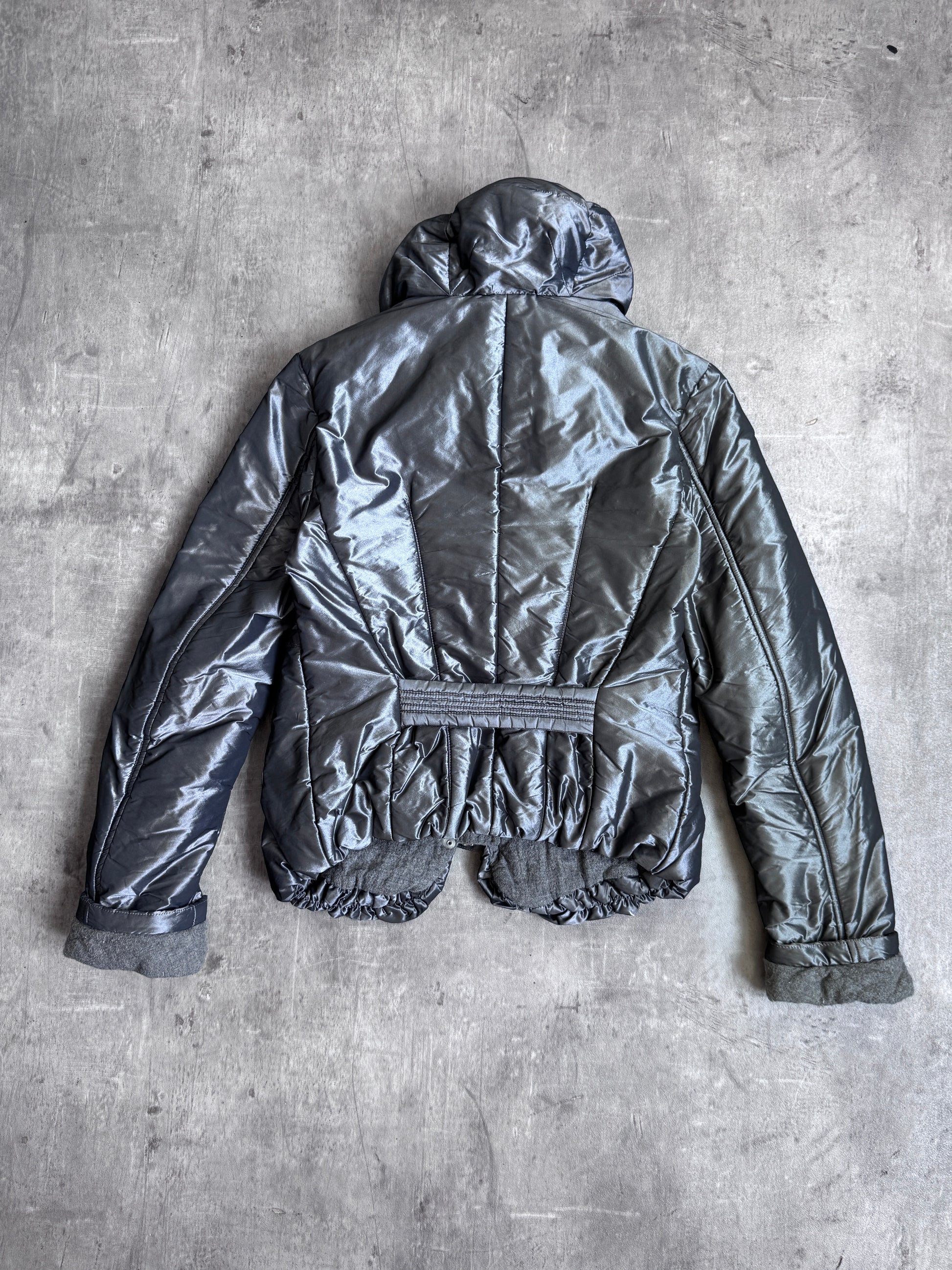 This Marithé François Girbaud puffer jacket captures the brand’s iconic experimental edge, blending futuristic design with a utilitarian silhouette. Crafted in a metallic silver-grey finish, it features a high sculpted collar, cinched waist detailing, and signature asymmetrical stitching — a hallmark of Girbaud’s innovative approach to technical outerwear. The jacket’s lightweight yet insulated construction ensures warmth while maintaining a sleek, structured shape.