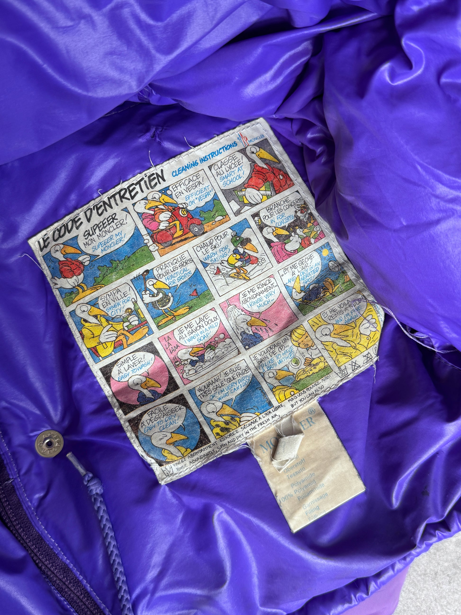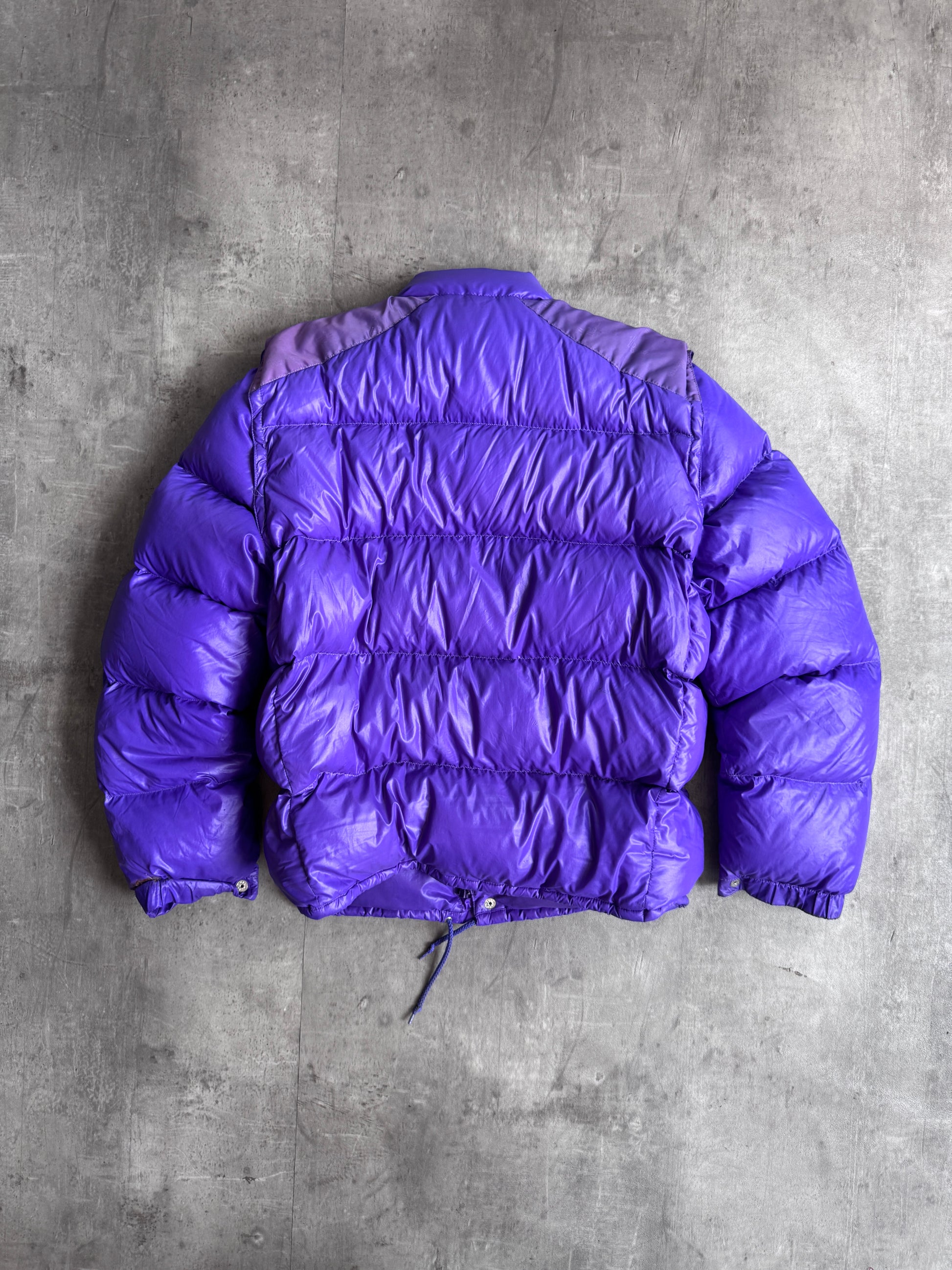 A striking vintage Moncler puffer jacket in a bold purple hue, designed with both warmth and versatility in mind. Crafted from glossy nylon laqué, this piece features a detachable sleeve construction, allowing it to be worn as either a full jacket or a gilet. The jacket includes the signature Moncler patch logo on the chest, a high funnel collar with press-stud closure, and an adjustable drawstring hem. A perfect blend of functional alpine heritage and retro streetwear appeal.