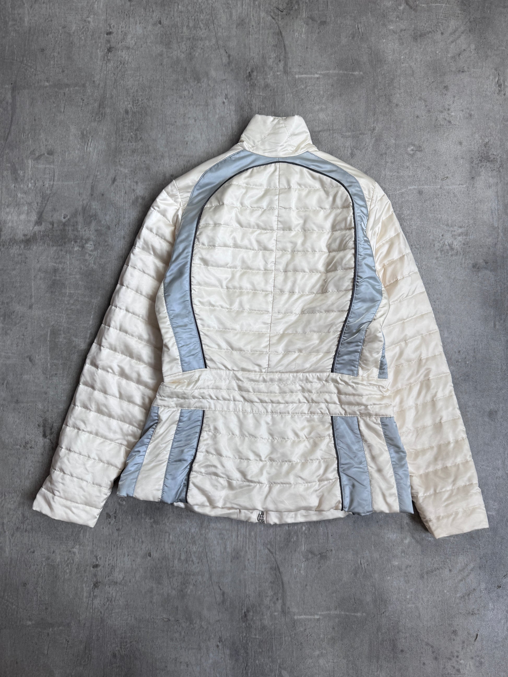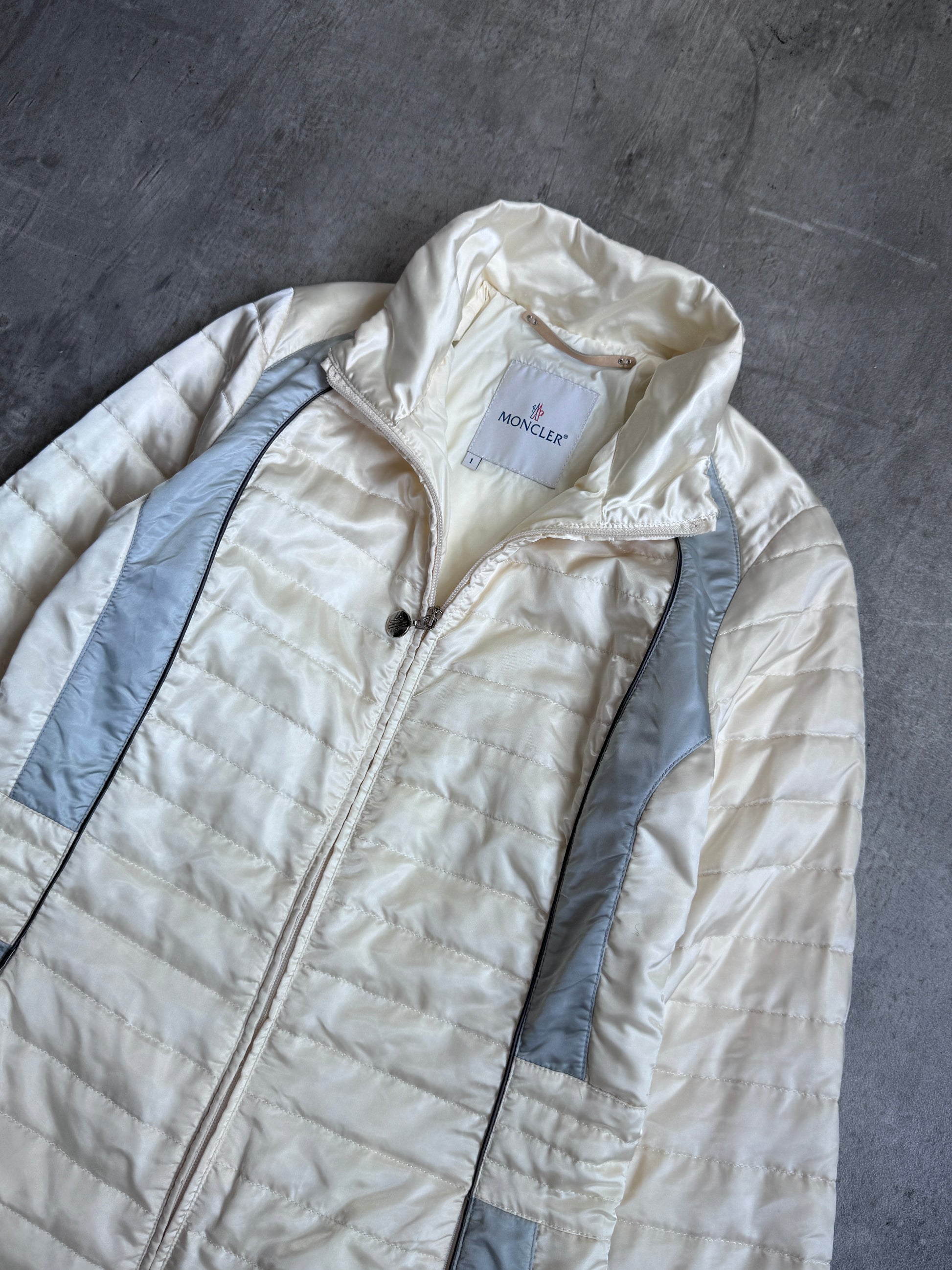 This Moncler two-tone satin puffer jacket is a sleek and refined take on outerwear luxury. Crafted from a glossy cream satin with contrasting pale blue side panels, it features a streamlined silhouette that combines style with Moncler’s signature performance craftsmanship. Lightweight yet insulating, it’s ideal for transitional weather while maintaining a polished, high-end look.