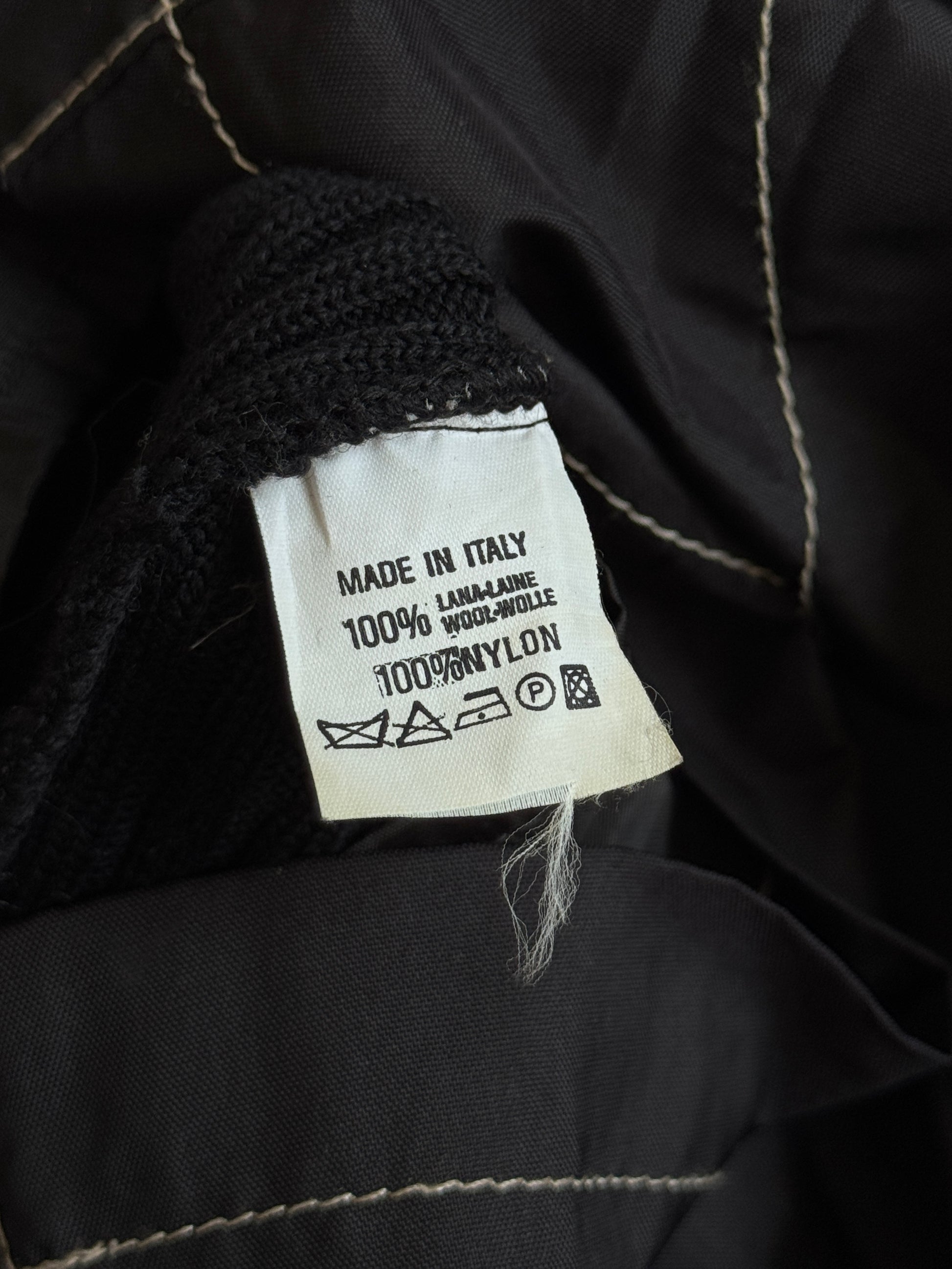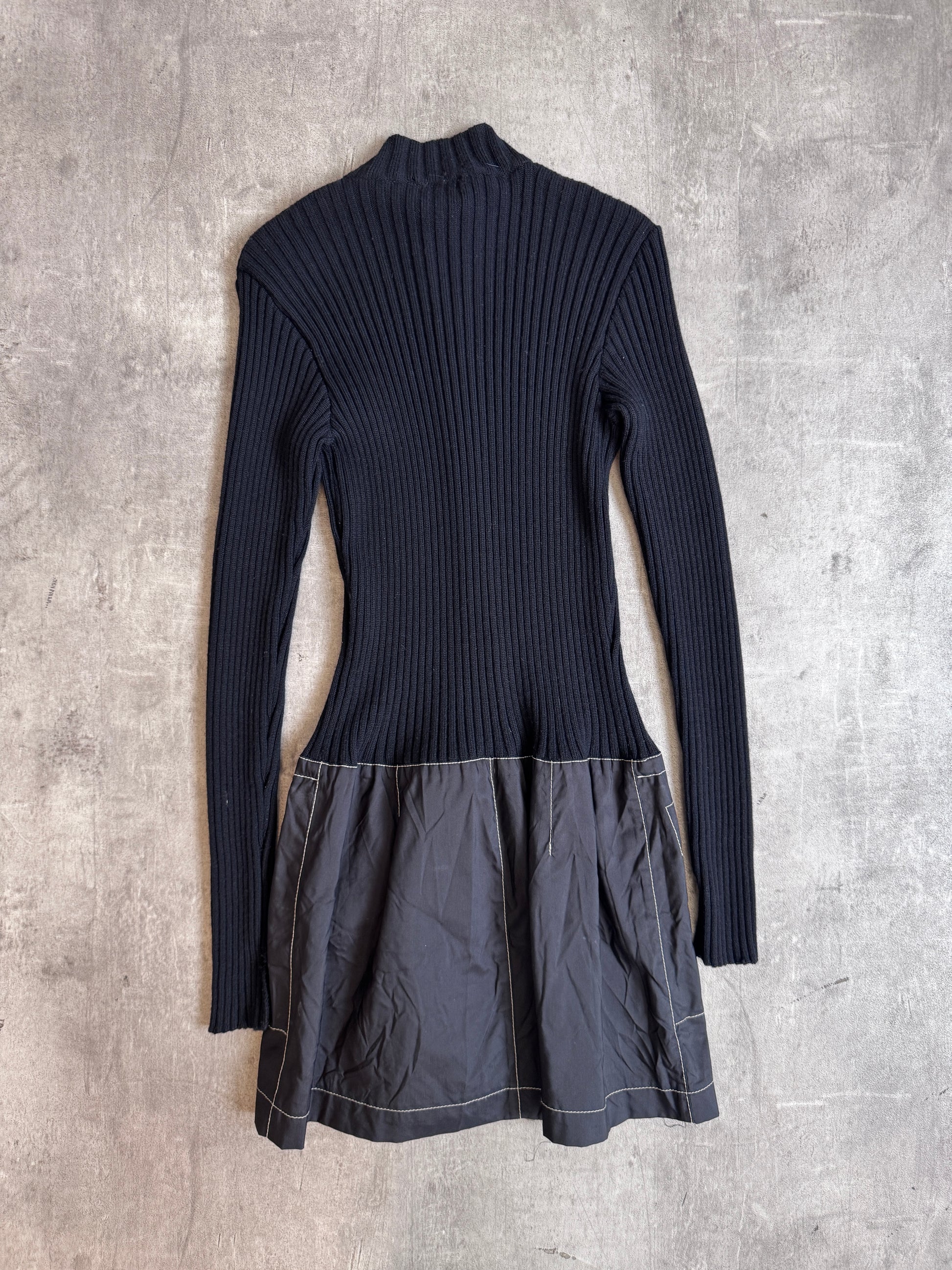A bold and playful piece from Moschino, this mini dress captures the brand’s signature irreverent energy with a mix of statement graphics and technical detailing. Combining a rib knit base with nylon elements, it delivers a body-contouring silhouette with a utilitarian edge.
