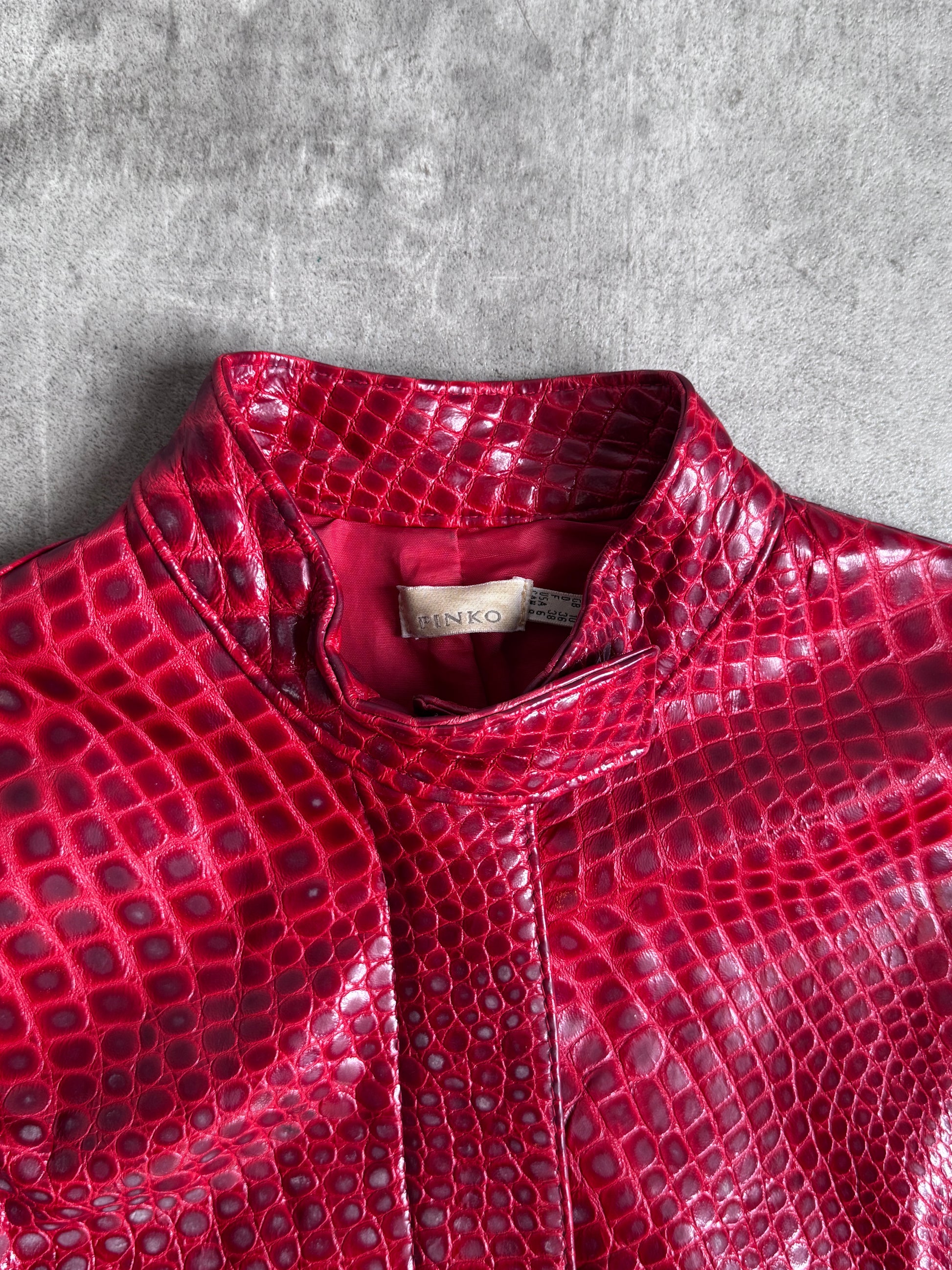 A bold statement piece, this Pinko leather jacket stands out with its striking cherry red finish and embossed croc texture. Crafted from premium leather, it combines a high-shine, structured look with a confident, fashion-forward silhouette.