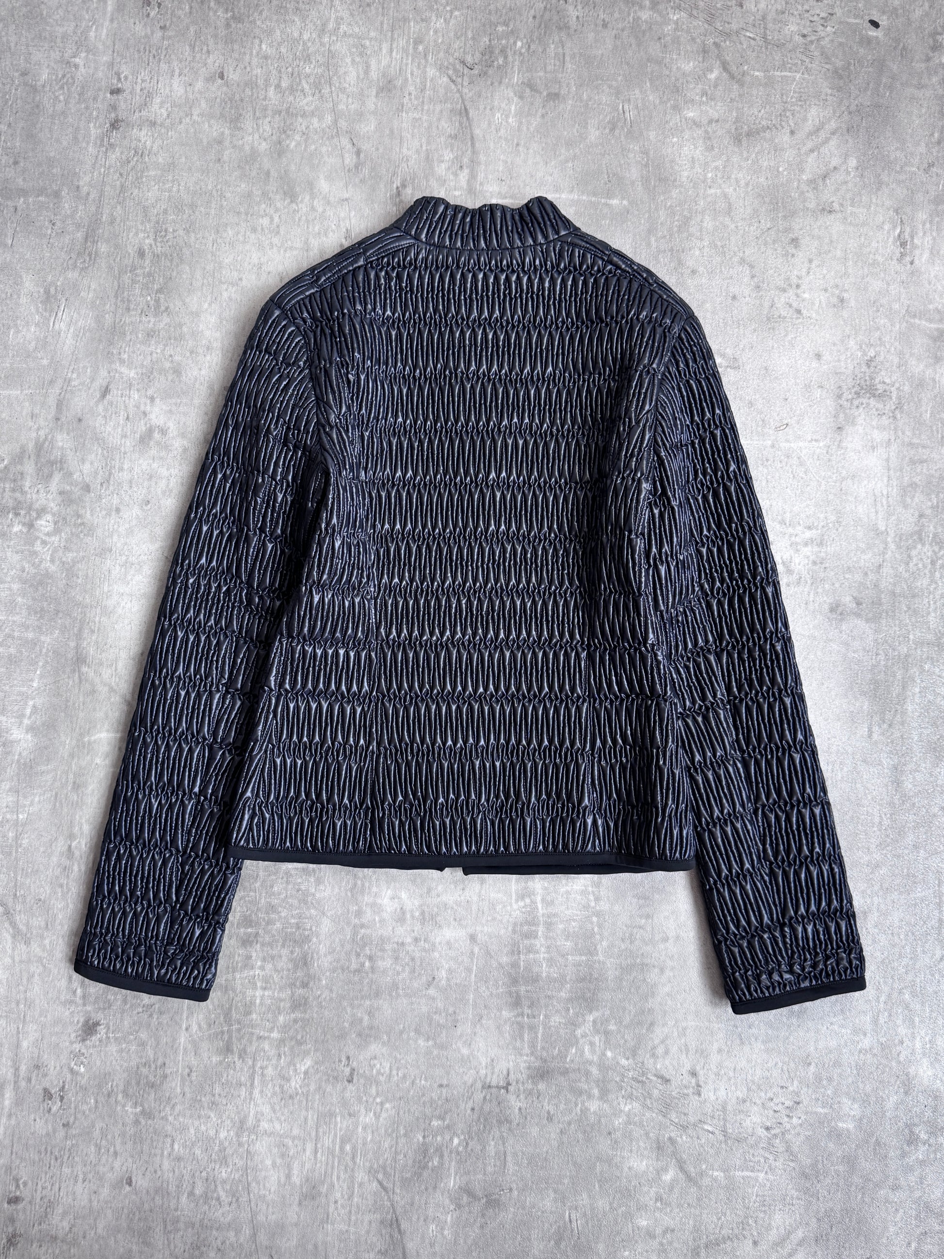 A sleek and refined Prada lightweight puffer jacket, crafted from premium black nylon with a distinctive shirred texture throughout. This modern silhouette combines a minimalist design with intricate detail, featuring a silver-tone two-way zipper, zippered hand pockets, and a subtle stand collar. Perfect for transitional weather, this piece showcases Prada’s mastery of technical luxury and contemporary tailoring.