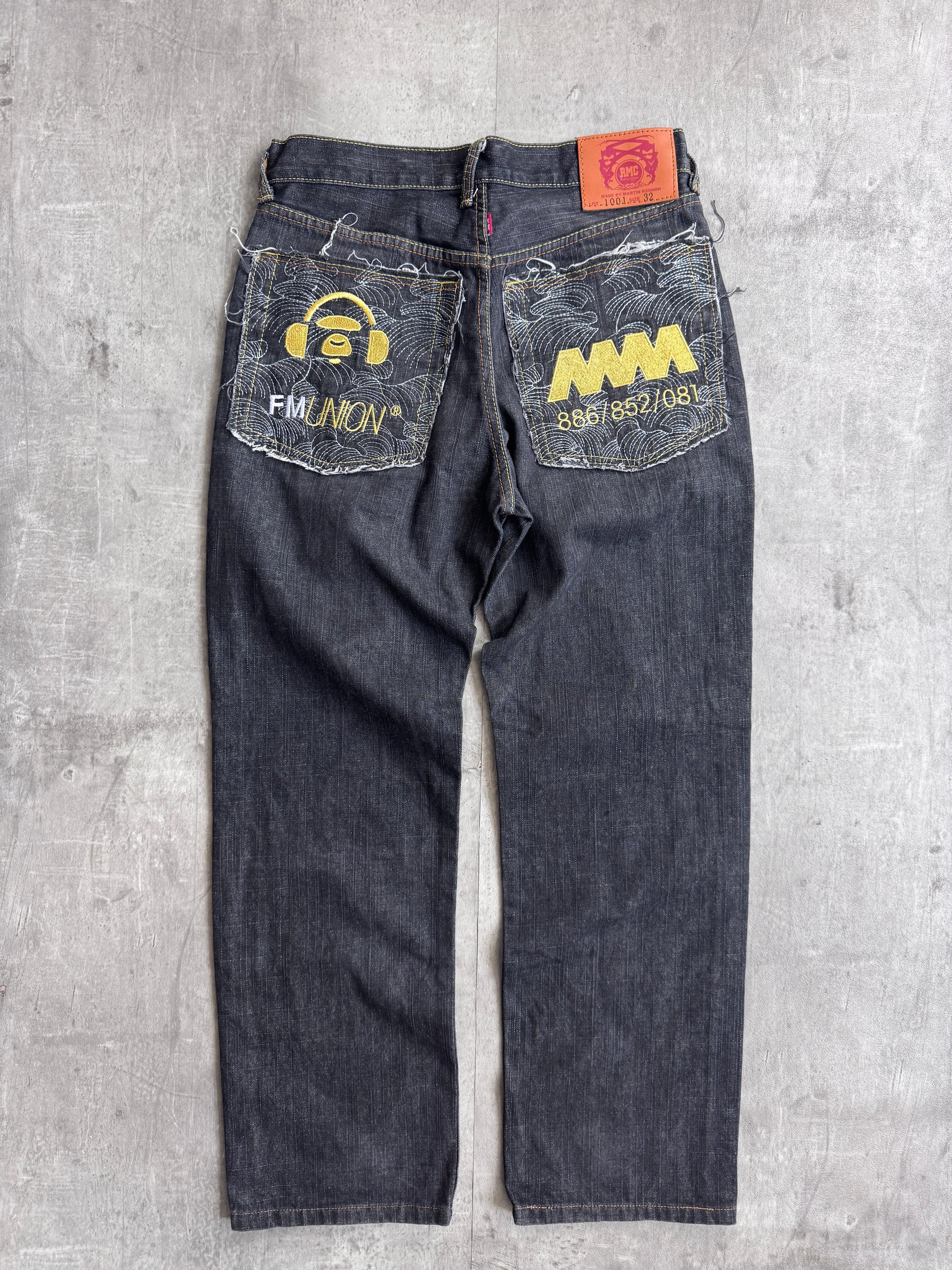 A striking fusion of craftsmanship and streetwear aesthetics, these RMC “FMUnion” Embroidered Jeans showcase the brand’s signature flair for intricate detailing and bold graphic design. Combining high-quality denim construction with statement embroidery, they represent the golden era of Japanese designer denim.