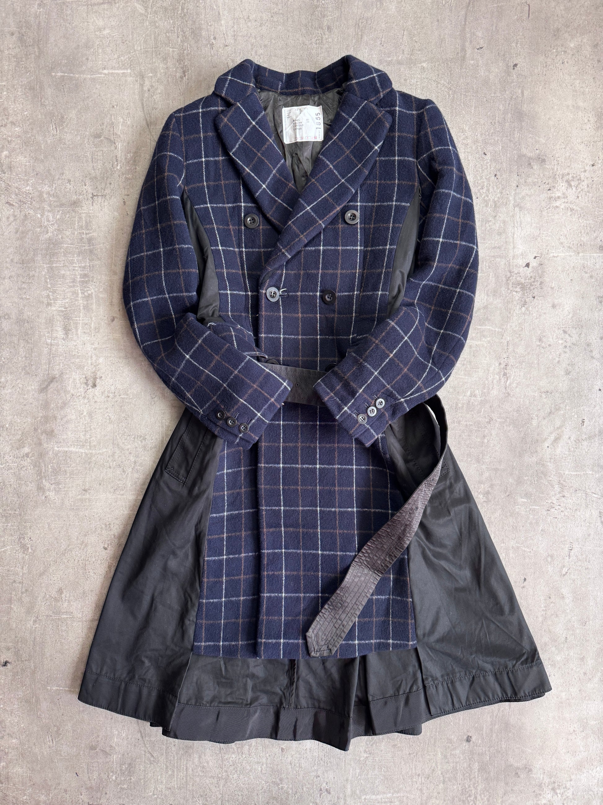 Sacai Navy Check Wool Blend Black Nylon Detailed Belted Raincoat