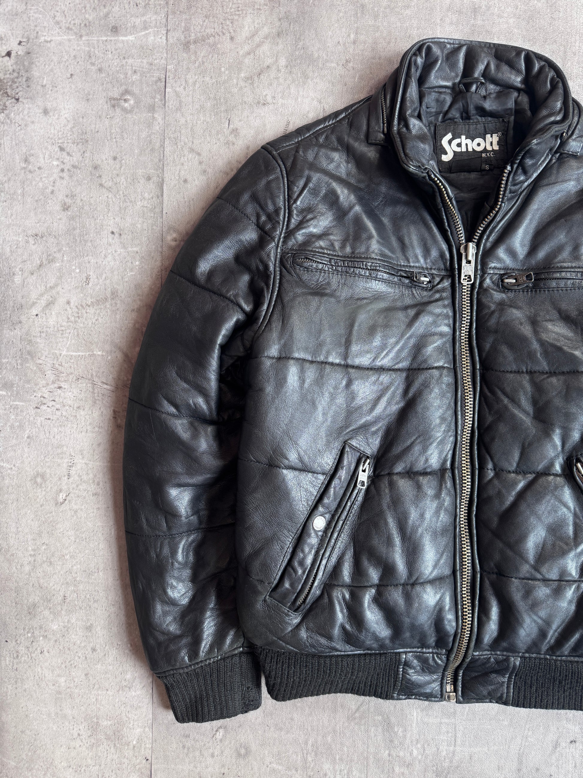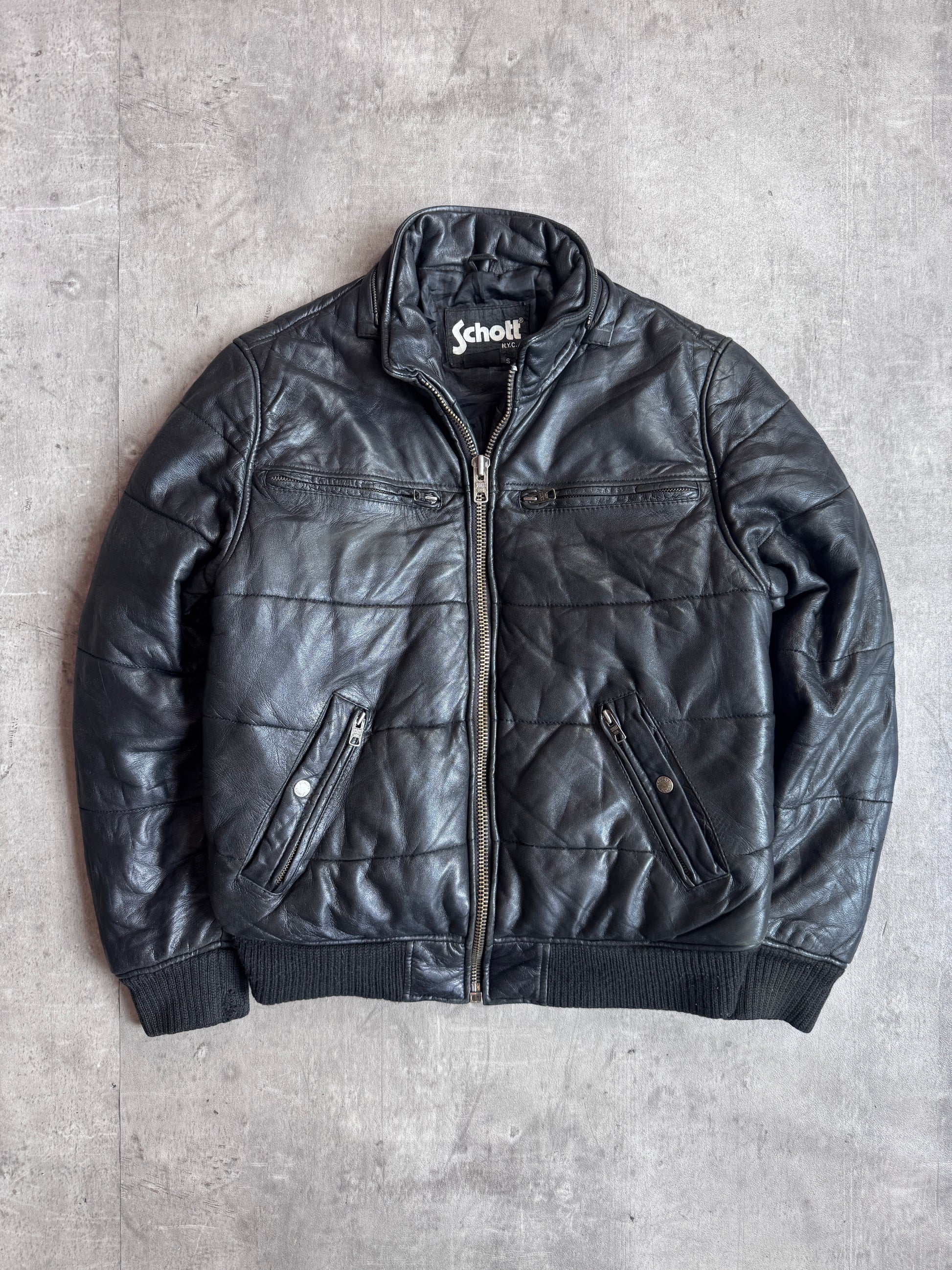 Schott Black Quilted Padded Leather Bomber Jacket