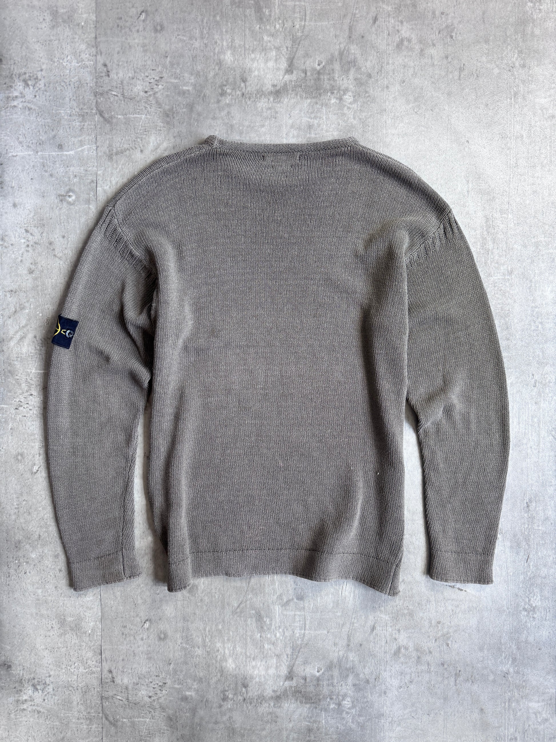 From the Spring/Summer 1997 collection, this Stone Island knit sweater is a strong example of the brand’s mid-90s exploration of knitwear and garment dyeing. Constructed from cotton yarn in a washed olive tone, the piece has undergone Stone Island’s signature garment-dyeing process, resulting in subtle tonal variations and a lived-in aesthetic unique to each garment. The sweater features a classic crew neckline, ribbed cuffs and hem, and the removable Stone Island compass badge at the sleeve. Lightweight yet substantial, it reflects the brand’s ability to fuse utilitarian identity with casual wearability.