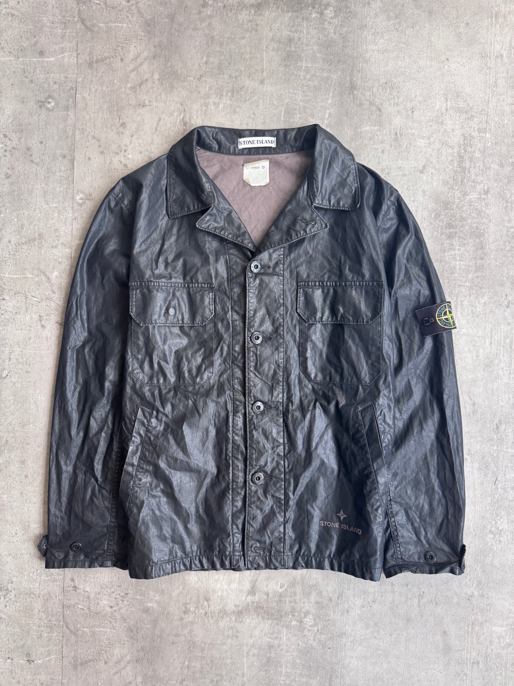 An archival Stone Island Spalmatura overshirt from Spring/Summer 1999, constructed from a lightweight wax-coated cotton. The Spalmatura fabric treatment — a signature of Stone Island’s early textile innovation — gives this piece a distinct crinkled, semi-gloss finish with a weathered, industrial character. Designed with the brand’s trademark functionality and material mastery, this overshirt perfectly balances utility and understated luxury.