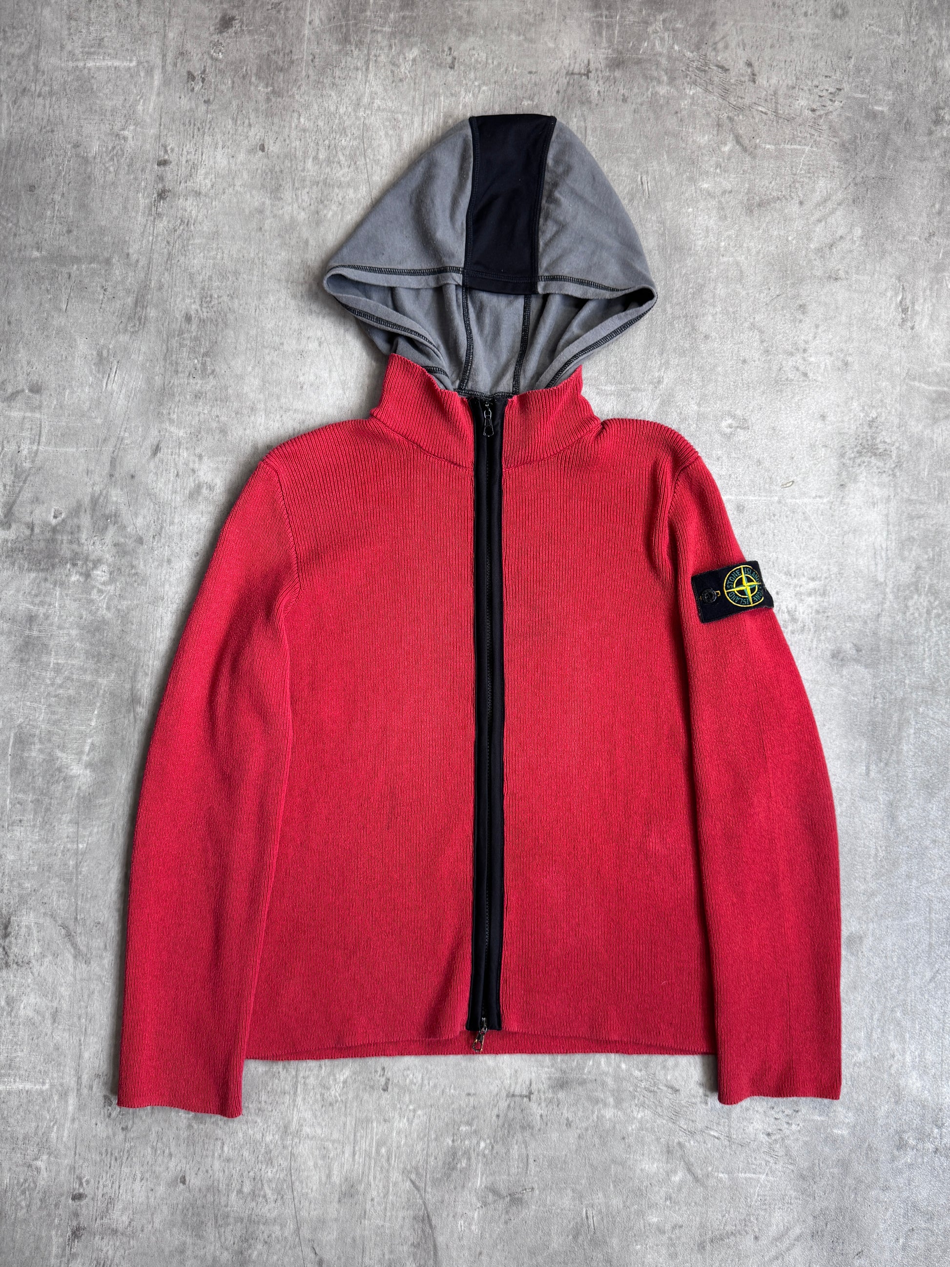 A standout piece from Stone Island’s Spring/Summer 2004 collection, this red knit zip-up perfectly blends casual comfort with the label’s experimental fabric innovation. Constructed from a lightweight cotton knit, it features a contrast grey and navy hood and the brand’s iconic detachable compass patch on the sleeve — a symbol of technical mastery and design precision.