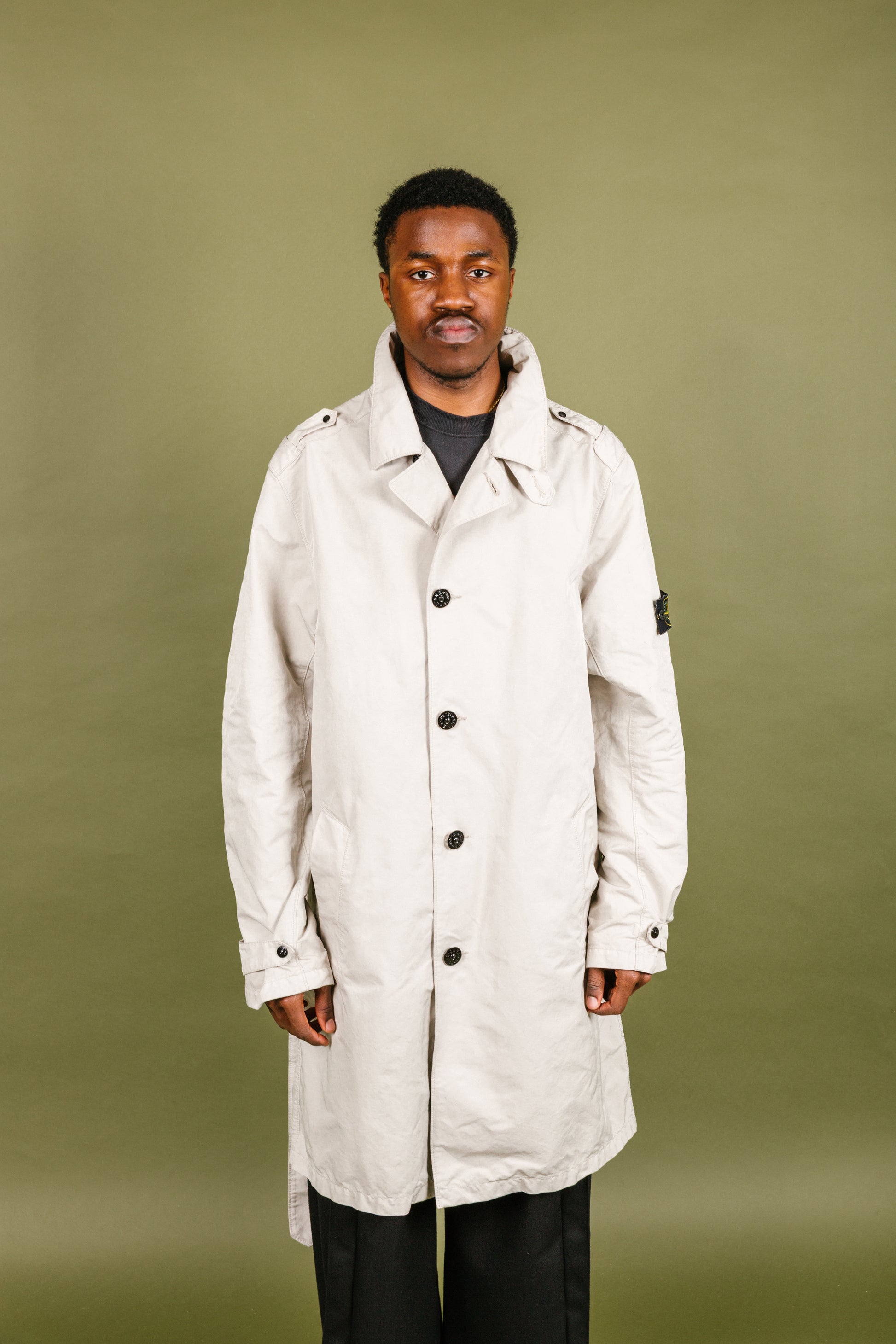 Designed in a classic trench silhouette, it features a double-breasted front, storm flap detailing, and a removable waist belt to shape the fit. Equal parts functional and collectible, it’s a perfect transitional coat that brings Stone Island’s technical heritage into a timeless outerwear format.