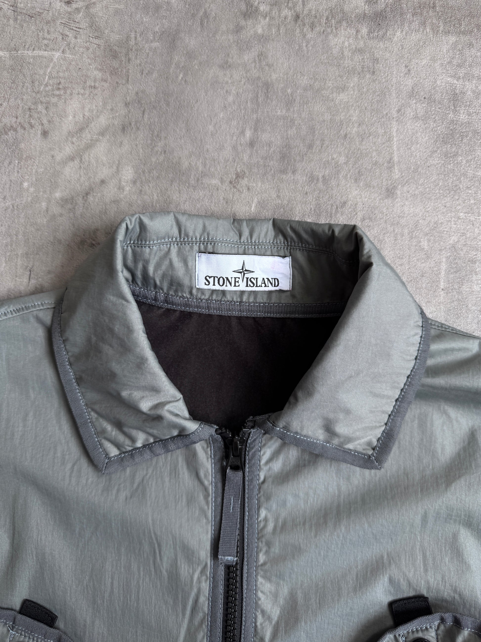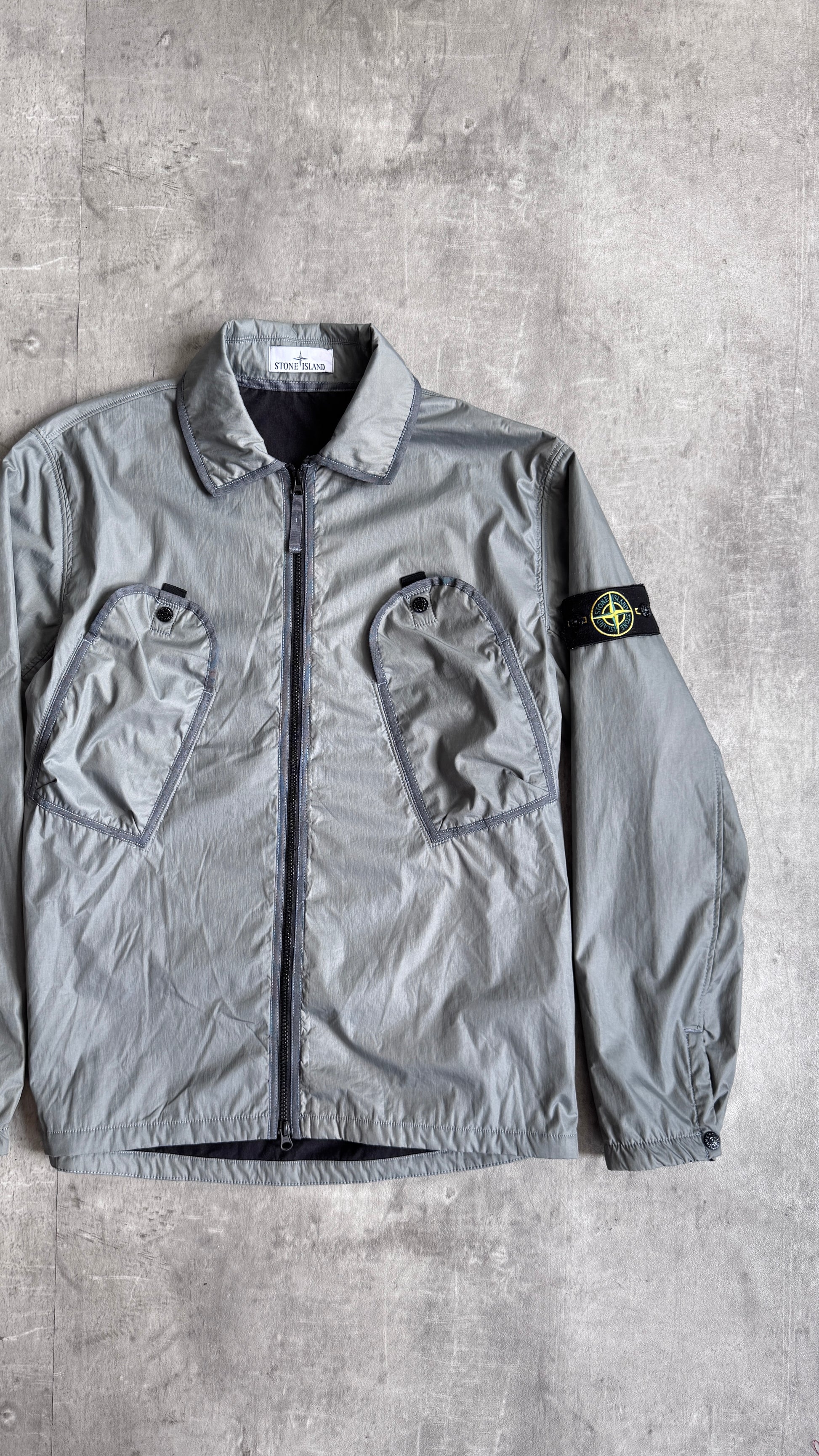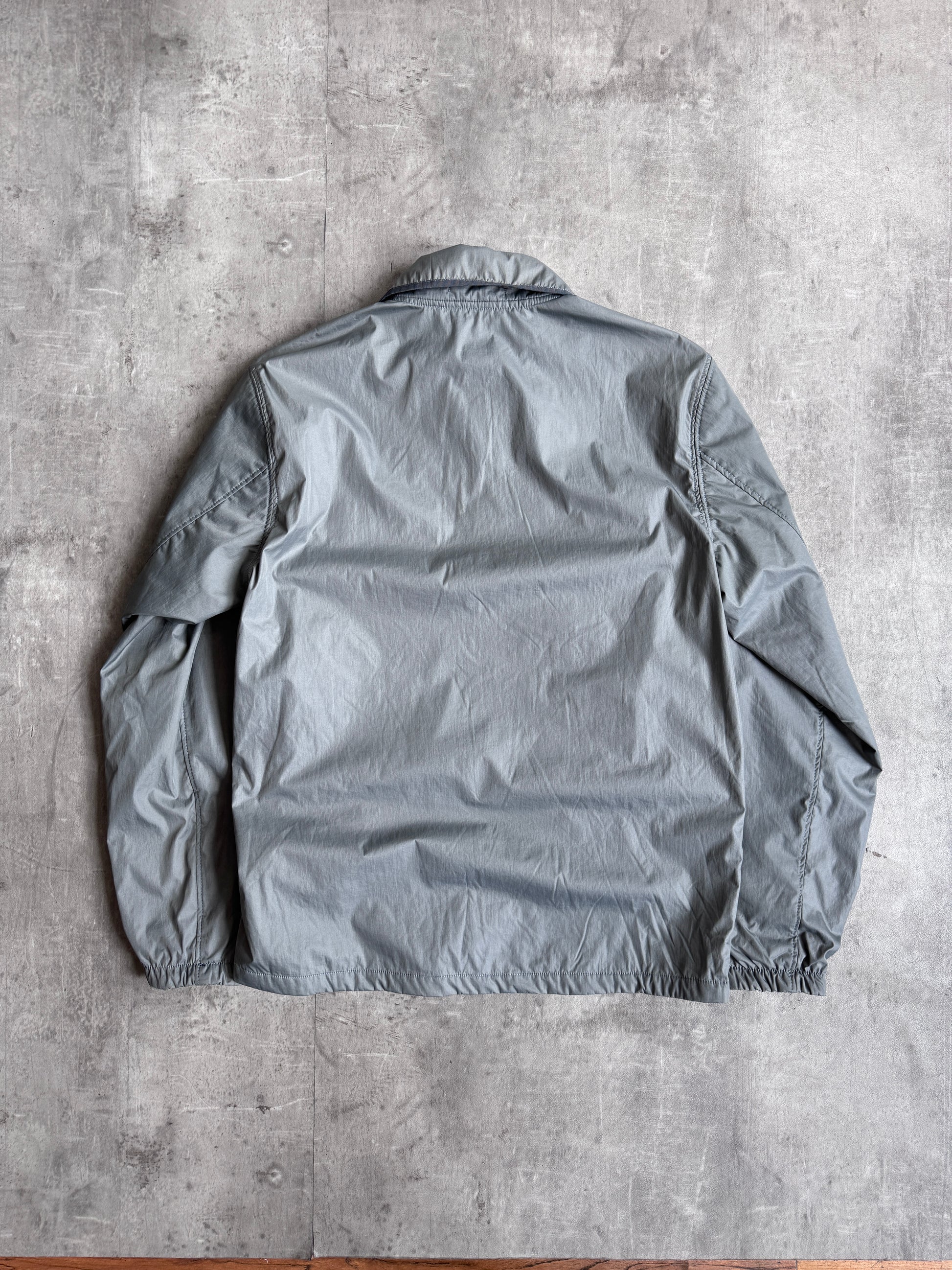 From Stone Island’s Spring/Summer 2019 collection, this overshirt is crafted from the brand’s innovative Lamy Flock fabric — a lightweight, translucent nylon tela bonded to a soft flock backing. The result is a technical piece that combines an iridescent sheen with a subtle suede-like interior texture. Finished with two distinctive angled chest pockets and the signature compass badge on the sleeve, this overshirt embodies Stone Island’s commitment to material experimentation and utilitarian design.