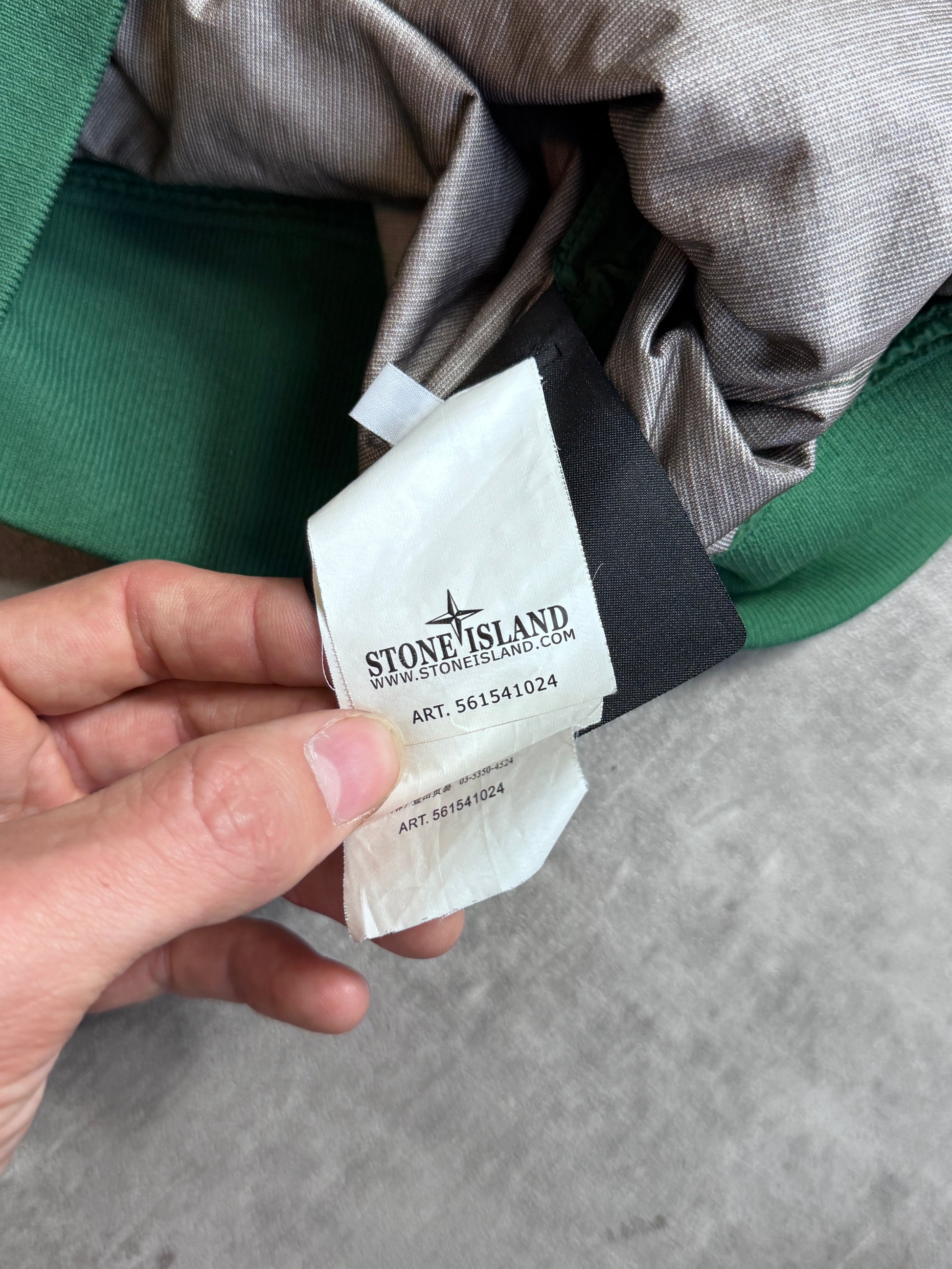 The garment-dyeing process gives the fabric a unique tonal depth, subtly enhancing its metallic sheen. Design details include a ribbed bomber collar, two-way zip fastening, angled front pockets, and the detachable Stone Island compass badge on the sleeve. This piece exemplifies Stone Island’s precision in blending utility, innovation, and effortless style.