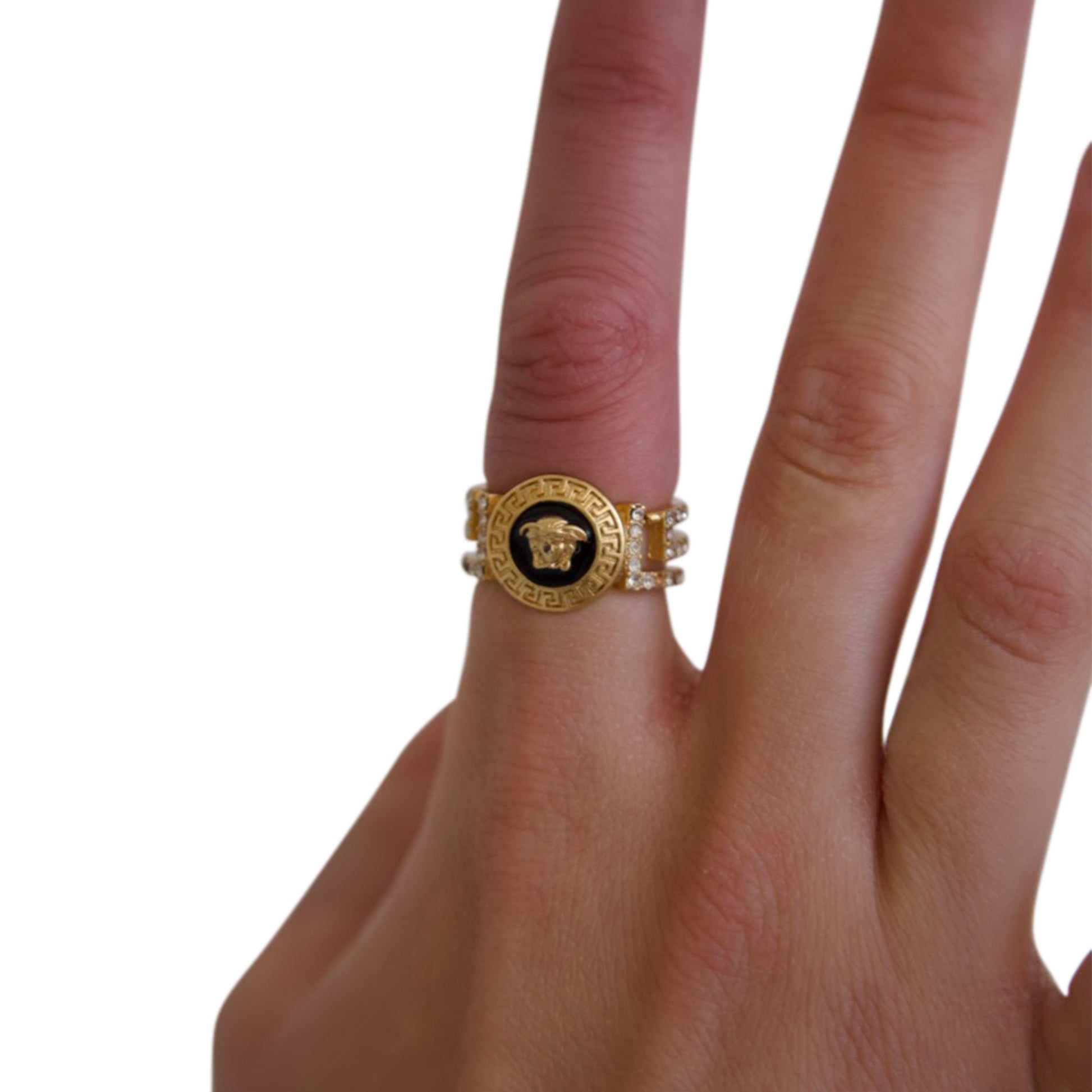 A bold and iconic piece from Versace, this vintage ring captures the house’s unmistakable opulence. Crafted in polished gold-tone metal, the design features a striking black onyx centerpiece inlaid with the legendary Medusa head motif, framed by the signature Greek key border.