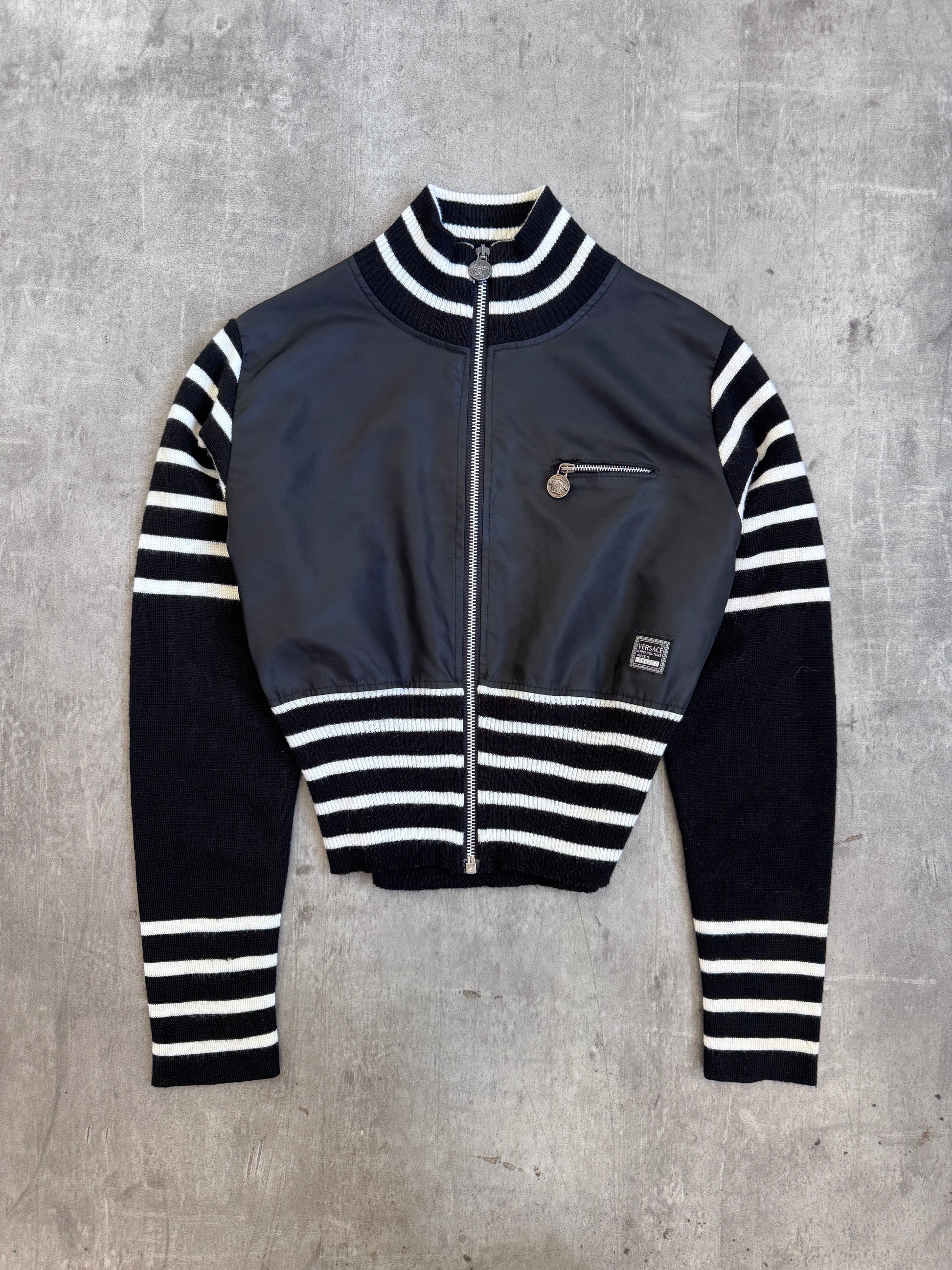 A standout fusion piece from Versace Jeans Couture, combining structured outerwear with soft knit detailing. This cropped jacket delivers bold designer energy while maintaining a wearable, modern silhouette.