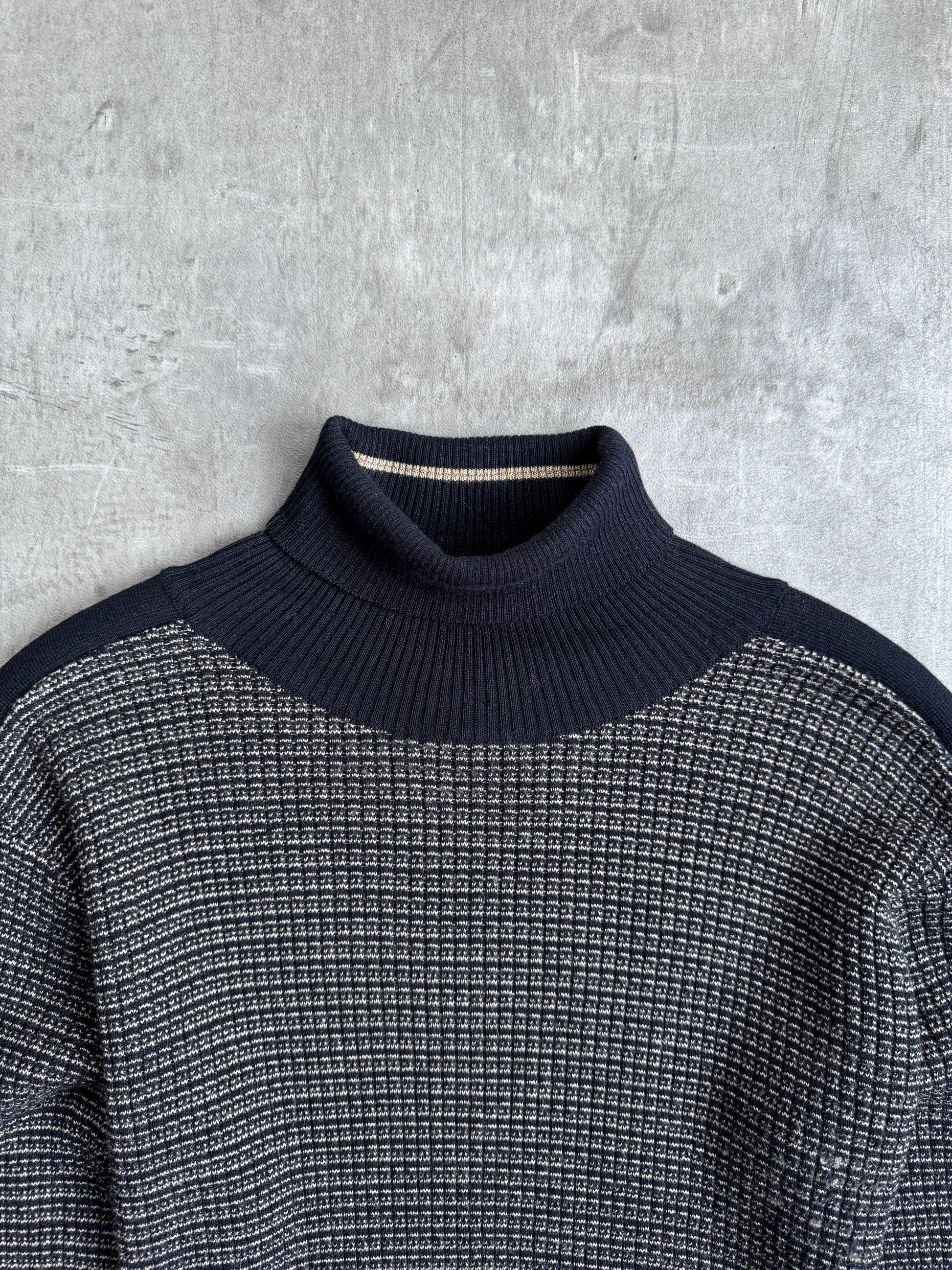 A refined and understated Versace knit, blending luxury craftsmanship with a minimalist aesthetic. This two-tone ribbed turtleneck features a contrasting textured knit body and smooth ribbed trims, offering structure and comfort. The subtle contrast detailing along the hem and cuffs adds a signature touch of Italian sophistication, while the fitted silhouette and high neck create a sleek, timeless look.